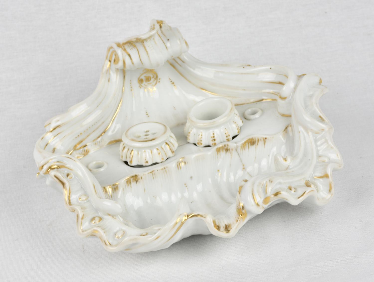 CALAMAIO IN PORCELLANA a forma di foglia dipinta con bordature dorate Italia,...