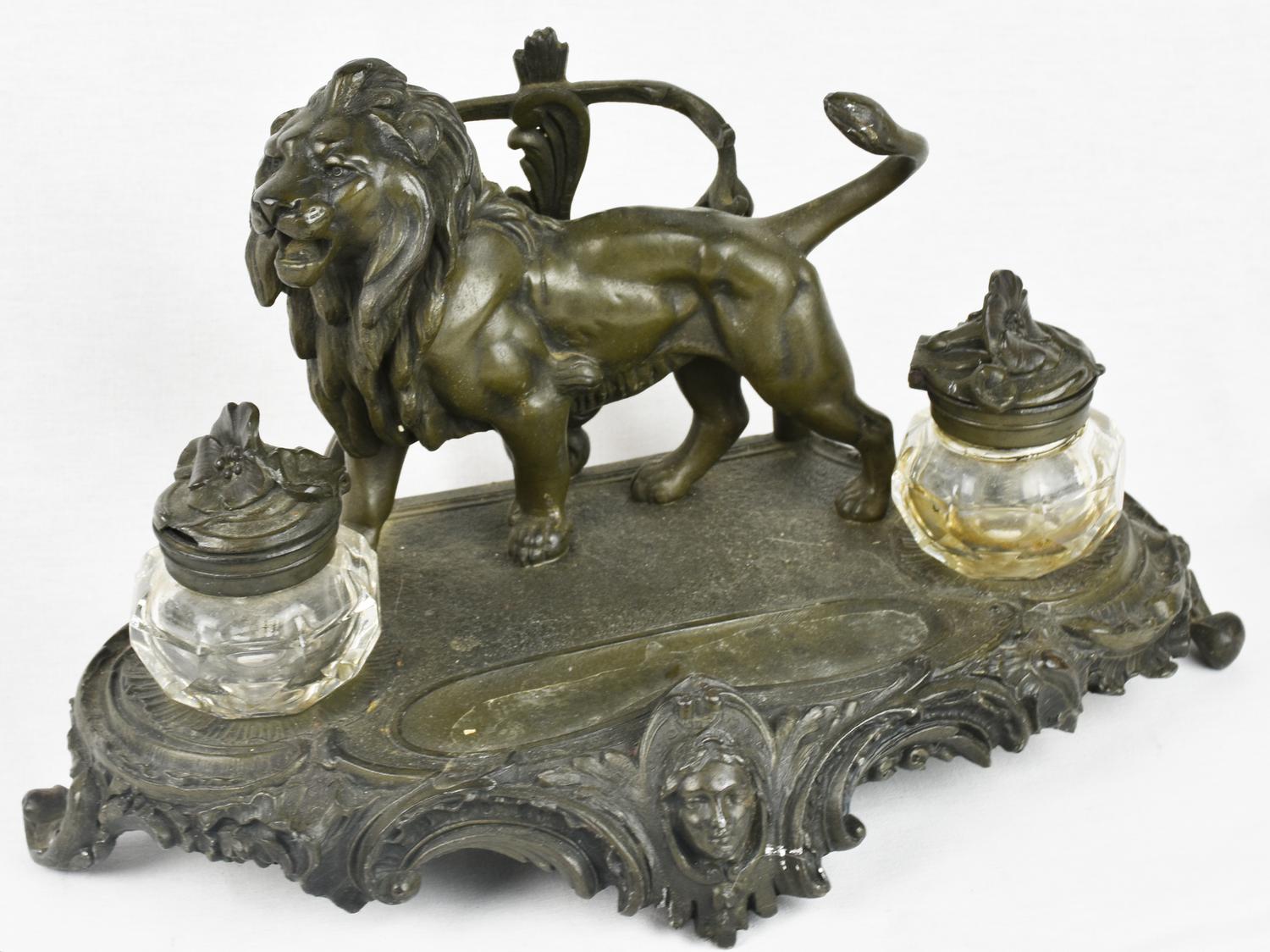 CALAMAIO IN ANTIMONIO Decorato con leone ruggente, volute e mascherone...