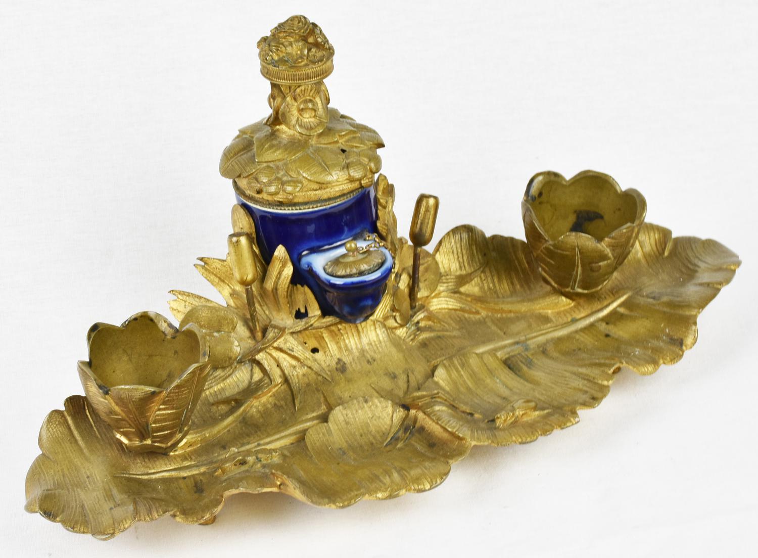 CALAMAIO IN BRONZO con fontana in porcellana dipinta in blu Francia, prima...