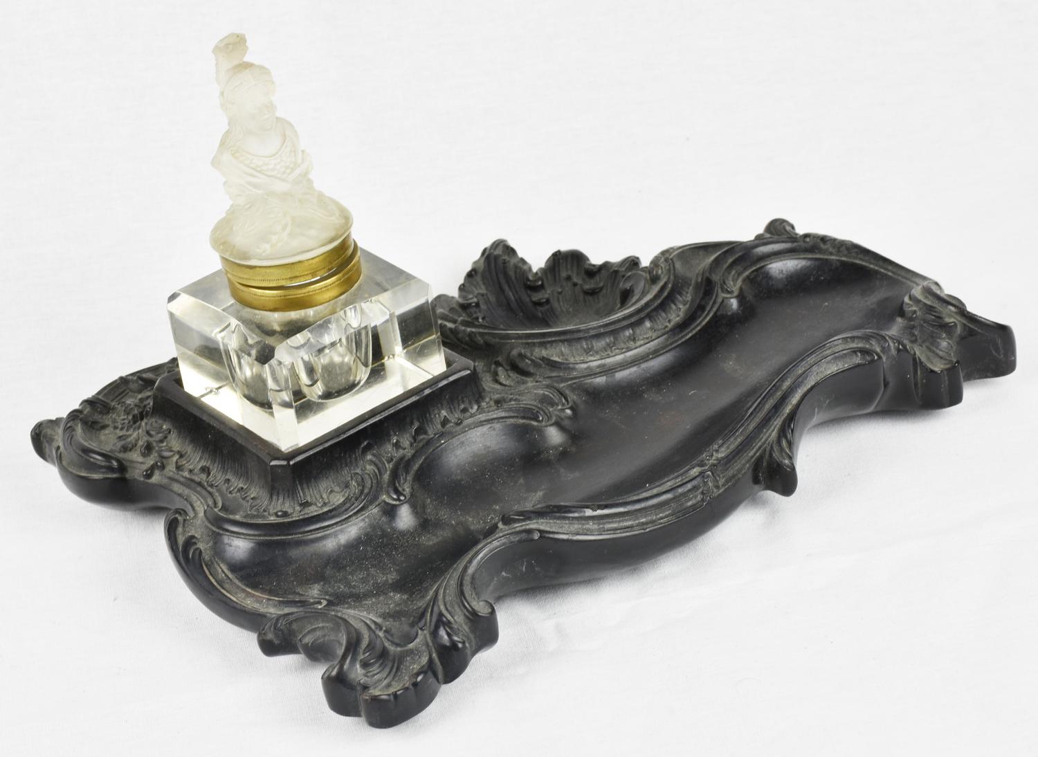 CALAMAIO IN GOMMALACCA nera con porta inchiostro in vetro con coperchio in...