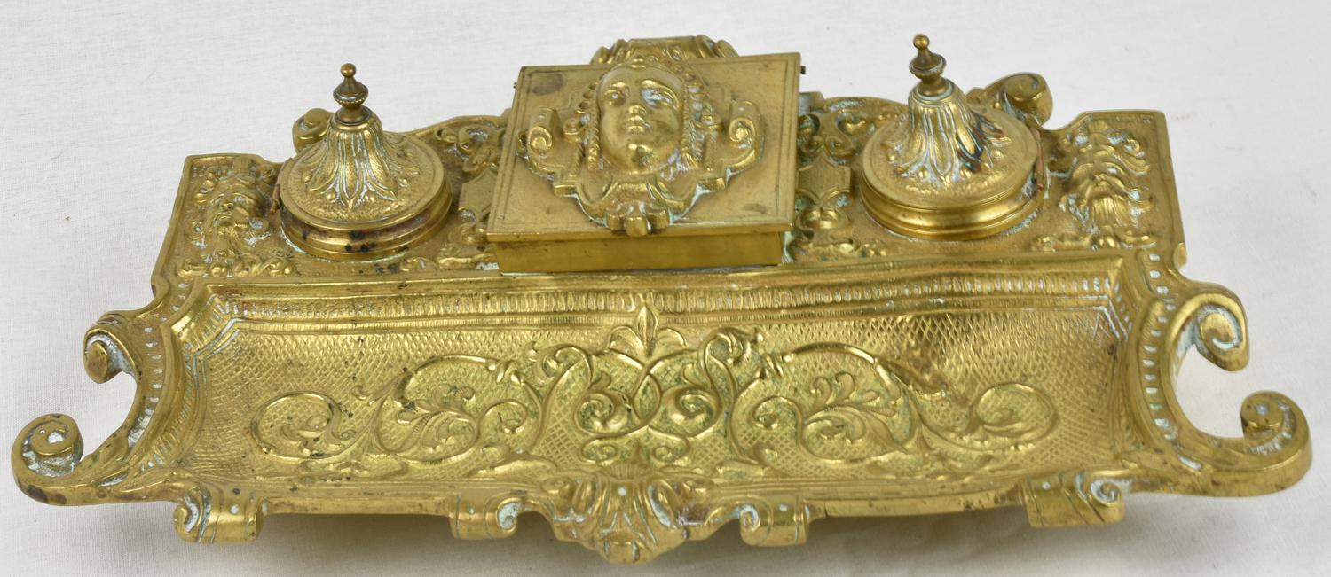 CALAMAIO IN BRONZO DORATO finemente decorato e cesellato con mascheroni e...