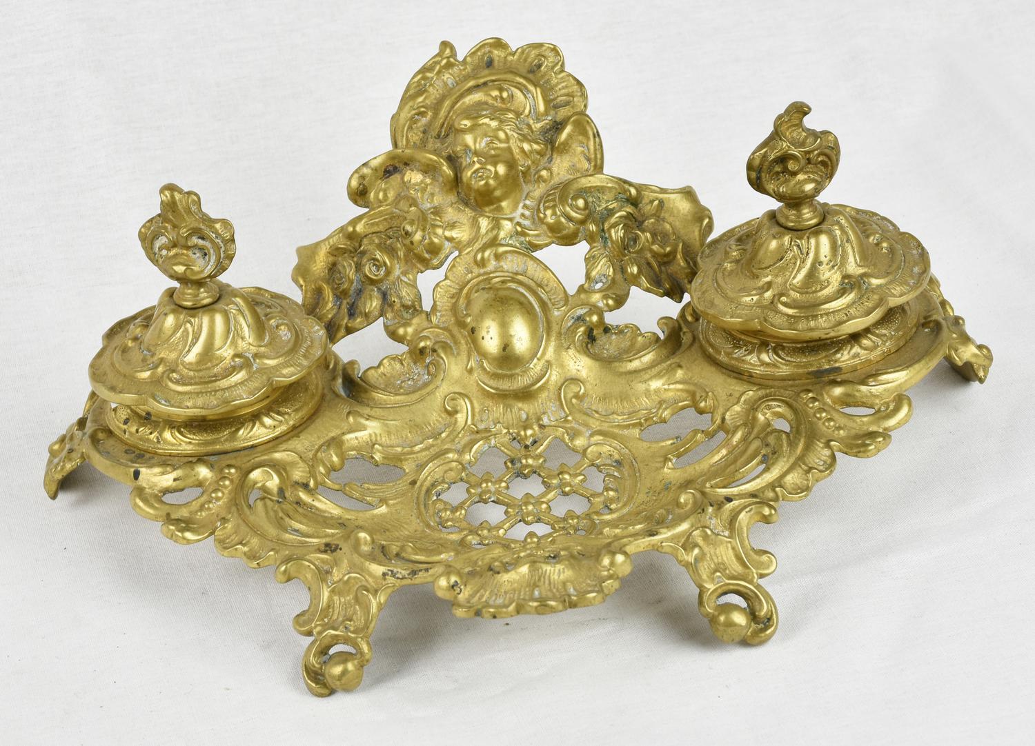 CALAMAIO IN BRONZO DORATO finemente decorato a volute e mascherone Francia,...