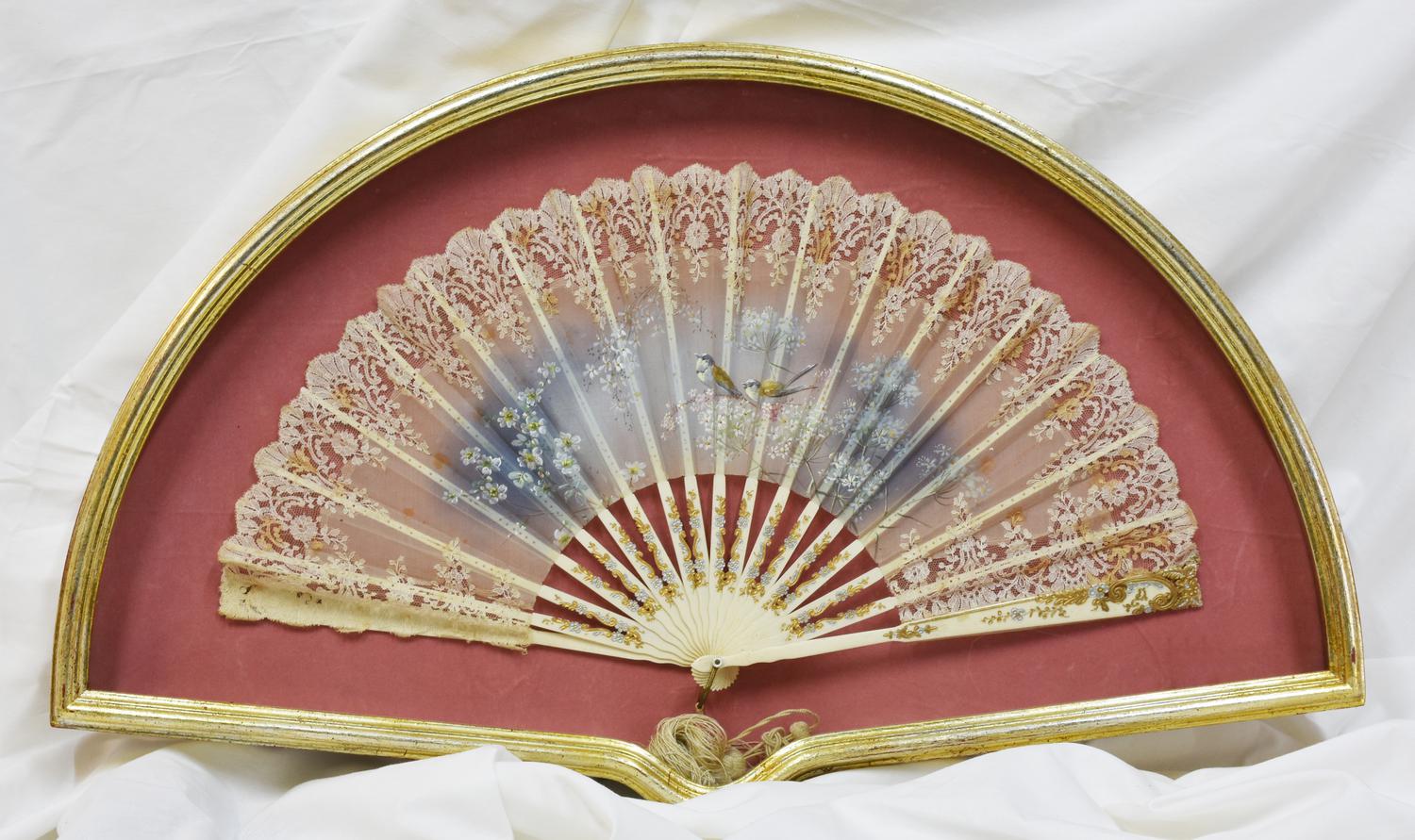 VENTAGLIO in pizzo dipinto Francia, ultimo quarto XIX secolo cm 56x30 Lievi...