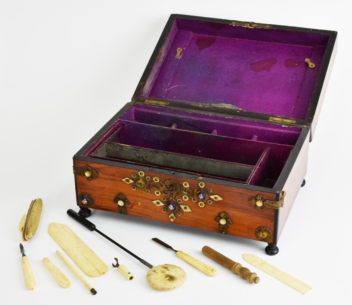 in boise de rose, con applicazioni in bronzo dorato, porcellana e madreperla. All'interno vari scomparti con piccoli strumenti in osso