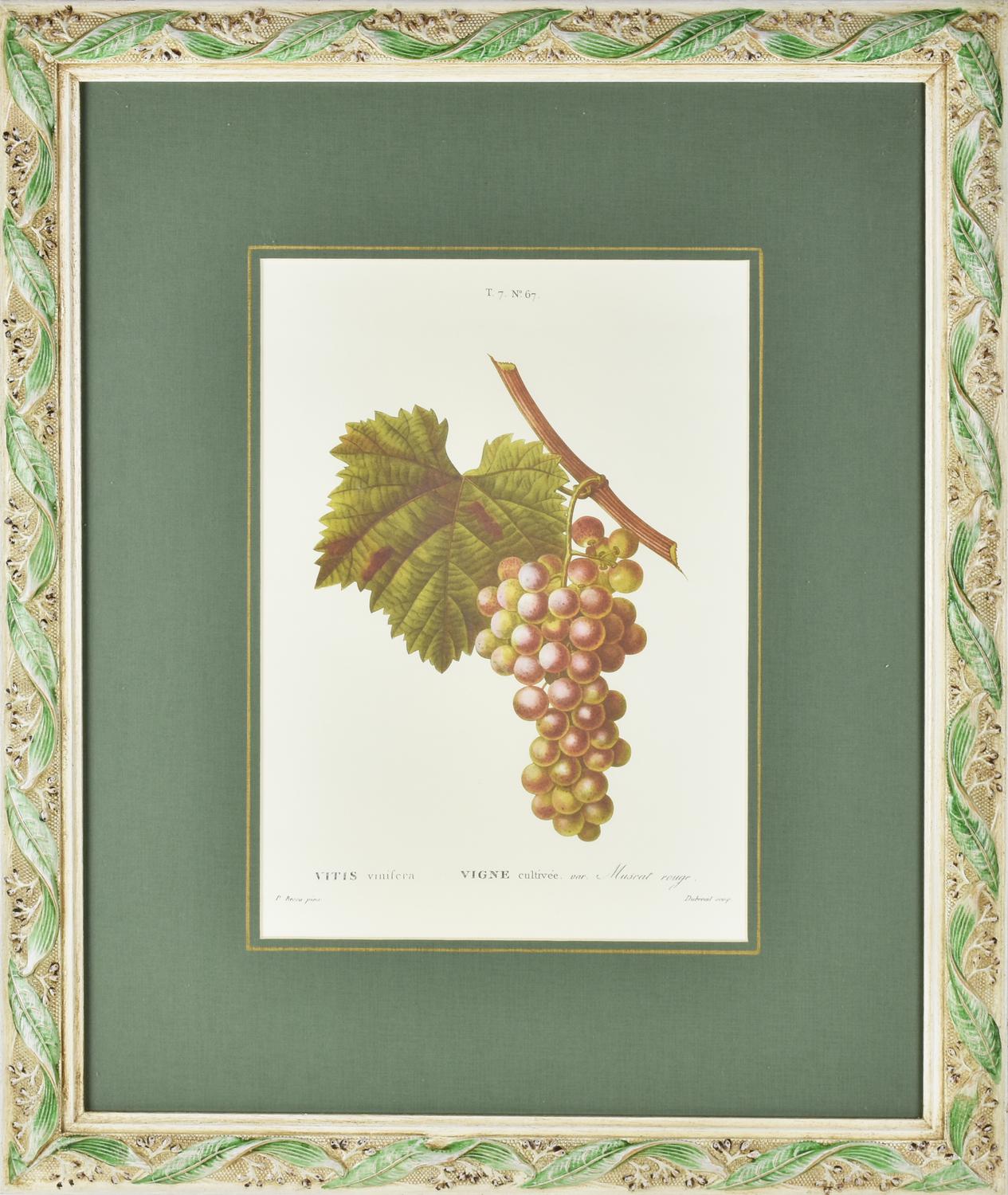 raffigurante Vitis Vinifera, da un'incisione antica a firma P. Bessa e Dubreal entro cornice in legno scolpito e laccato