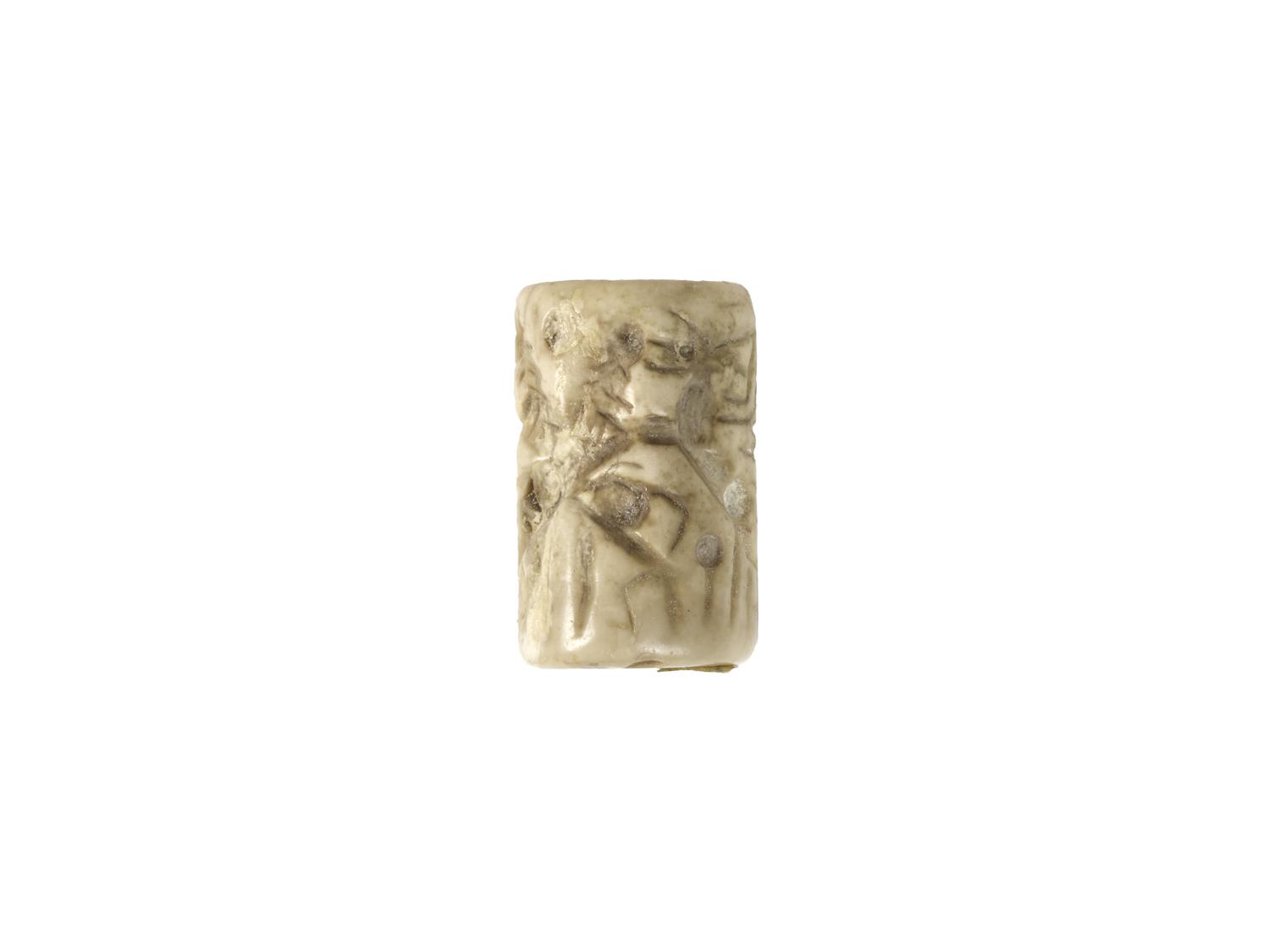 Sigillo cilindrico sumero con incisa la rappresentazione di una scena di lotta tra animali affrontati e l'intervento di due eroi armati