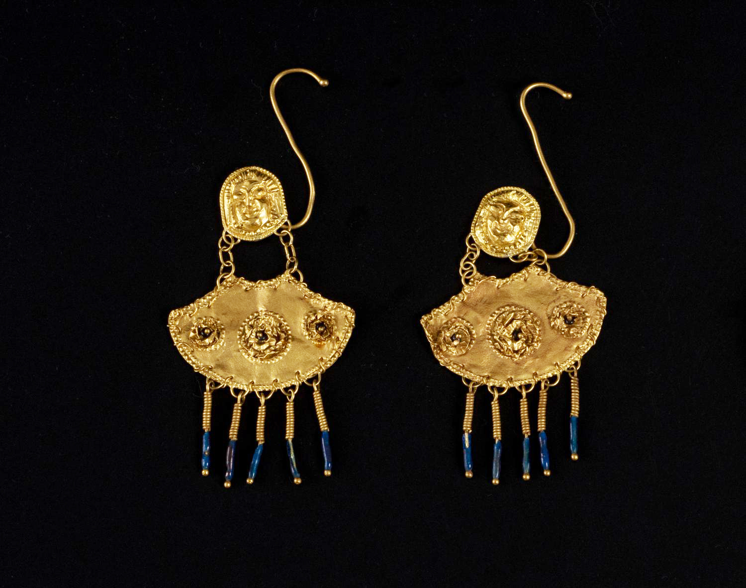 Paio di orecchini in oro modellati a pelta sospesa tramite catenelle ad un gorgoneion stilizzato, decorata da tre rosette in rilievo e con quattro pendenti ritorti con pasta vitrea blu nella parte inferiore.