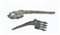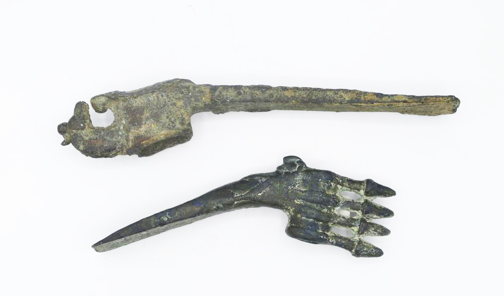 Tre piccole asce con immanicatura a cannone e lama trapezoidale con taglio arrotondato; una decorata con protome di ariete e quattro apofisi coniche; l'altra con protome di cavallo. (2)