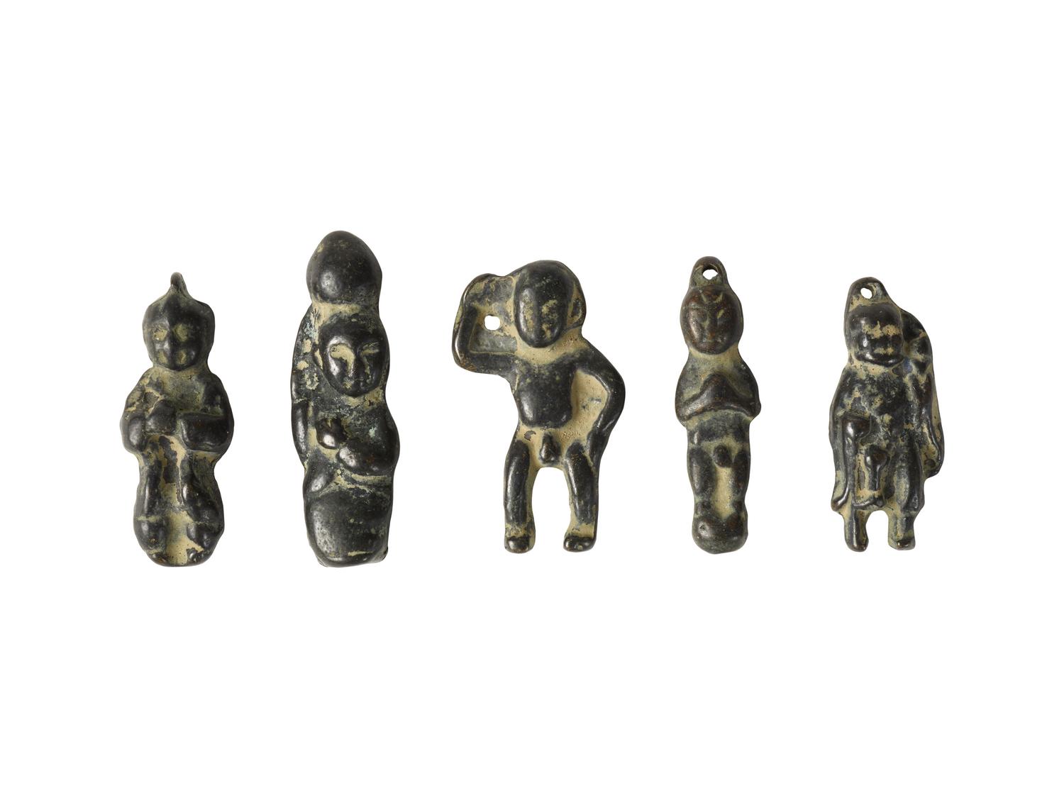 Quattro statuette raffiguranti Budda in vari atteggiamenti, di cui tre con appiccagnolo sulla testa per essere utilizzate come ciondolo ed una raffigurante un uomo nudo col braccio destro sollevato (5)