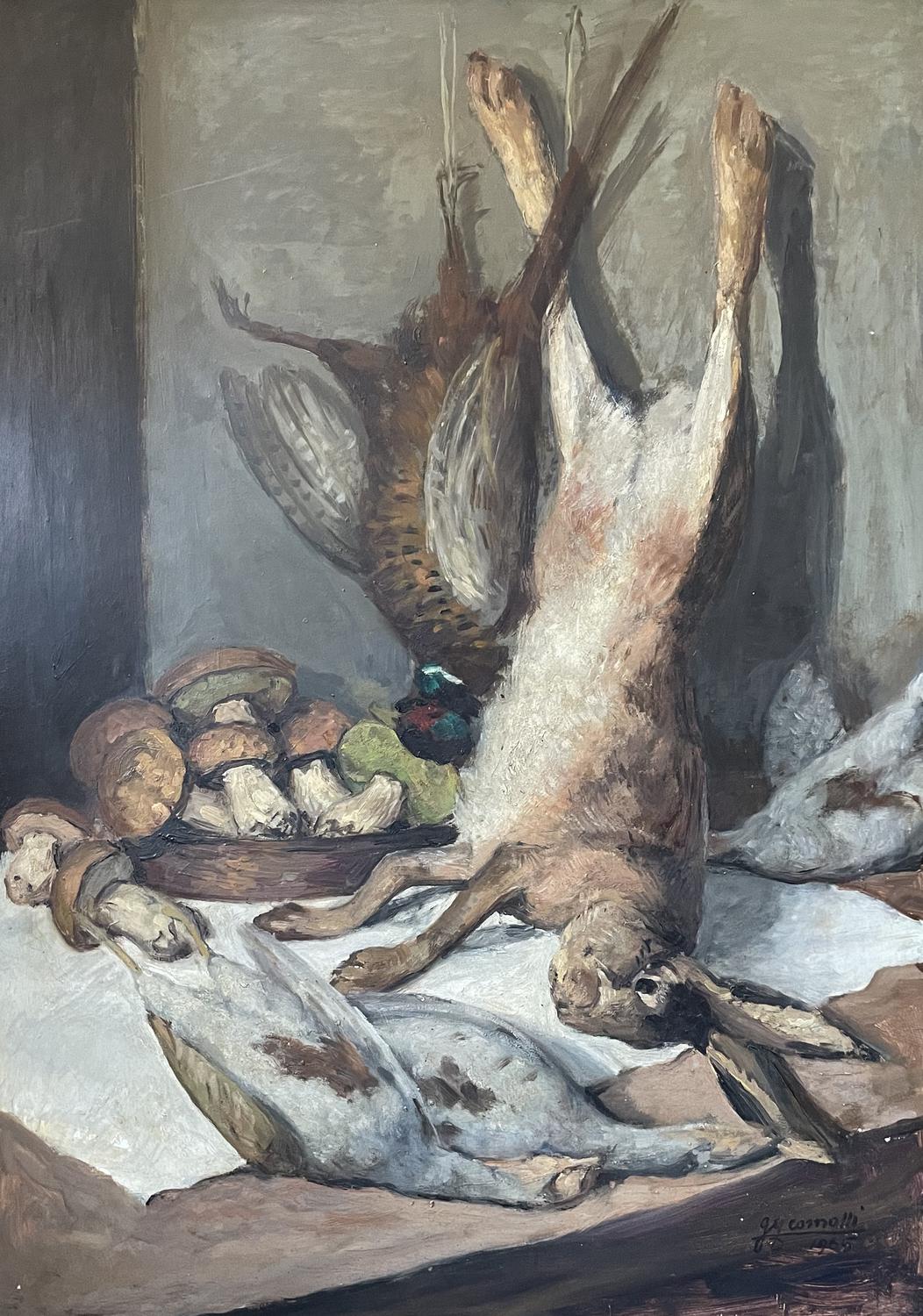Luigi Comolli NATURA MORTA CON CACCIAGIONE E FUNGHI olio su faesite, cm...