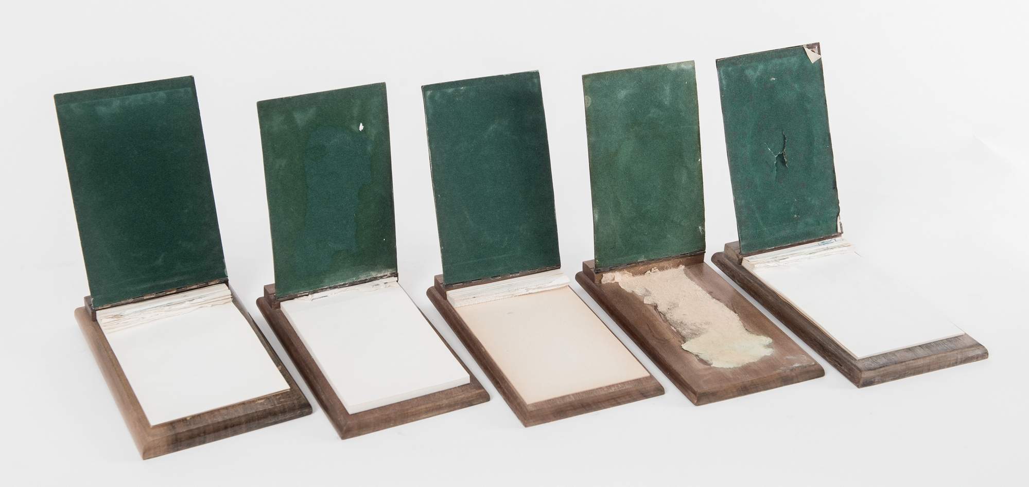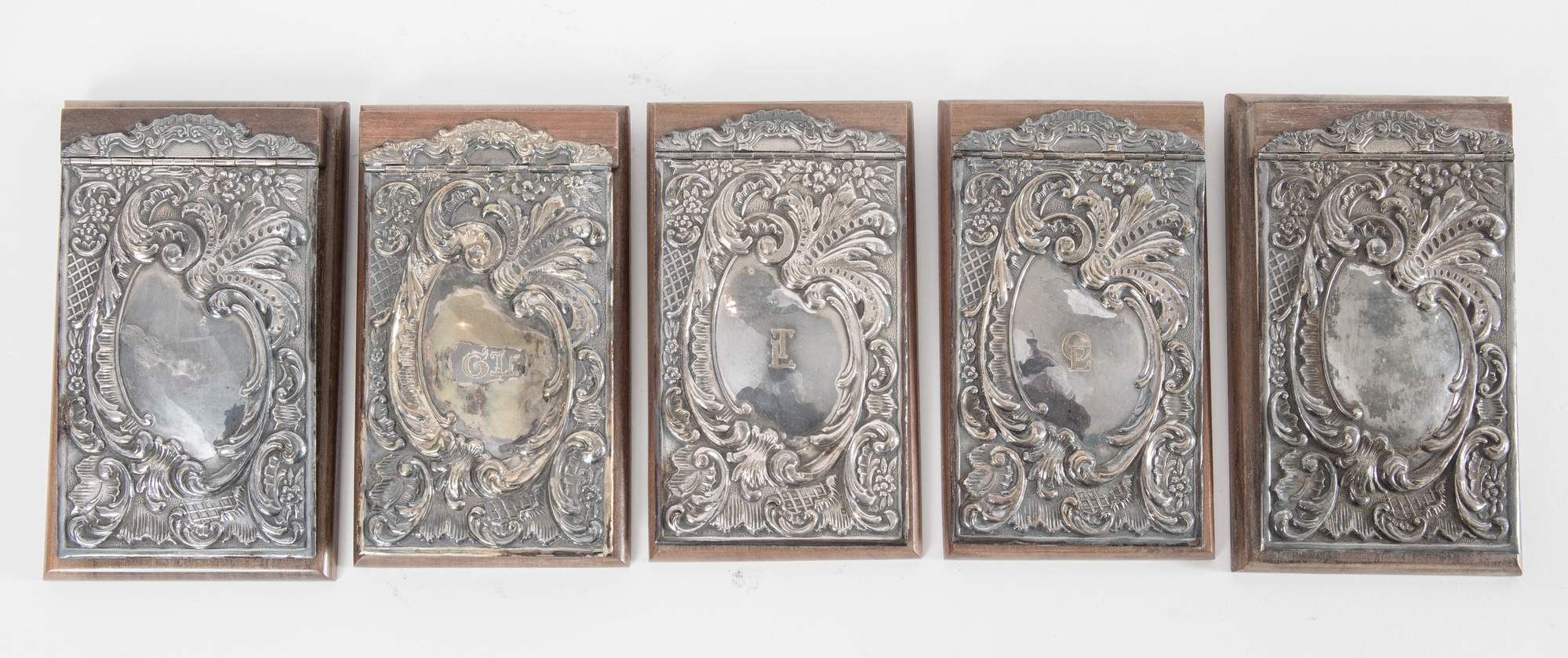 Lotto composto da cinque taccuini in legno e lamina argentata. Ciascuno di cm 19,8x11,3.