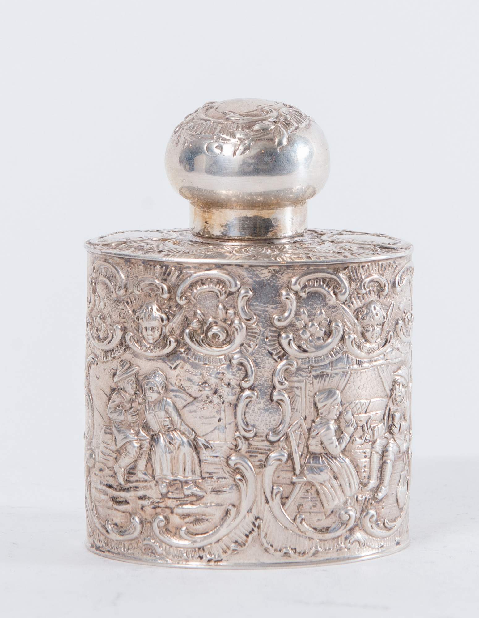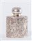 Boccetta in argento 800. Sotto la base reca punzoni: 800, stemma e uno illeggibile. Peso: 172 gr. Cm 10,8x8x6.