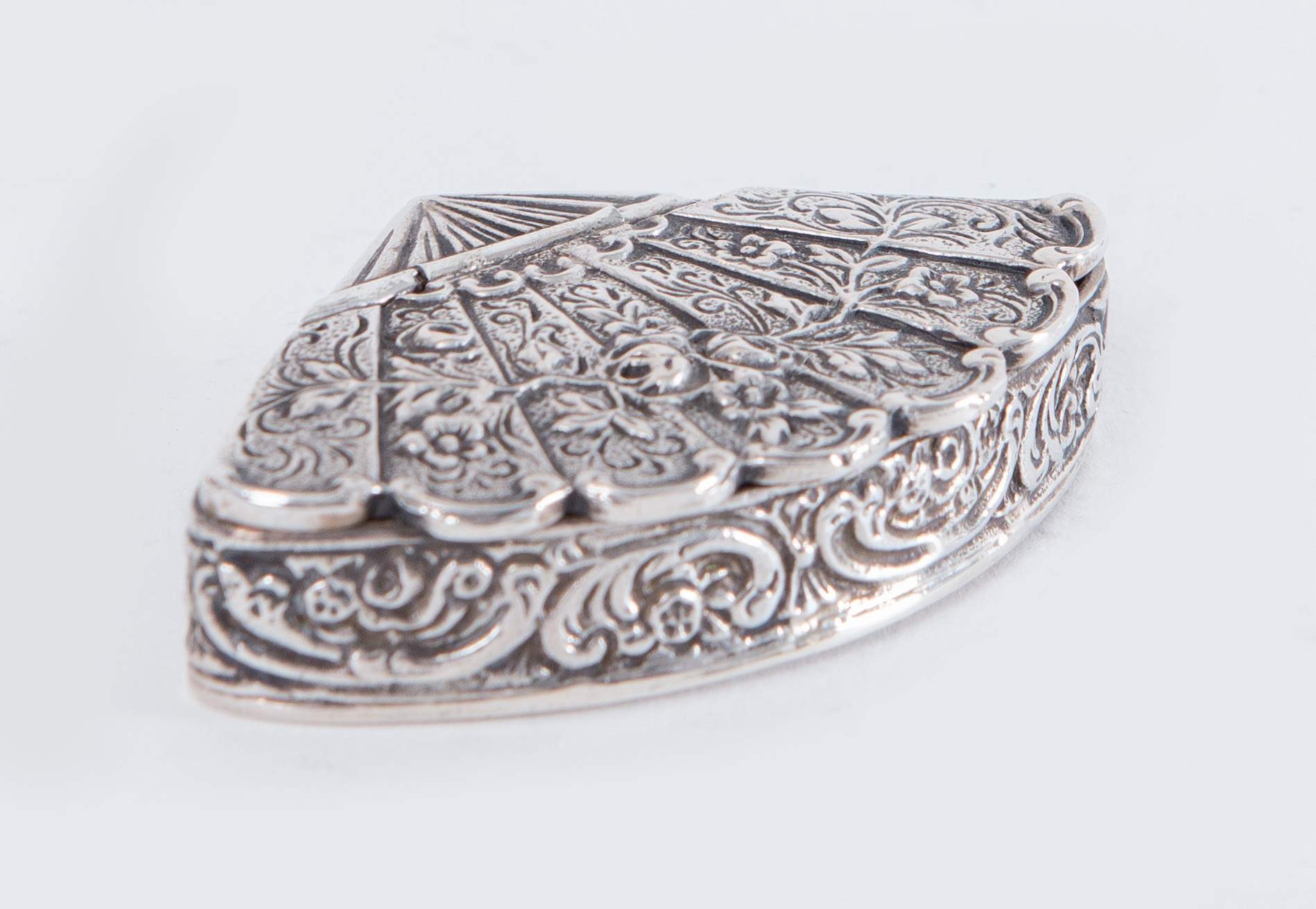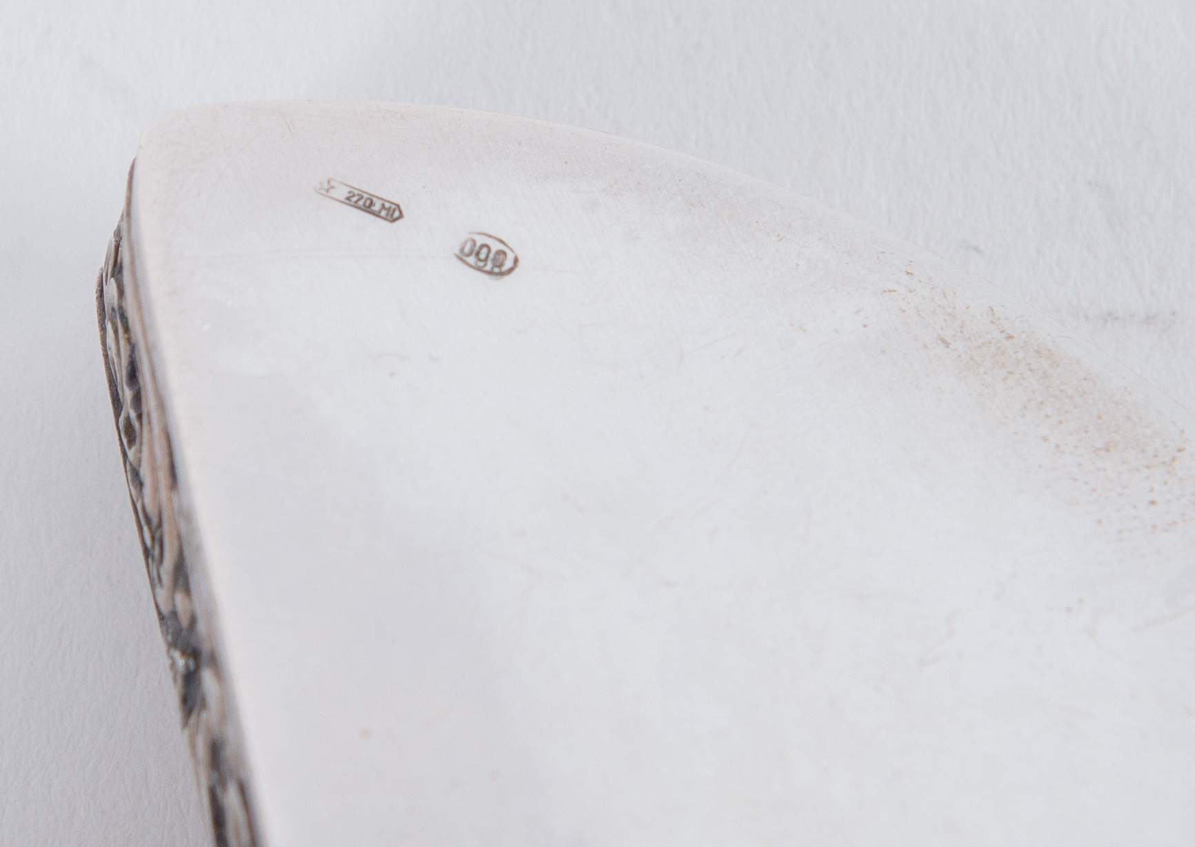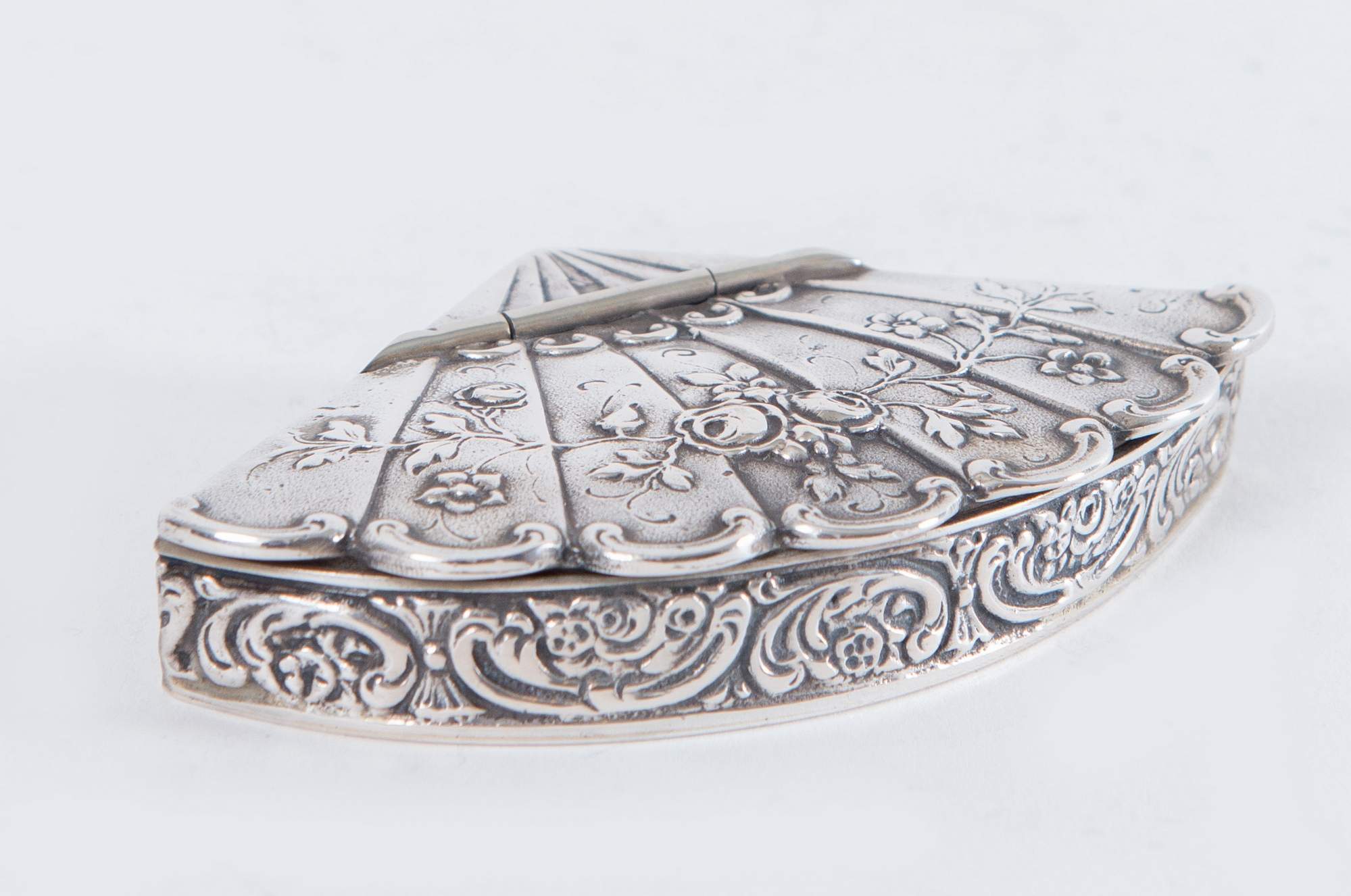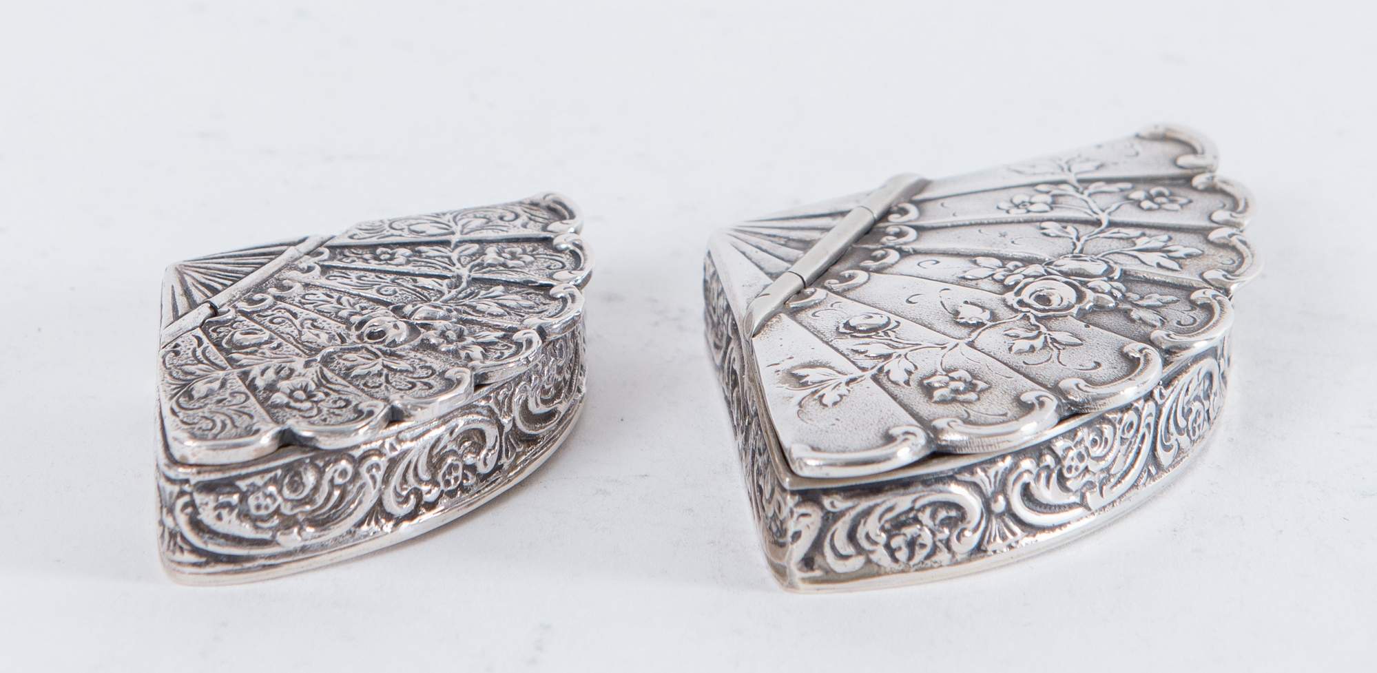 Lotto composto da due scatoline in argento 800 a forma di ventaglio. 1. MENEGATTI F.LLI S.d.f., Italia. Scatola in argento 800 a forma di ventaglio. Sotto la base reca punzoni: 800 e losanga locativa 54VI. Peso: 46 gr. Cm 1,5x7x4. 2. Scatola in argento 800 a forma di ventaglio. Sotto la base reca punzoni: 800 e losanga locativa 270MI. Peso: 74 gr. Cm 8,5x5,5.