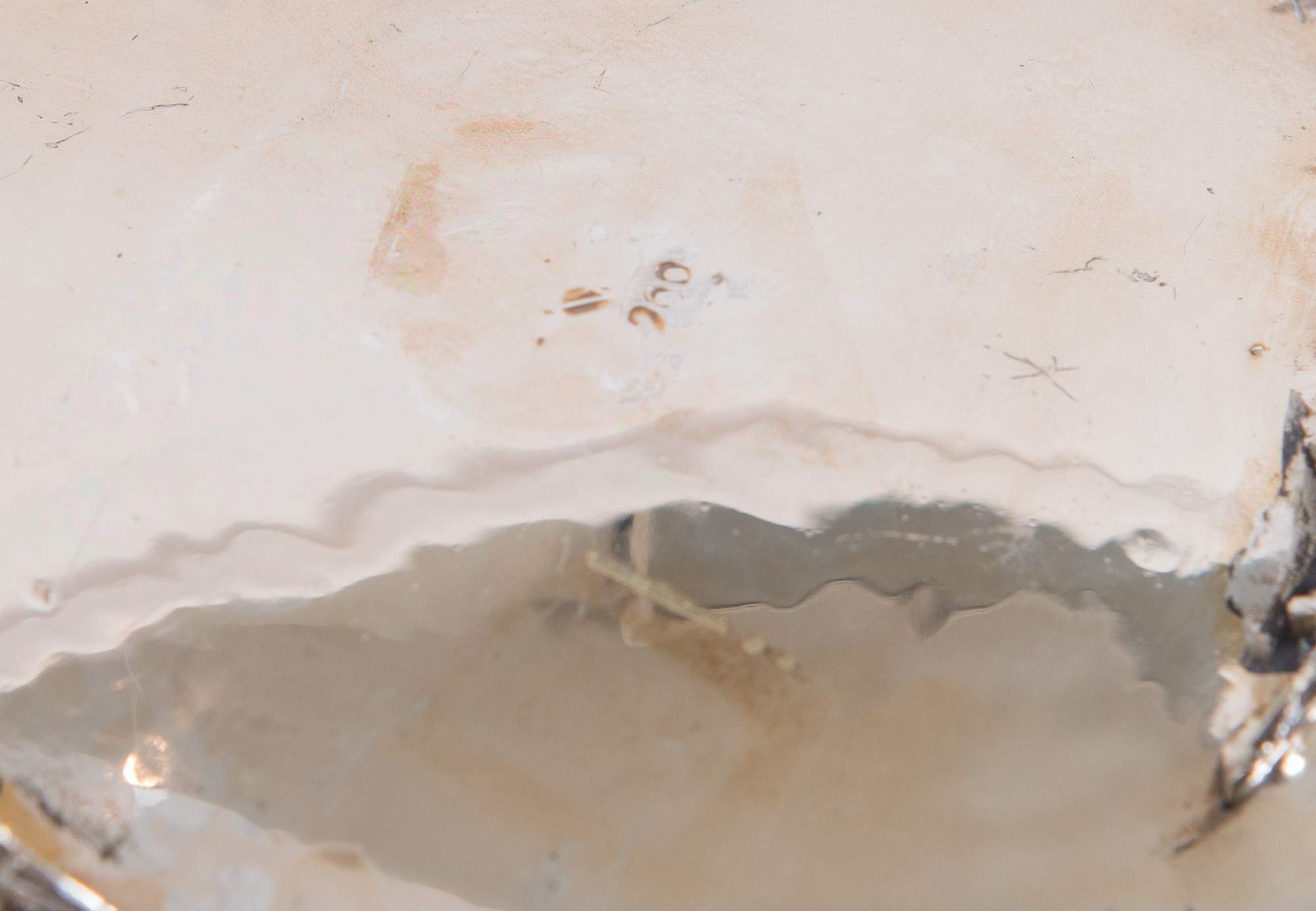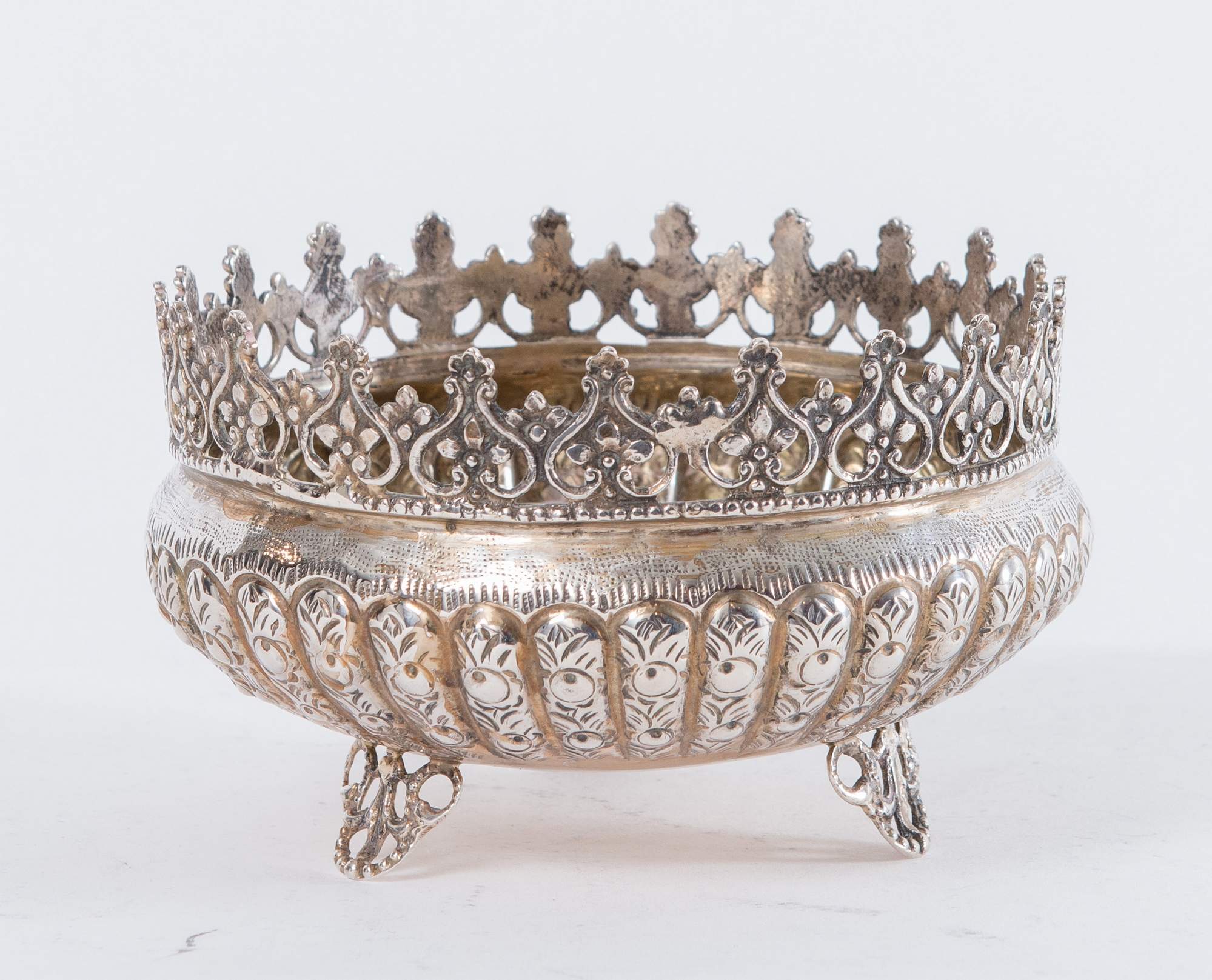 CESTINA Realizzata in argento 800 sbalzato e bucellato con corona alla sommità. Reca punzoni parzialmente leggibili. Peso: 246 gr. H. Cm 9; Ø Cm 14.