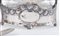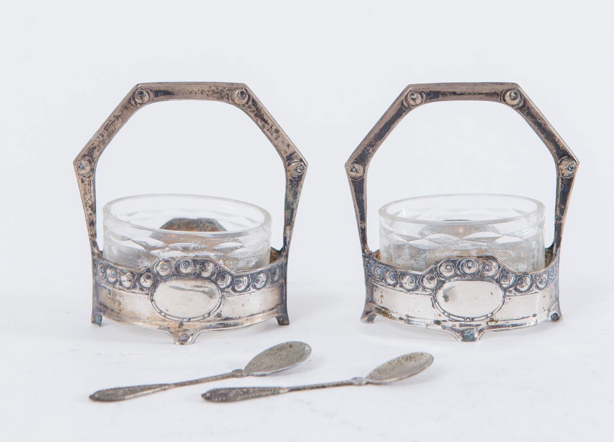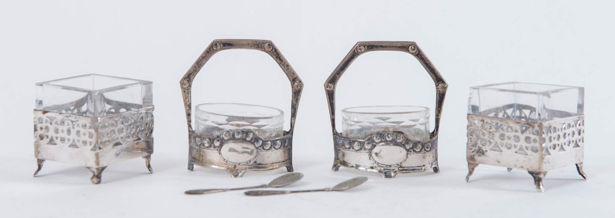 Lotto composto da due ciotoline e due saliere in vetro con supporti in argento 800, due cucchiaini e porta oggetti in vetro con supporto in argento 800. Recano punzoni sotto la base: 800. Saliere: cm 7x6x4; ciotoline: cm 4x4x4.