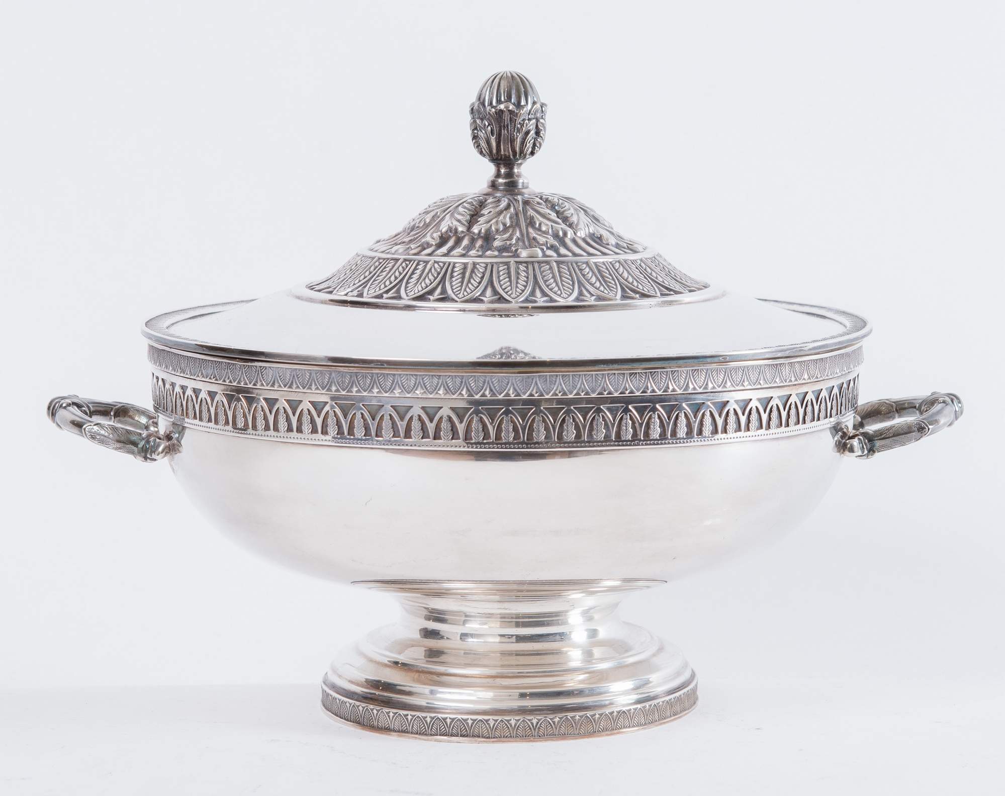 Argentiere bolognese, XX secolo. Zuppiera con coperchio in argento 800. Reca punzoni al retro del coperchio: 800 e locativa bolognese bolognese. H cm 28; Ø cm 36. Peso: 1843 gr.