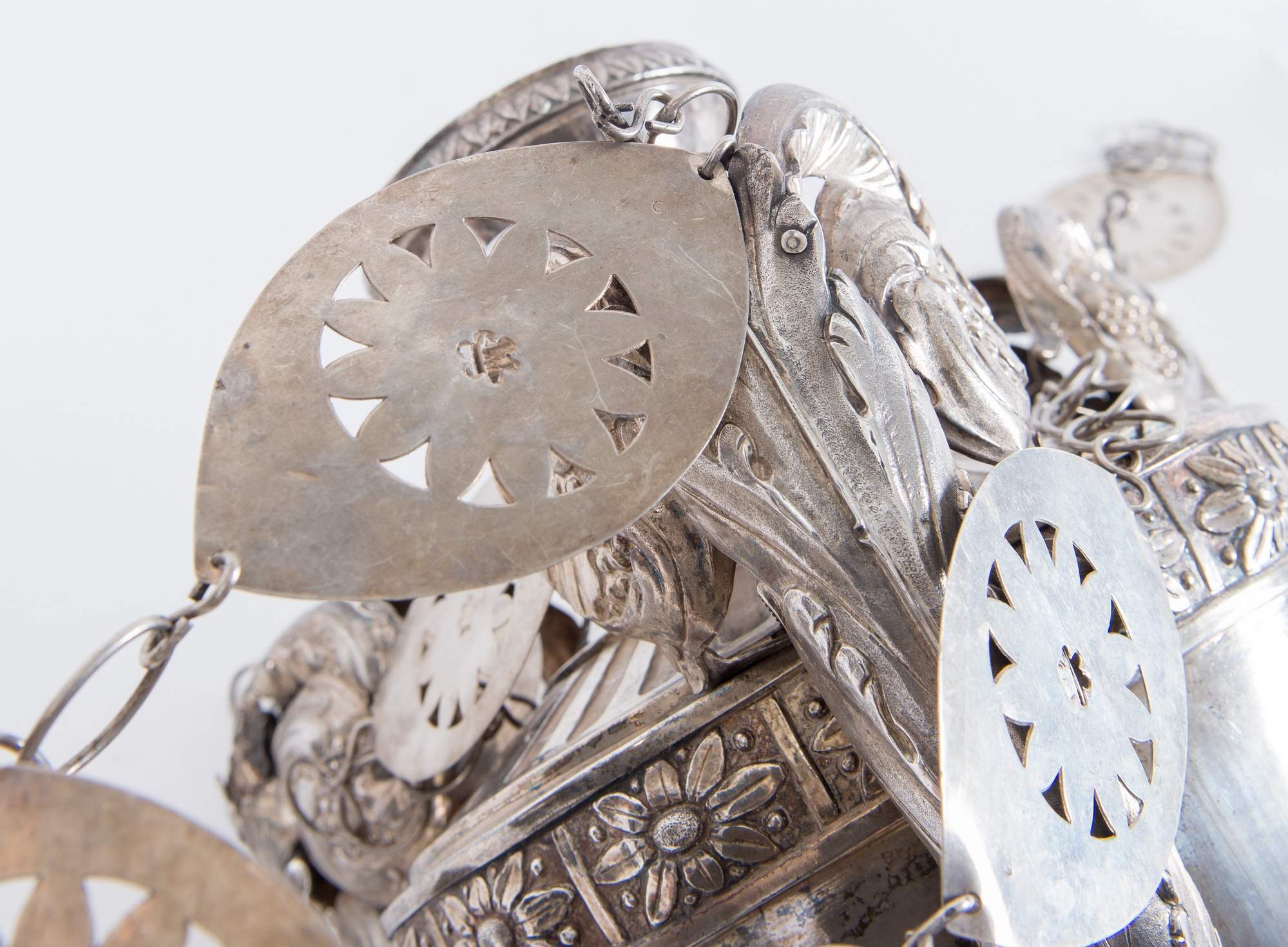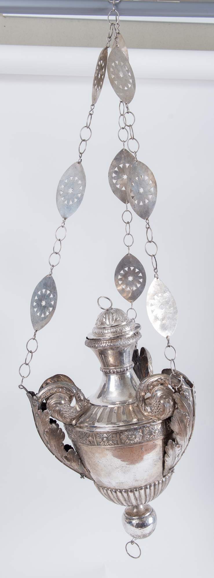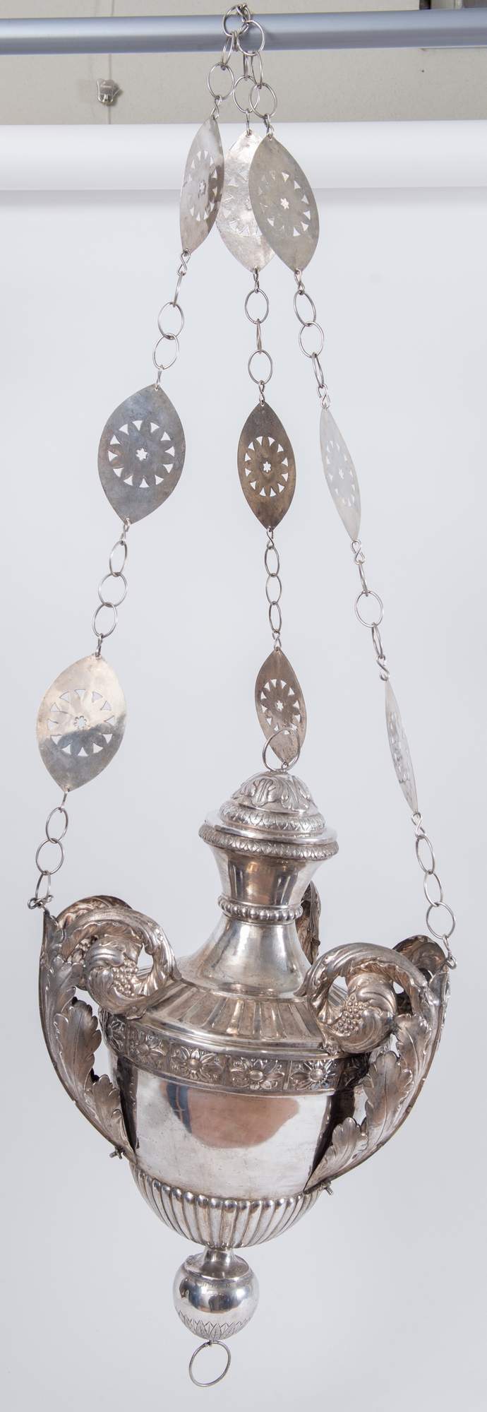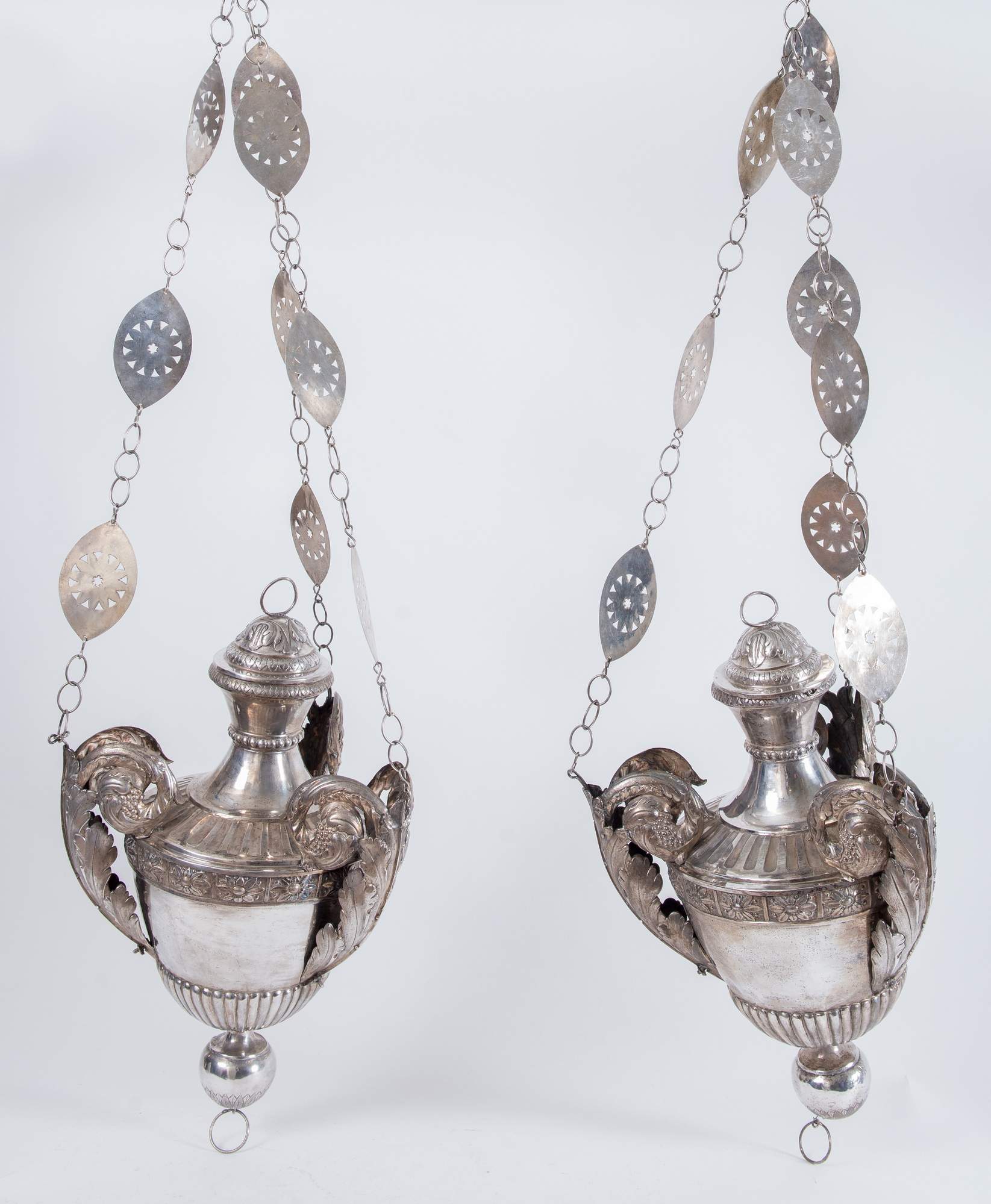 Genova, 1824/1872. Coppia di lucerne in argento 800. Recano punzoni: delfino di Genova e croce incoronata. Peso complessivo: 3600 gr. Cm (senza catene) 43,5x30; diametro cm 20.