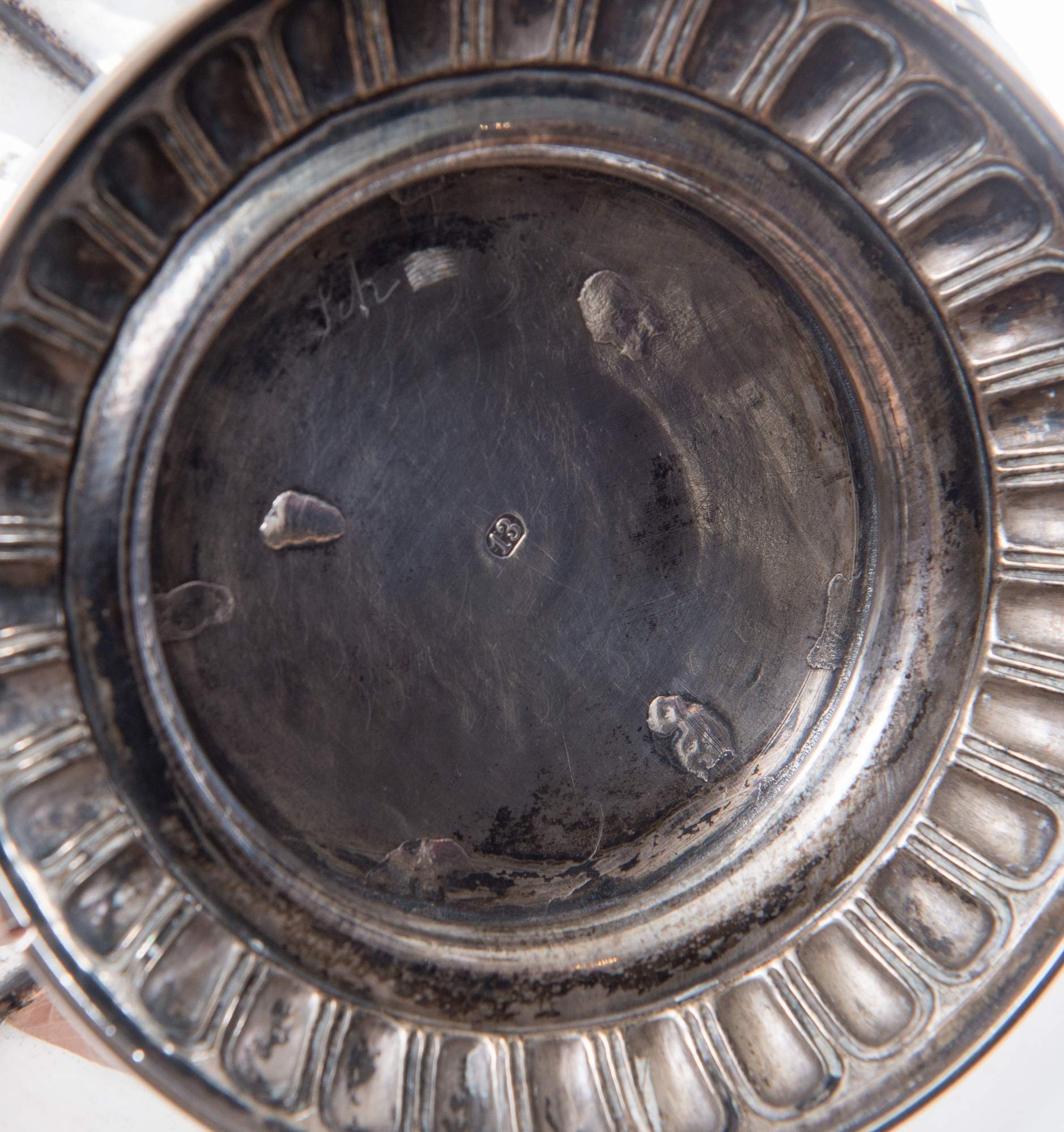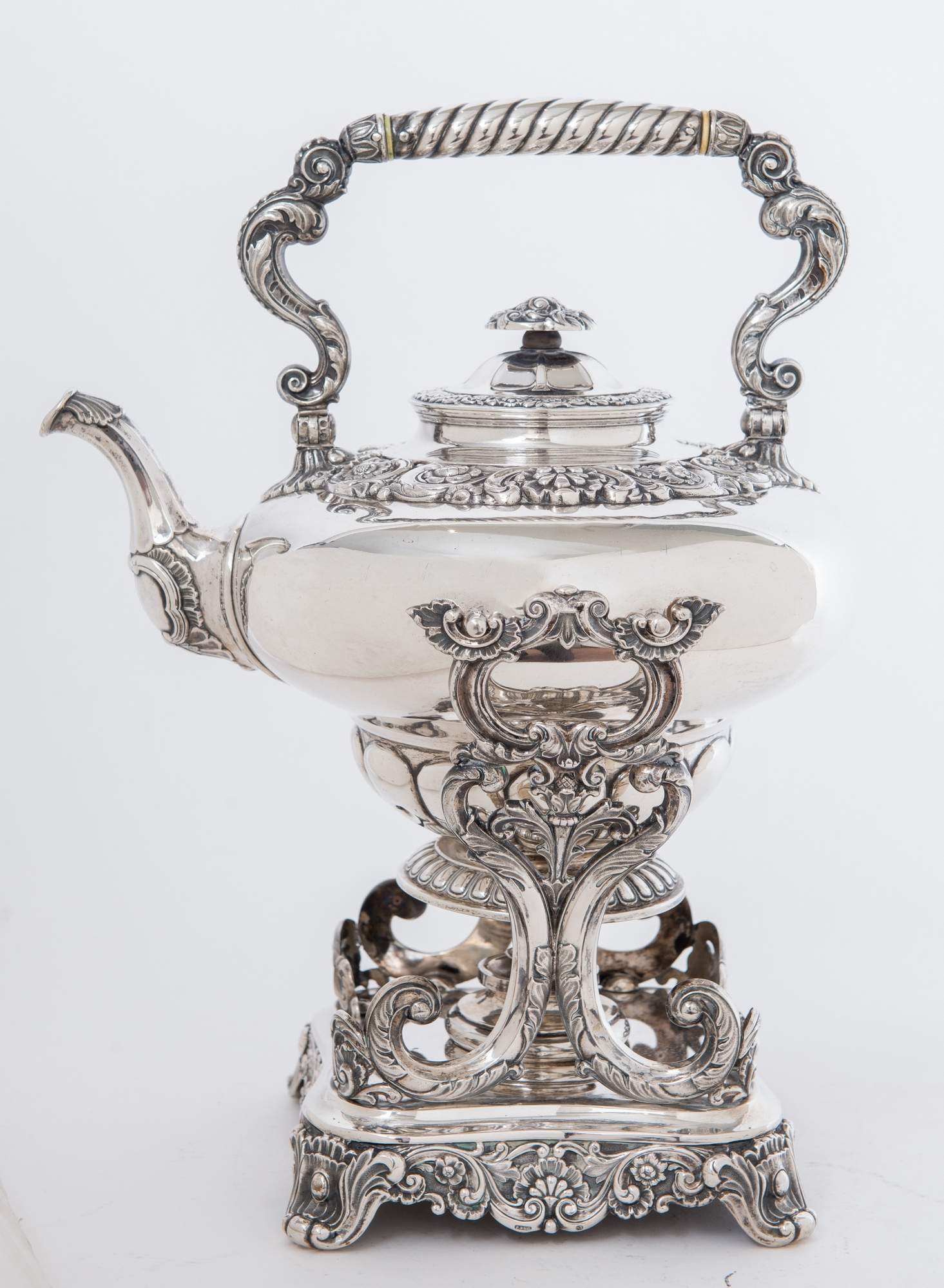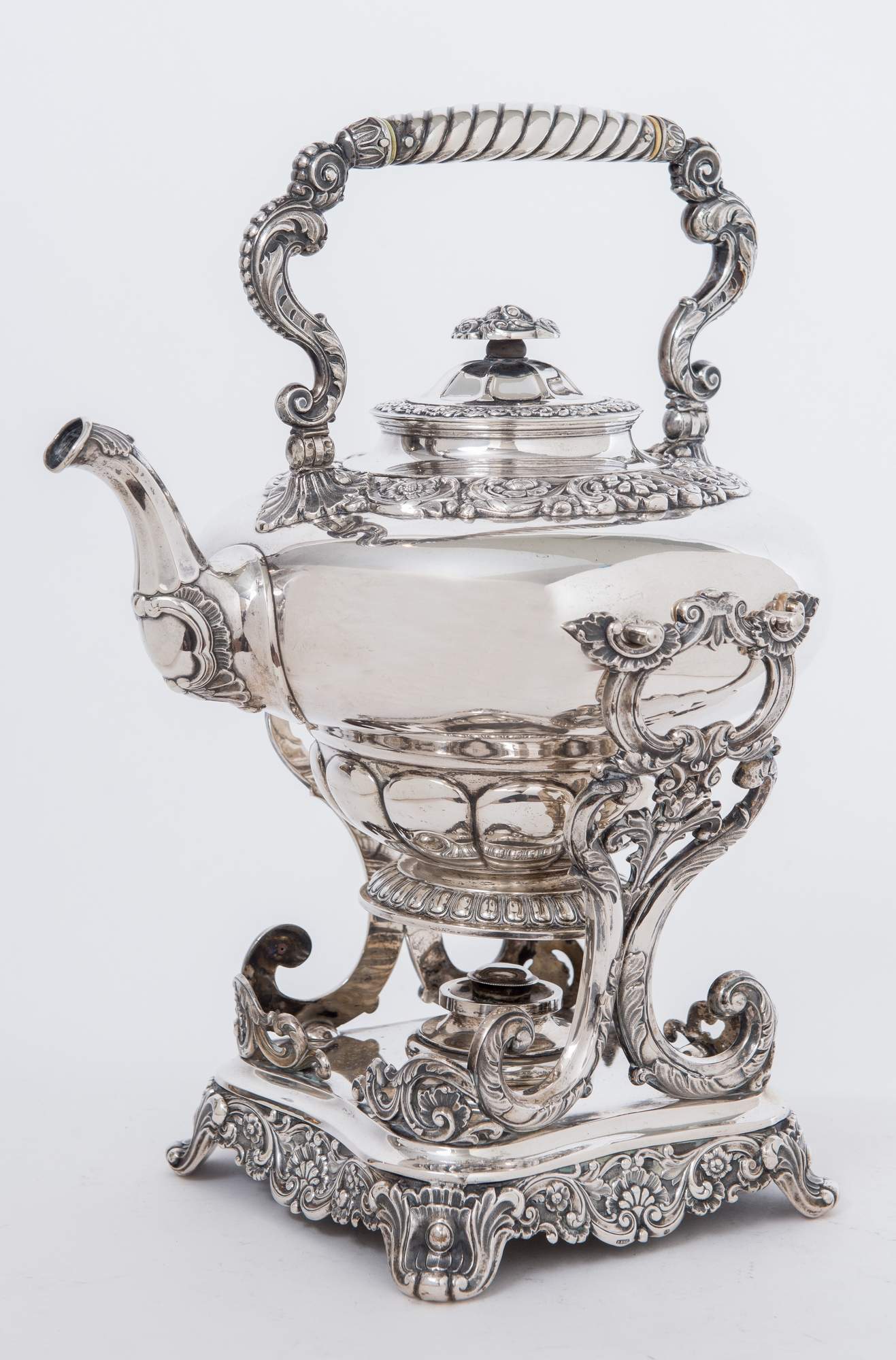 Samovar in argento. Reca punzoni e incisioni sotto la base del supporto (13,...