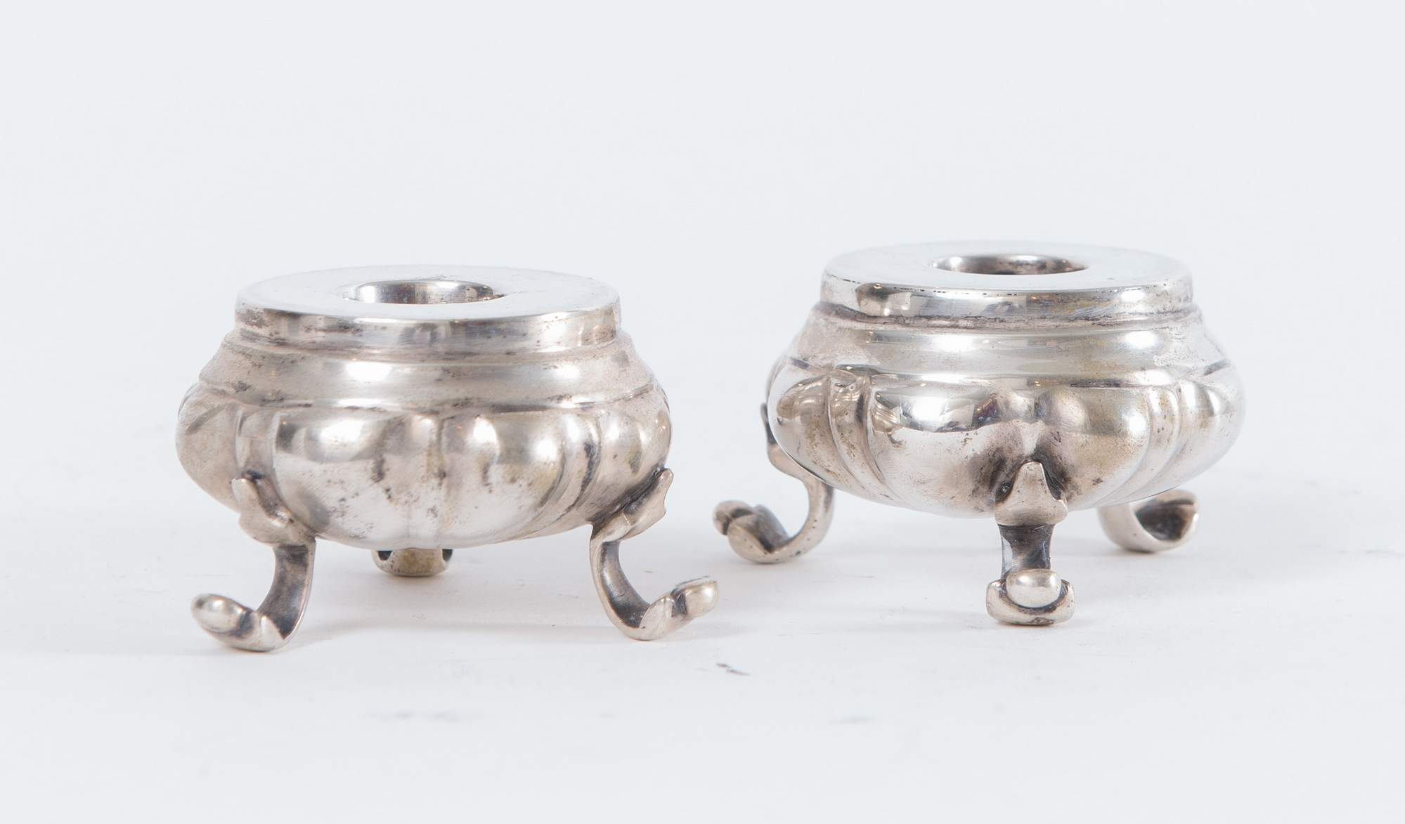 Argentiere TOSATO GIOVANNI, Padova. Coppia di portacandele in argento 800. Sotto la base recano punzoni: 800 e 54PD. Ø cm 7x H cm 4. Peso complessivo: 296 gr.