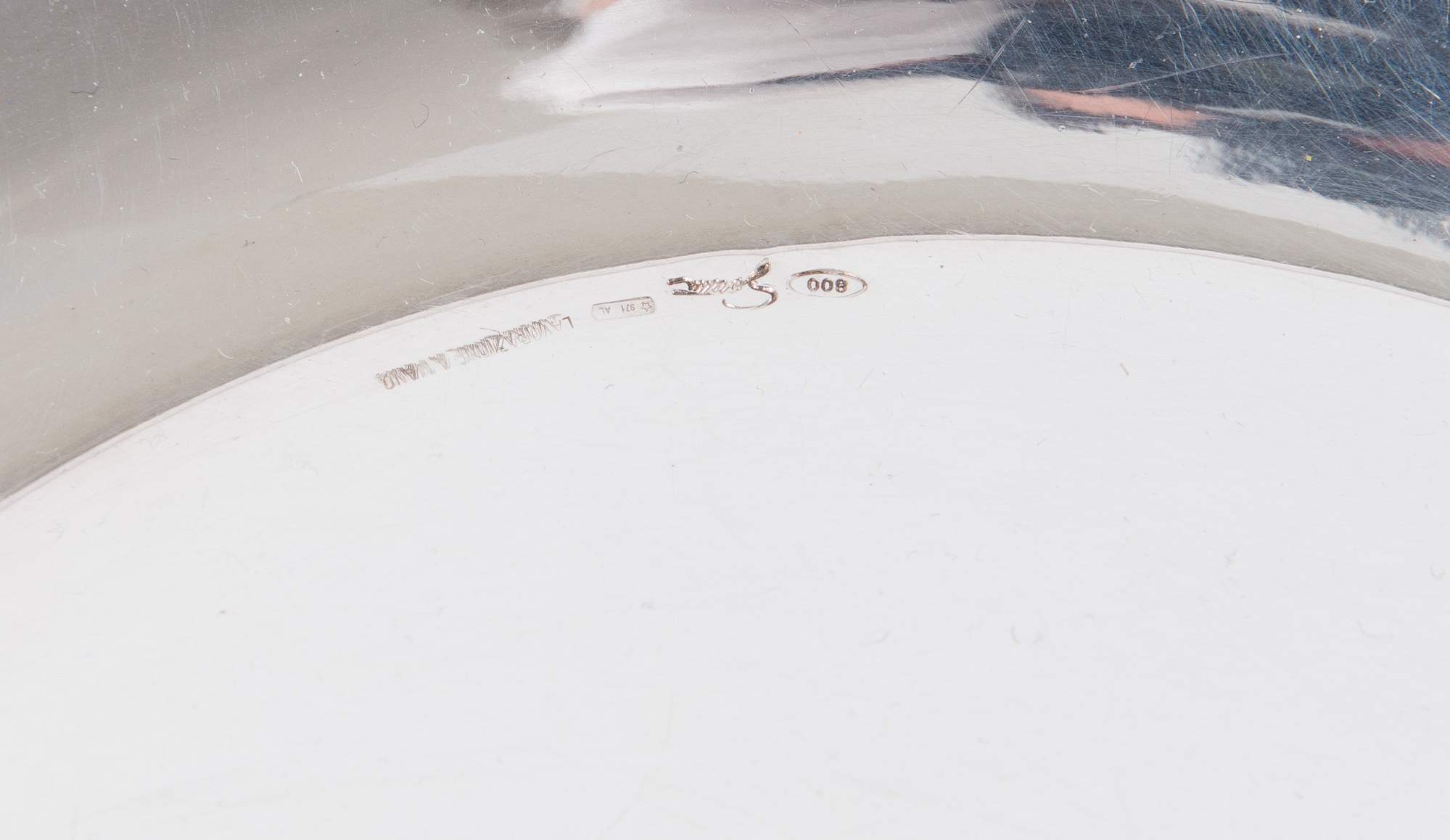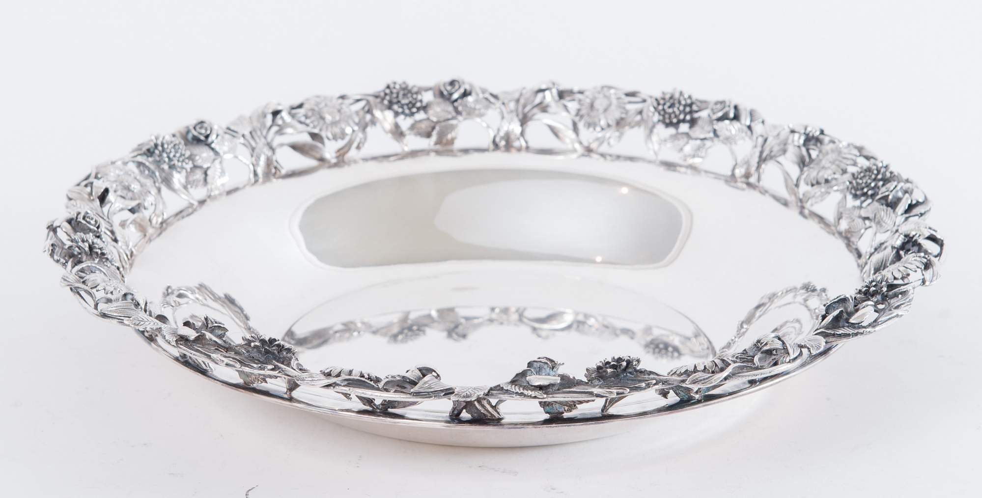 ENRICO GORETTA, Alessandria, seconda metà del XX secolo. Vassoio floreale in argento 800. sul fondo del piatto reca punzoni: 800, Goretta, 971AL, lavorato a mano. Peso 1280 gr. H. cm 6,5; Ø cm 37.