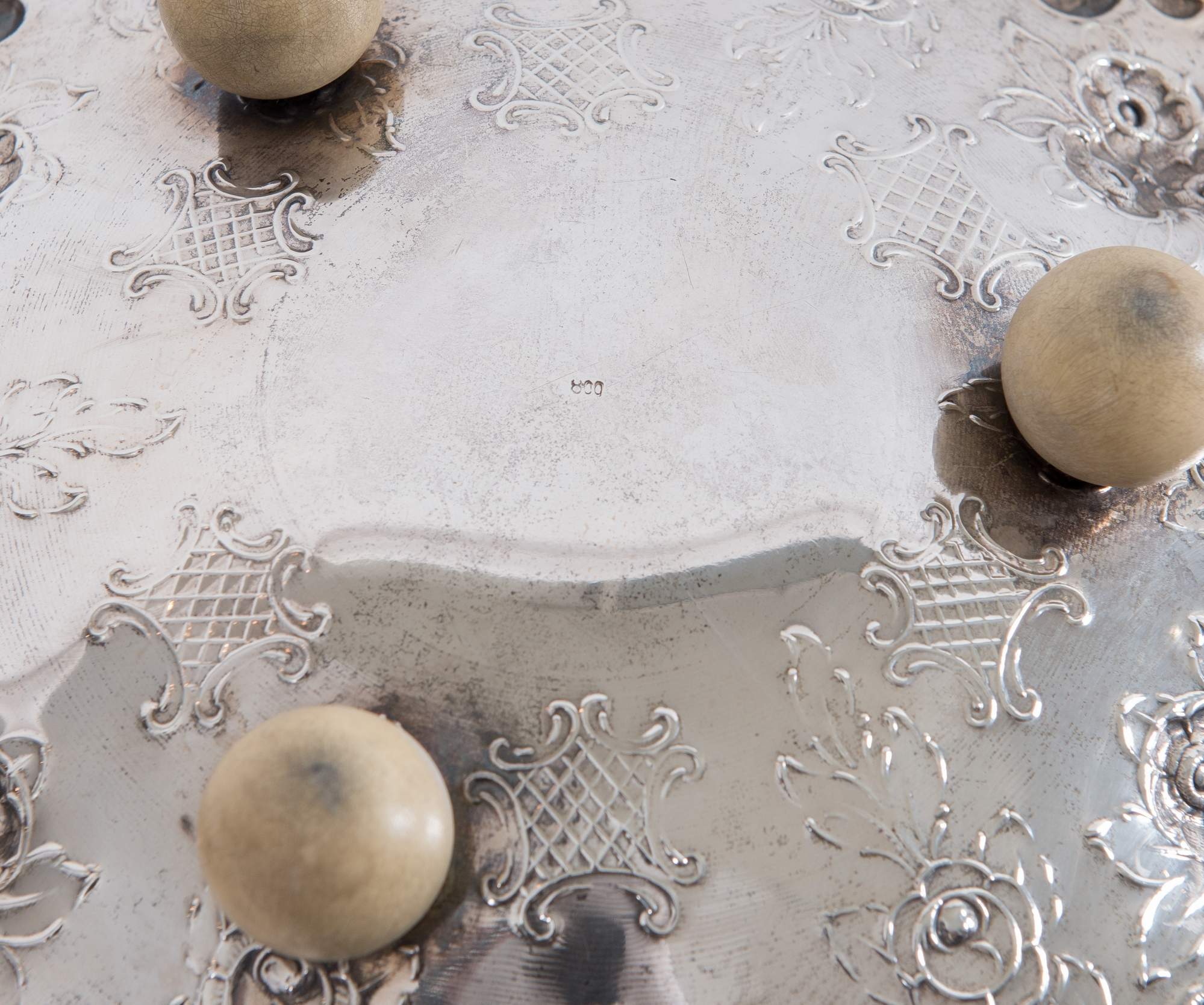 Centrotavola lavorata in argento 800. Sotto la base reca punzone 800. H cm 5; Ø cm 28. Peso: 358 gr.