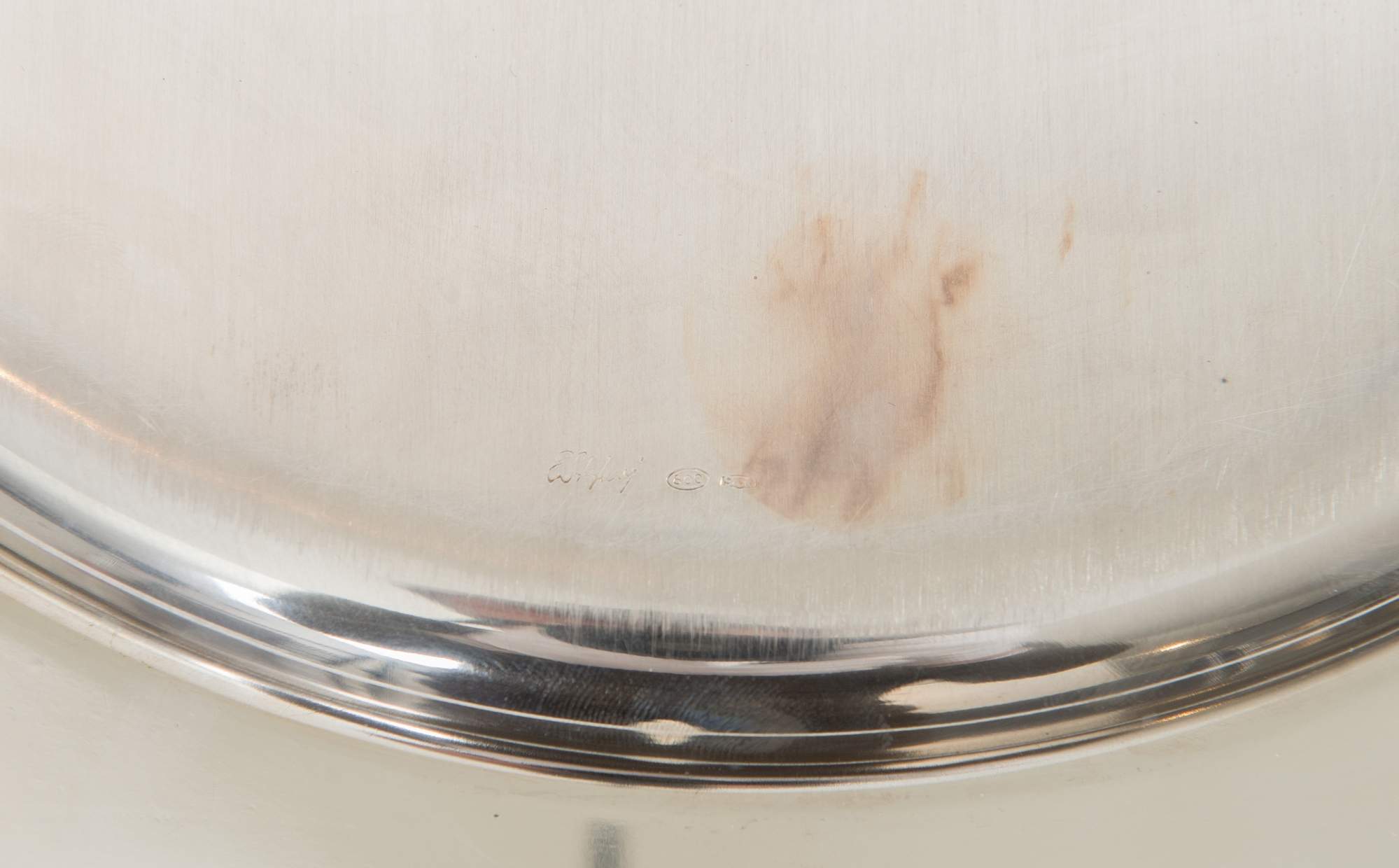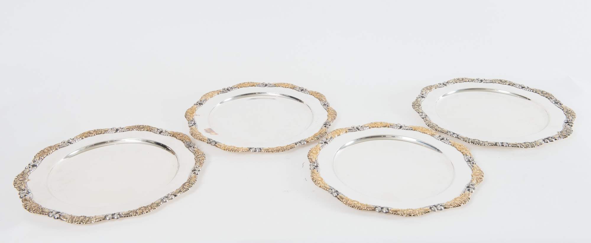 ENEA STEFANI, Bologna, XX secolo. Lotto composto da quattro piatti in argento 800. Sotto la base recano punzoni: EStefani, 800 e 9BO. Peso singolo: 597 gr; 596 gr; 583 gr; 611 gr. Peso complessivo: 2387 gr. Ø cm 31.