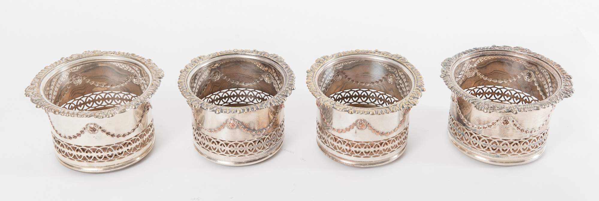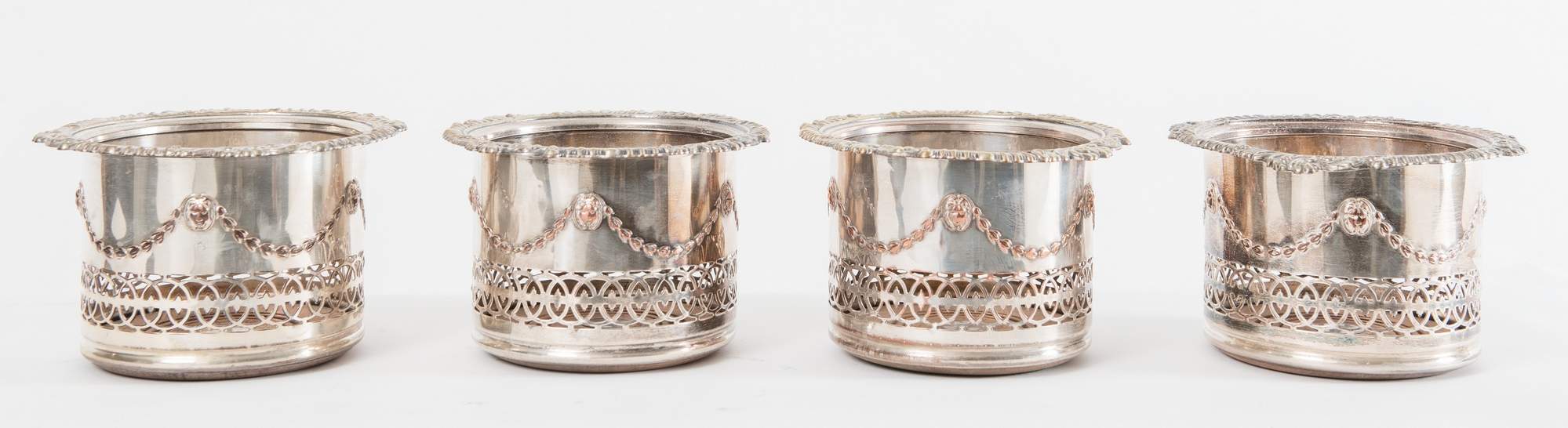 Lotto composto da quattro cache-pot in metallo argentato. Sul bordo esterno recano punzone BEA. Ognuno Ø cm 16; H cm 11.