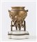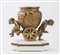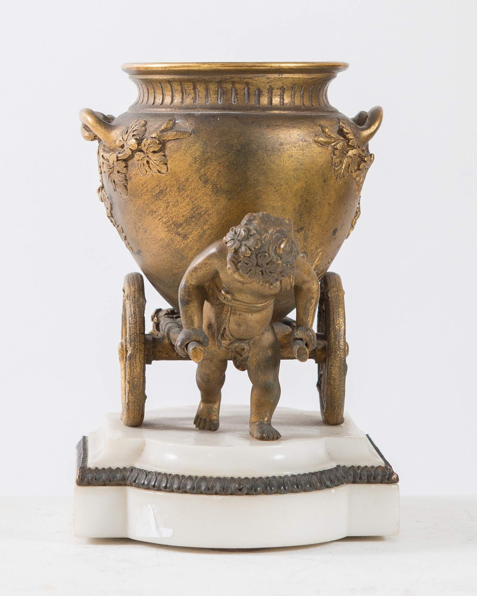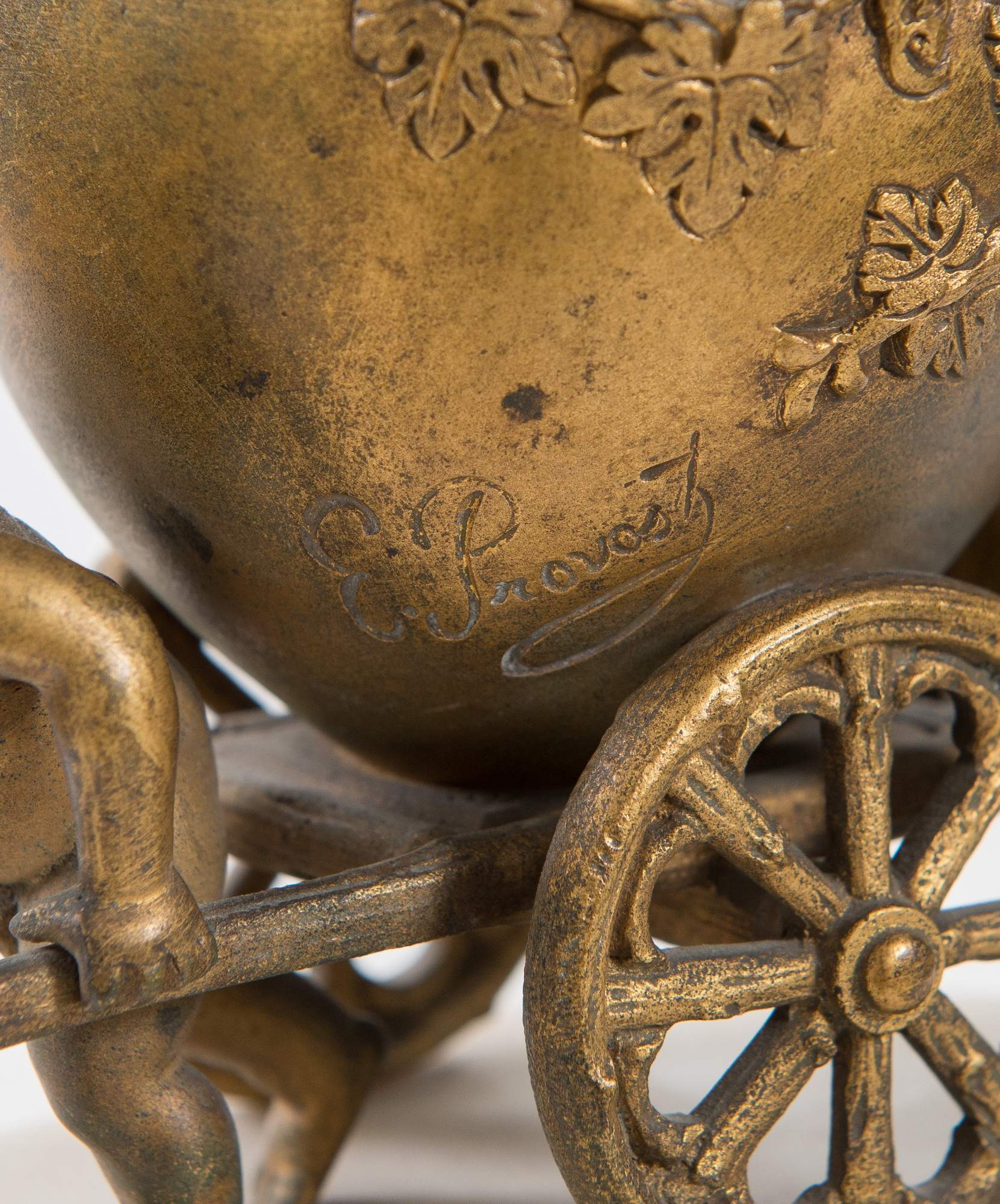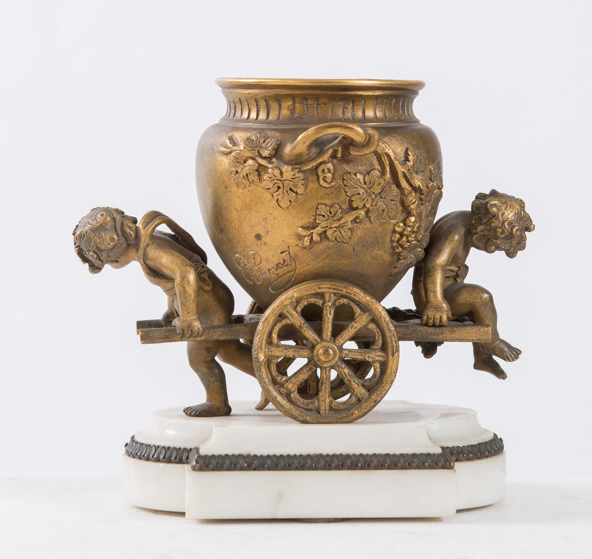 E. PROVOST, Francia, 1880-1910. Scultura in bronzo dorato con base in marmo, raffigurante un carretto trainato da un putto che trasporta un orcio e altro putto seduto nella parte posteriore. Cm 15,5x17,5x11. Opera firmata sul fianco E.Provost.
