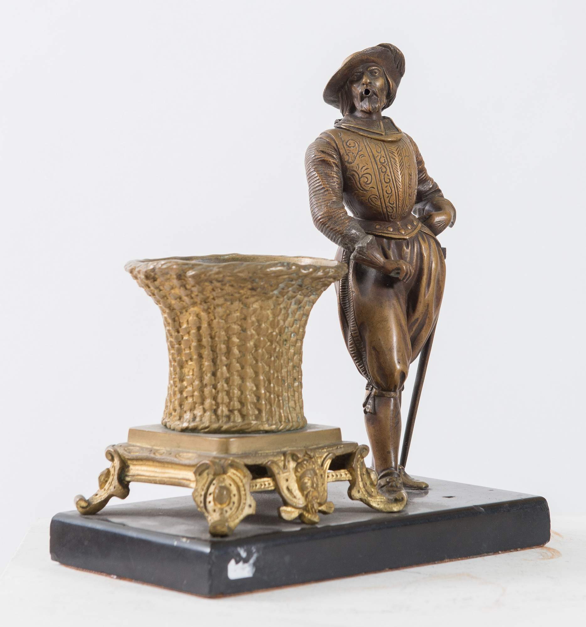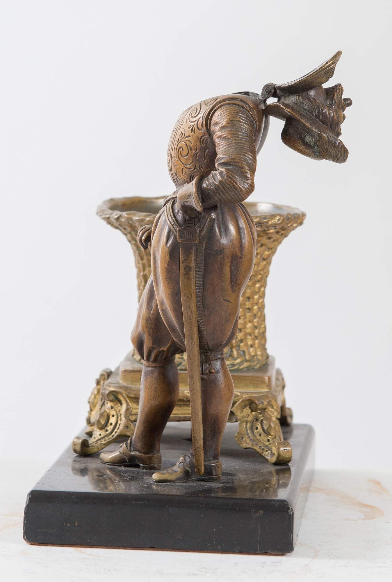 Calamaio in bronzo. Francia, seconda metà del XIX secolo. Realizzato a guisa di armigero in vesti rinascimentali. Al fianco reca contenitore a forma di cesto, il tutto raccordato da base di marmo nero. Cm 20,8x18,3x10,5. (difetti)