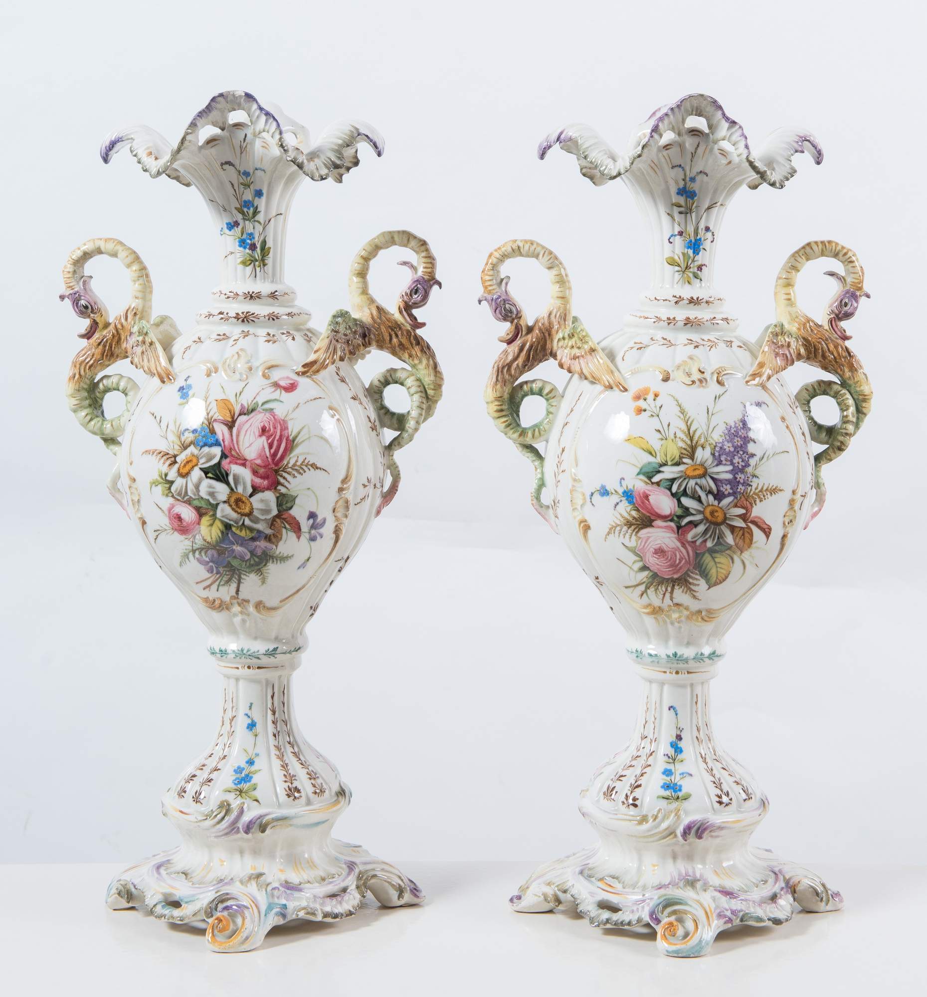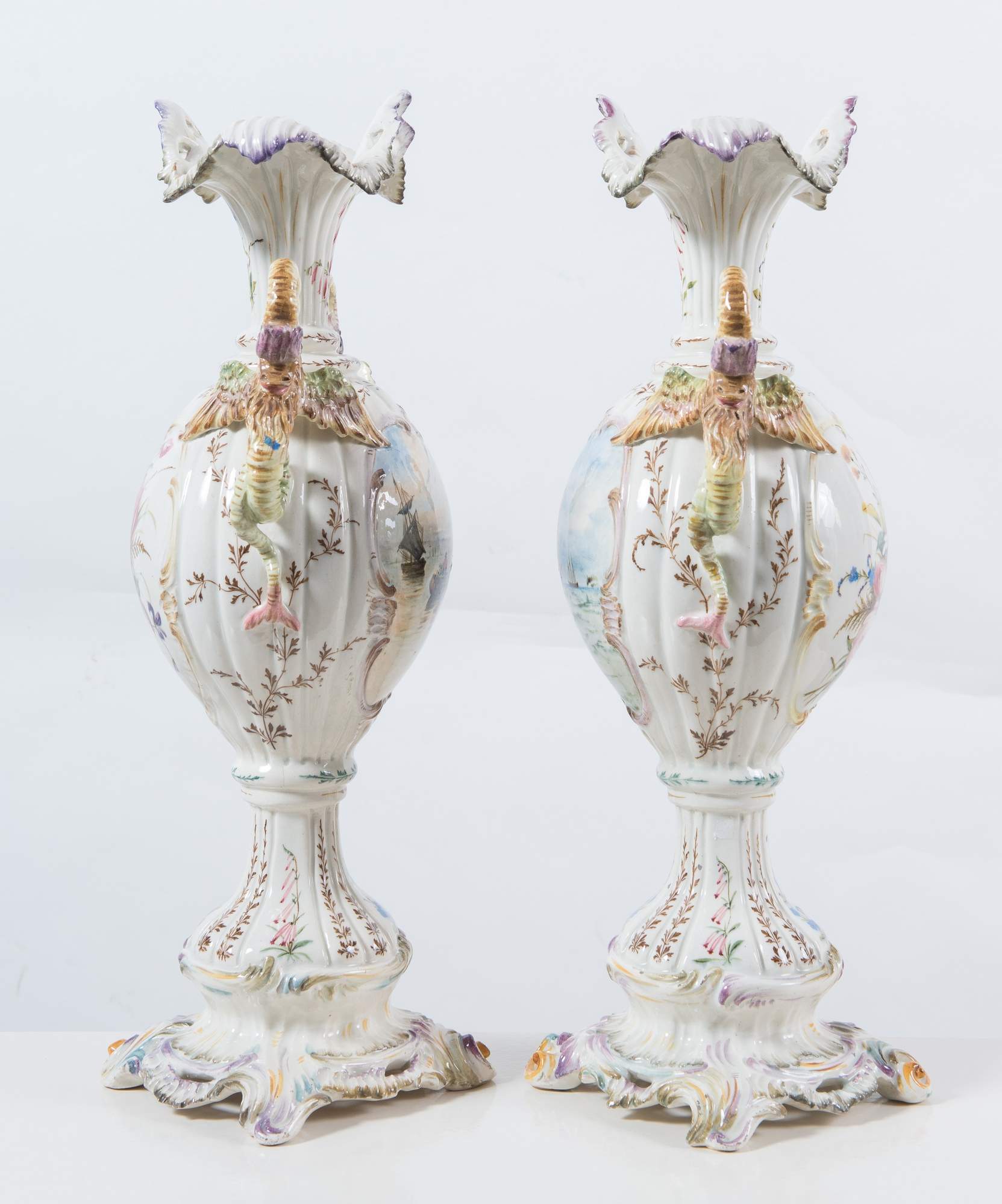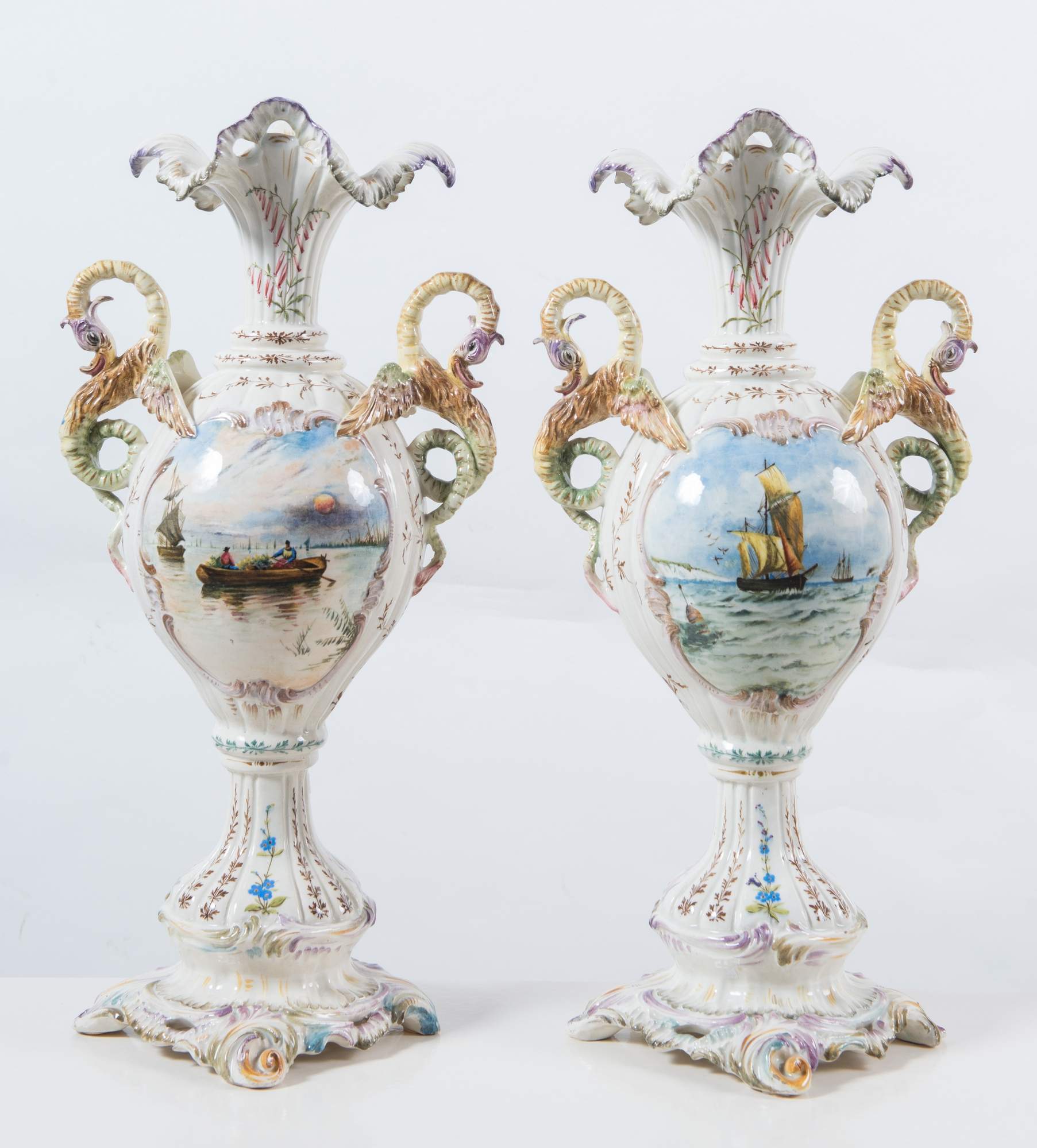 Coppia di vasi. Nove di Bassano del Grappa, metà del XIX secolo. Recano manici a guisa di drago e due marine dipinte sul corpo del vaso. Cm 54x27x17.