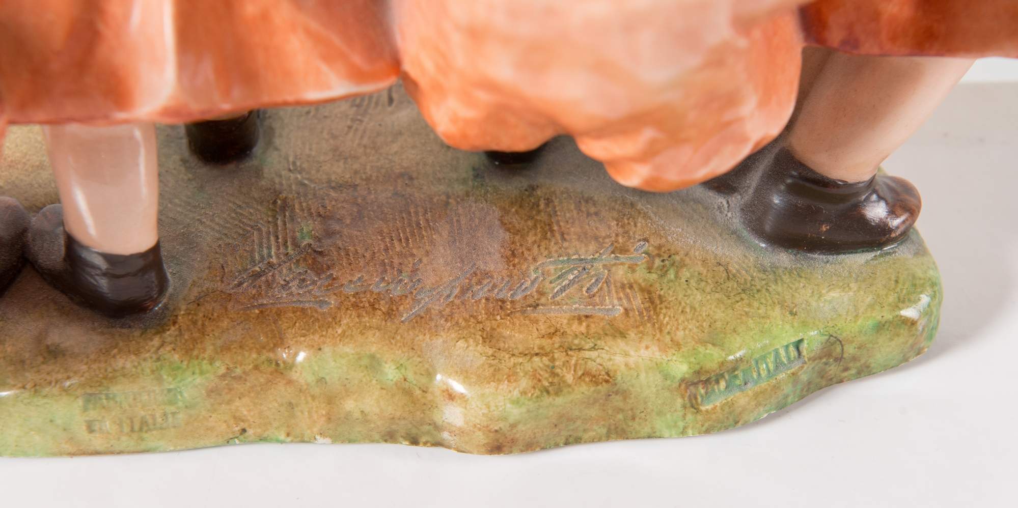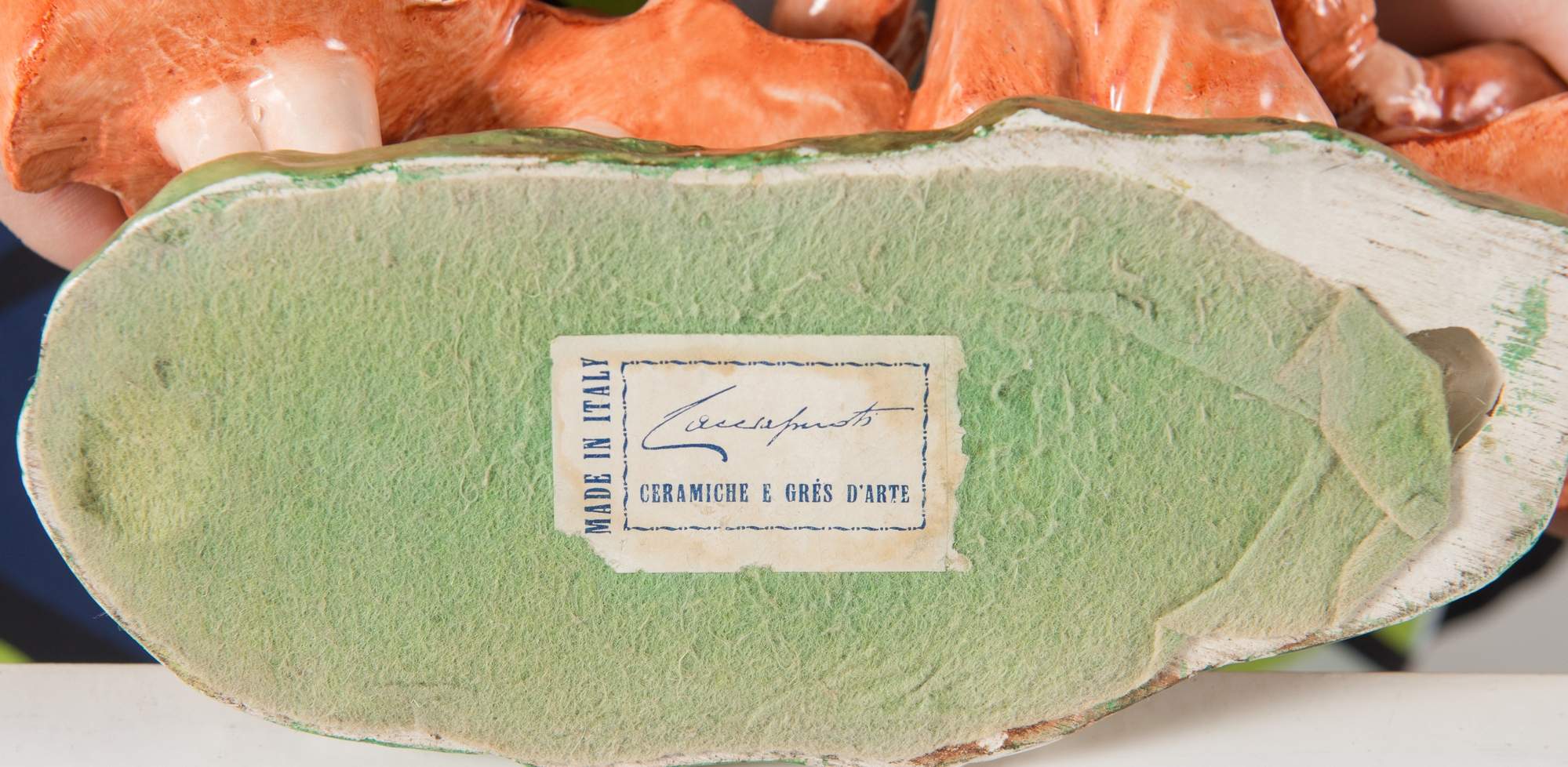 CACCIAPUOTI, XX secolo. "Bambine". Scultura in ceramica policroma. Cm 16x22x10. Opera firmata alla base Cacciapuoti. Reca due timbri a fuoco parzialmente leggibili. Sotto la base reca etichetta Cacciapuoti, Ceramiche e gres d'arte, Made in Italy. (difetti)