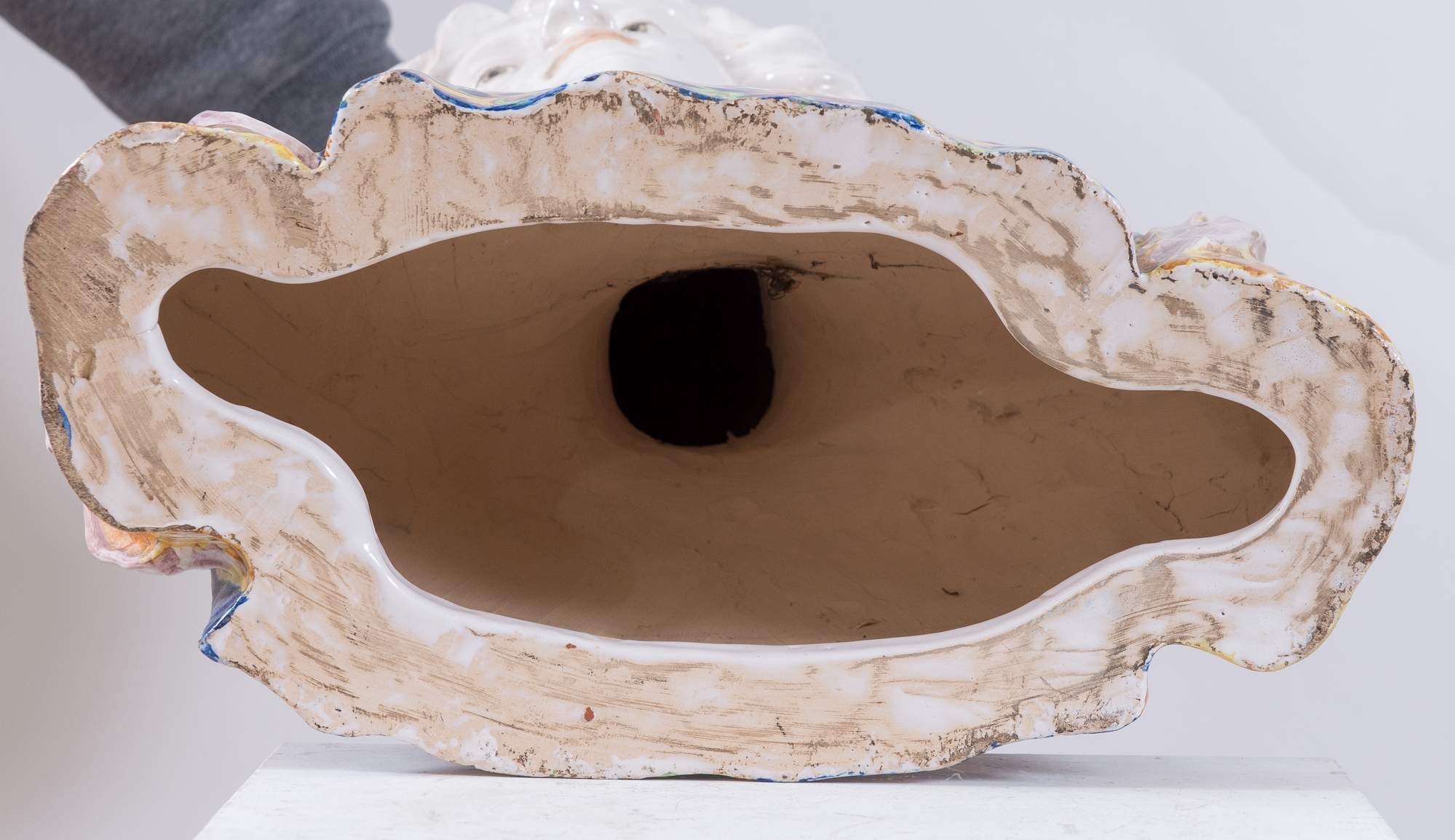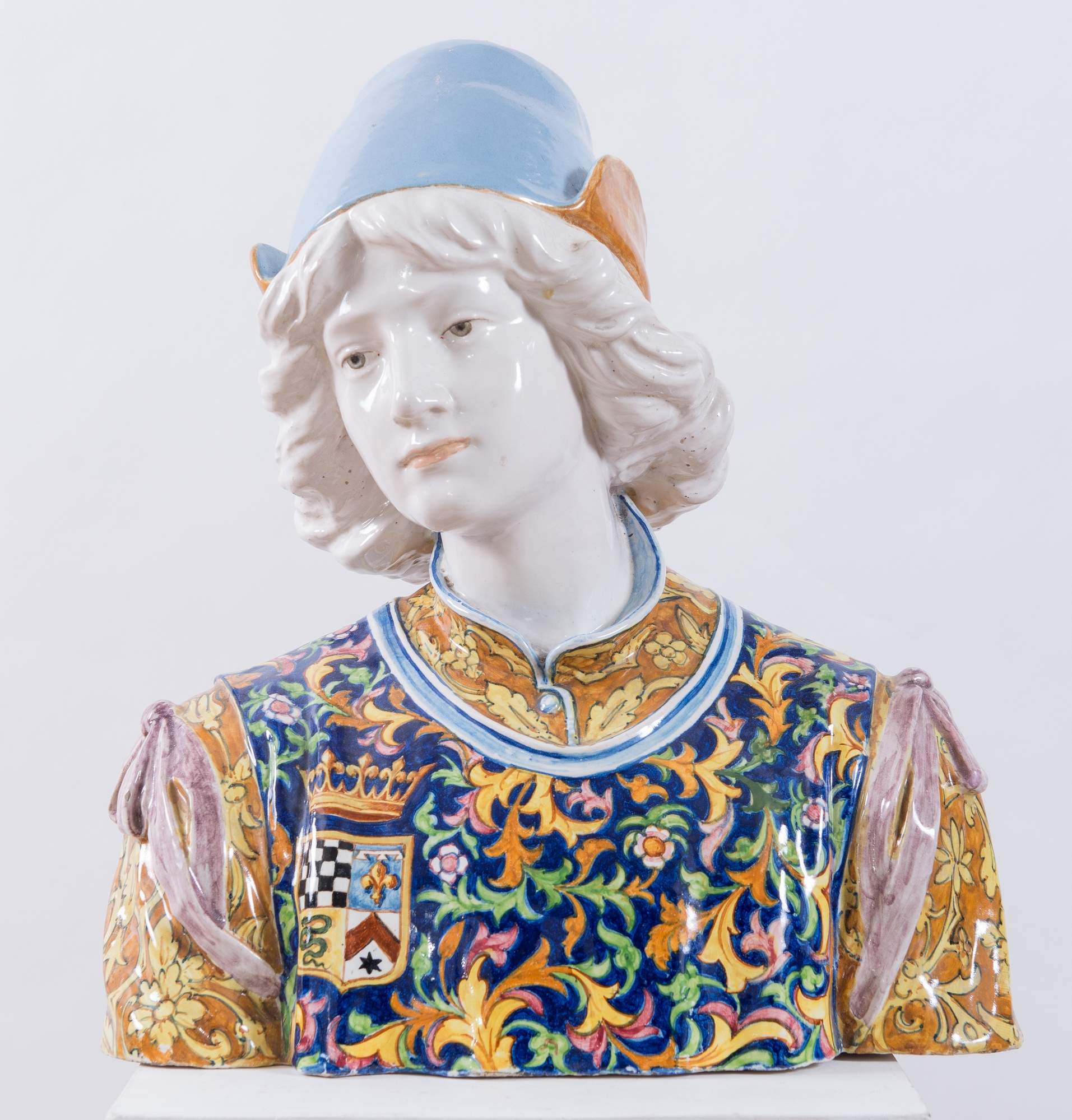 ANGELO MINGHETTI, Bologna, XX secolo. Busto di nobiluomo, realizzato in ceramica policroma. Cm 41x37x20. Opera siglata sul retro AM. (lievi difetti)
