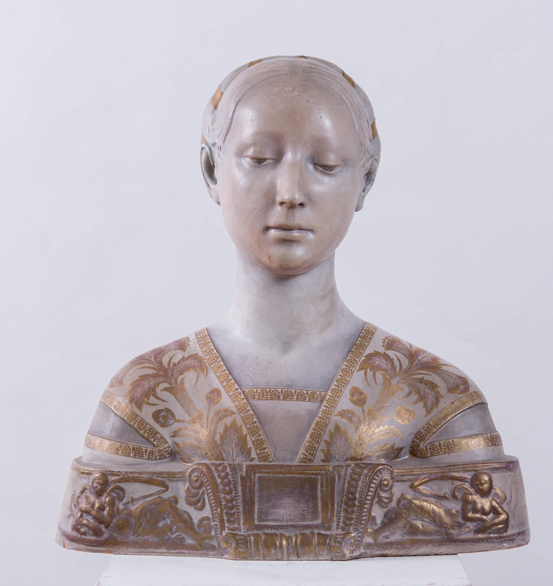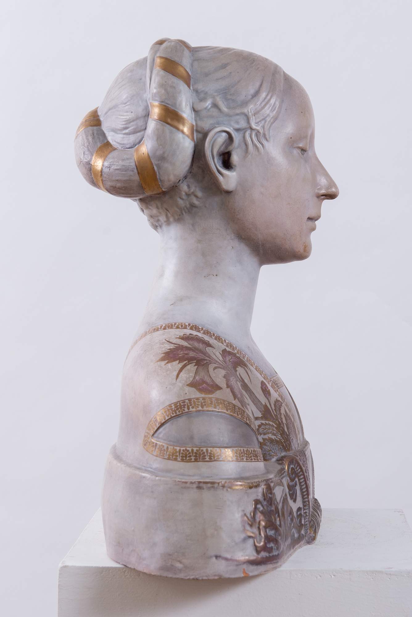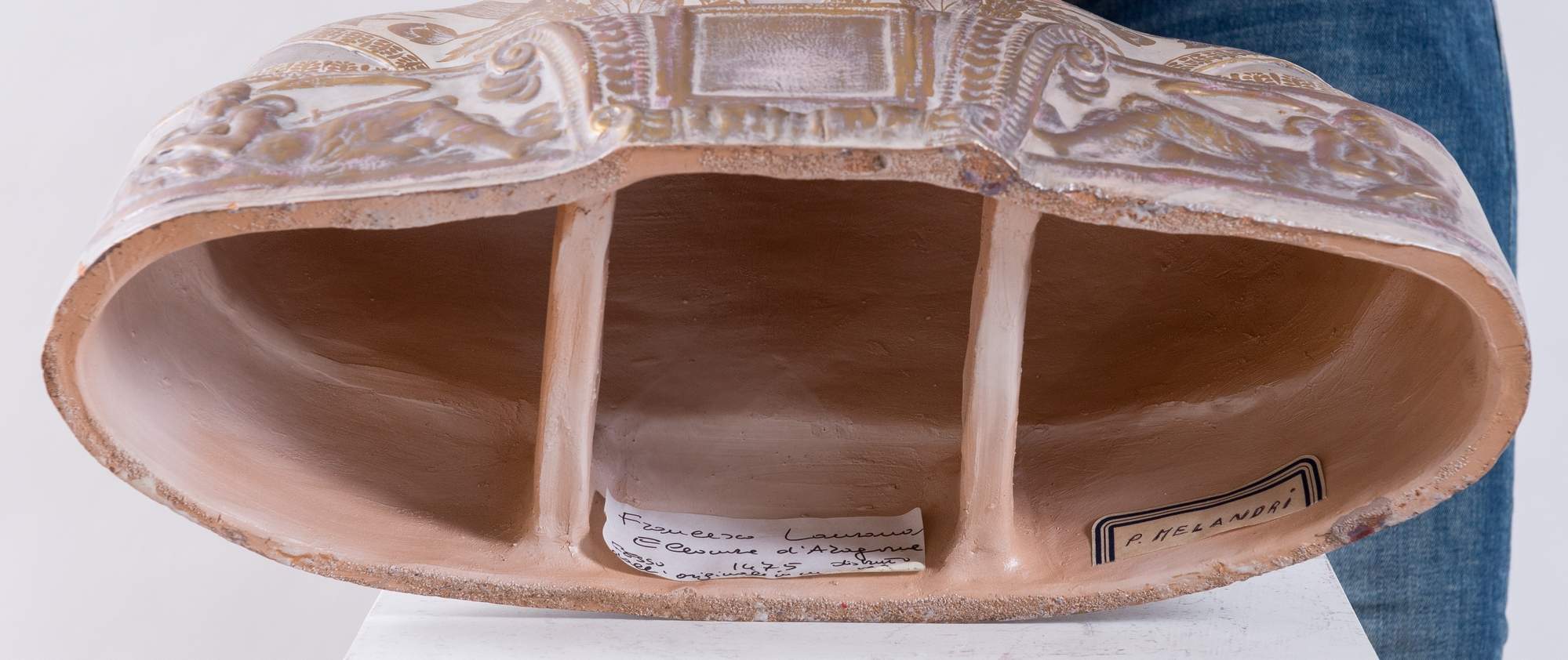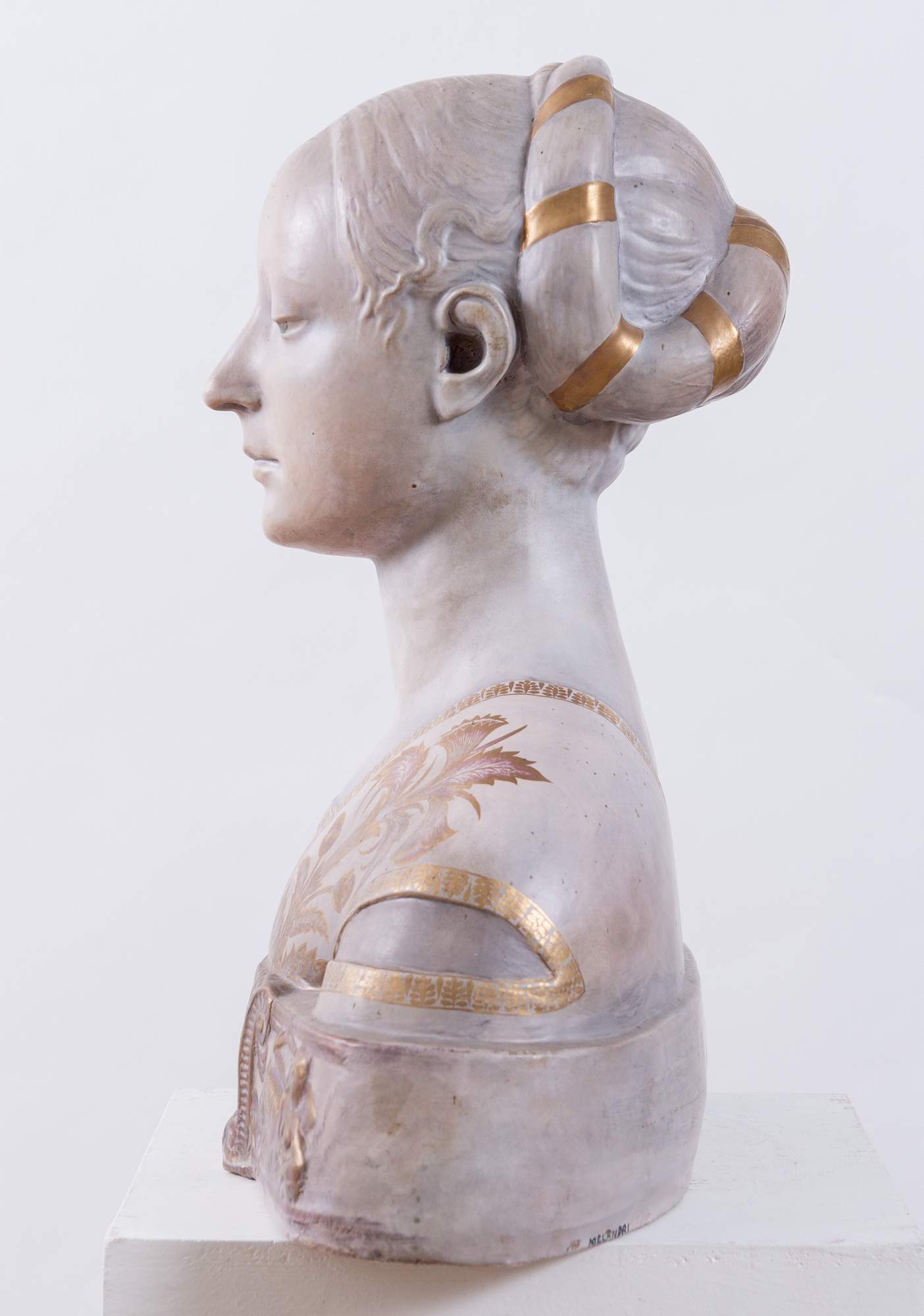 PIETRO MELANDRI (Faenza 1885 - 1976) “Busto di fanciulla”. Scultura in ceramica policroma. Cm 45x42x20. Opera firmata al retro Melandri.