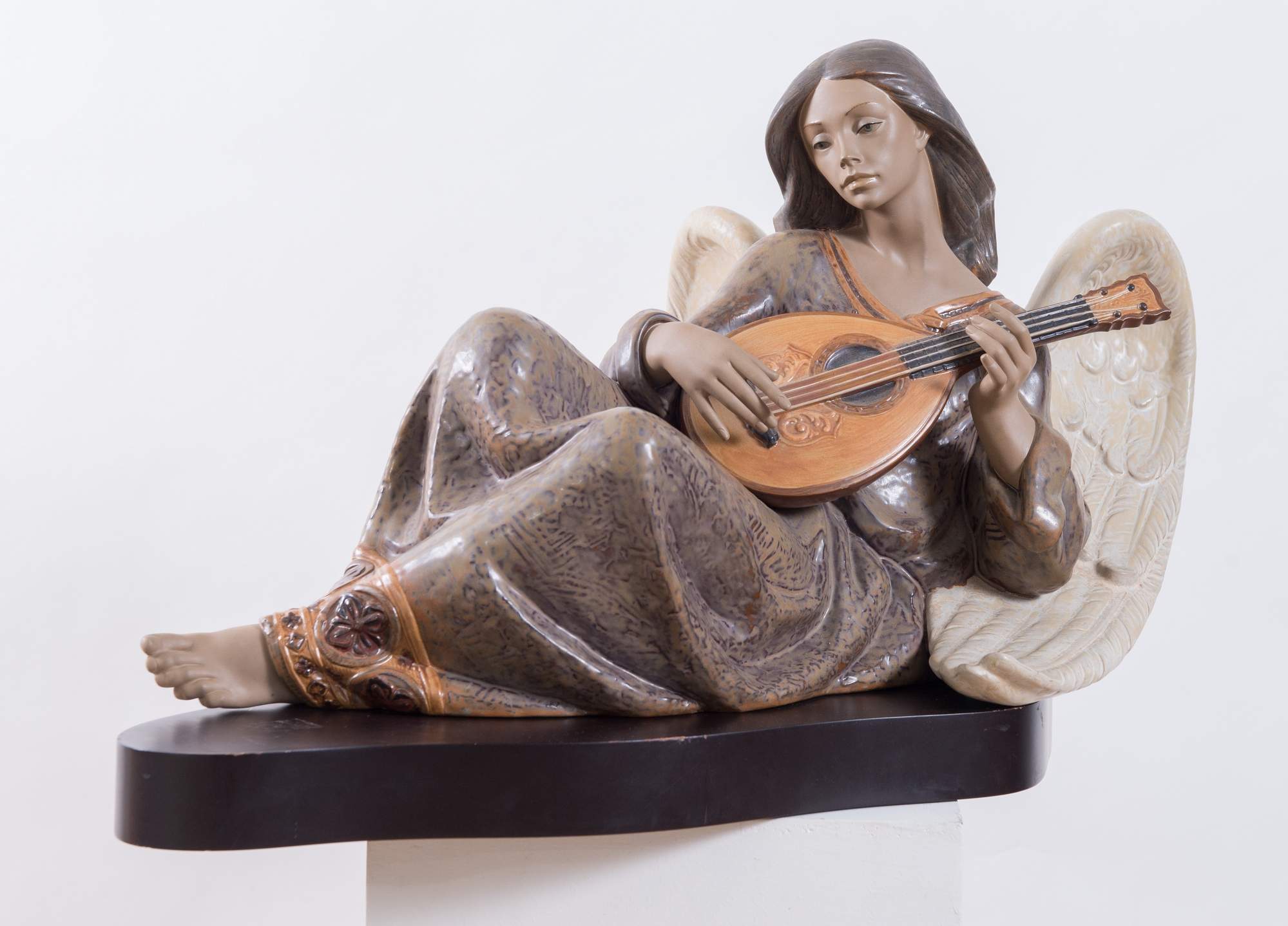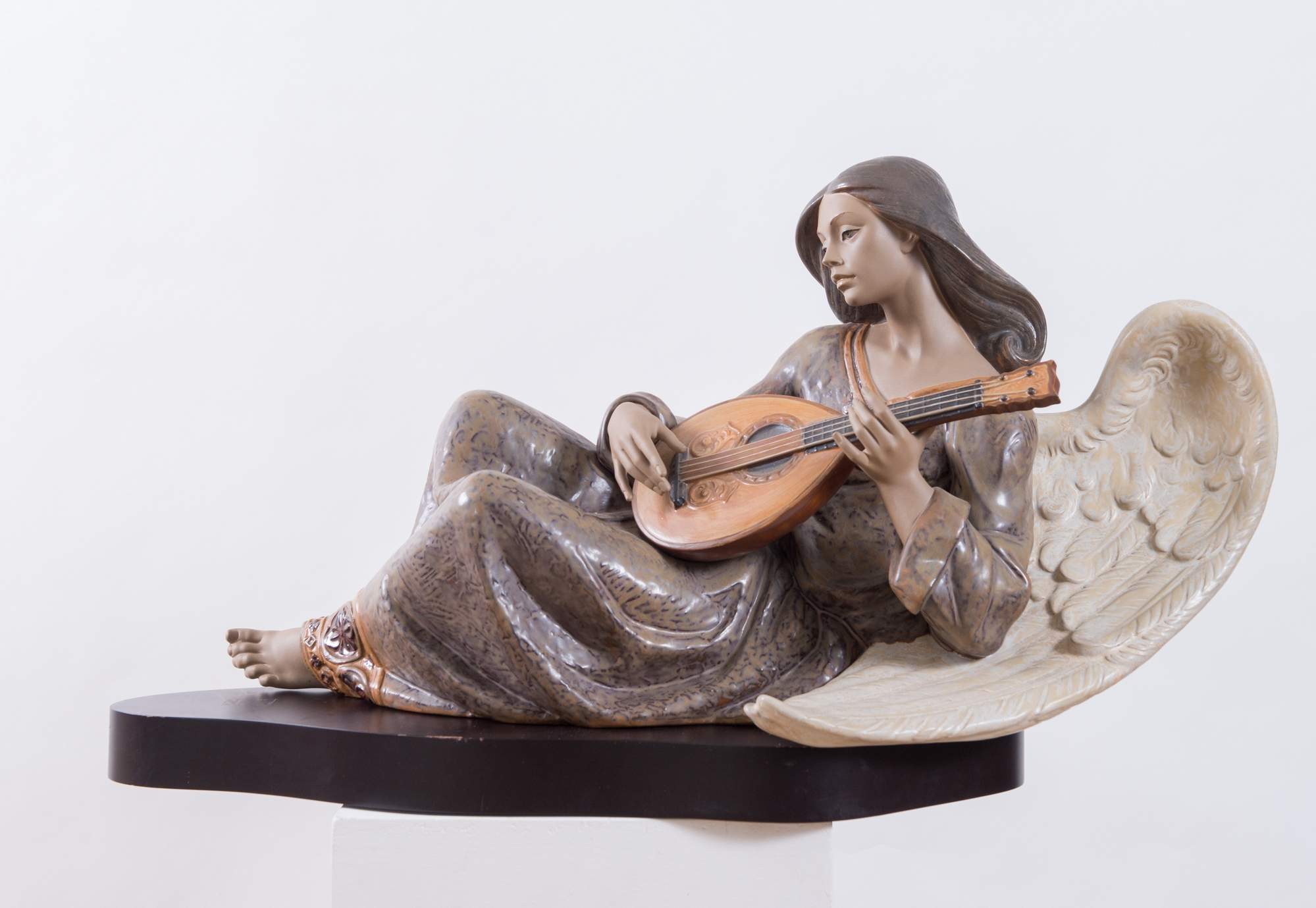 JOSE PUCHE e C. BAUSET, Manifattura LLADRO', Spagna, XX secolo. "Angelo con mandolino". Scultura in ceramica. Cm 35x73x47. Sul fondo reca etichetta con marchio LLadrò., ceramista J. Puche, decorazioni C. Bauset e probabile numero di archiviazione 764.