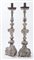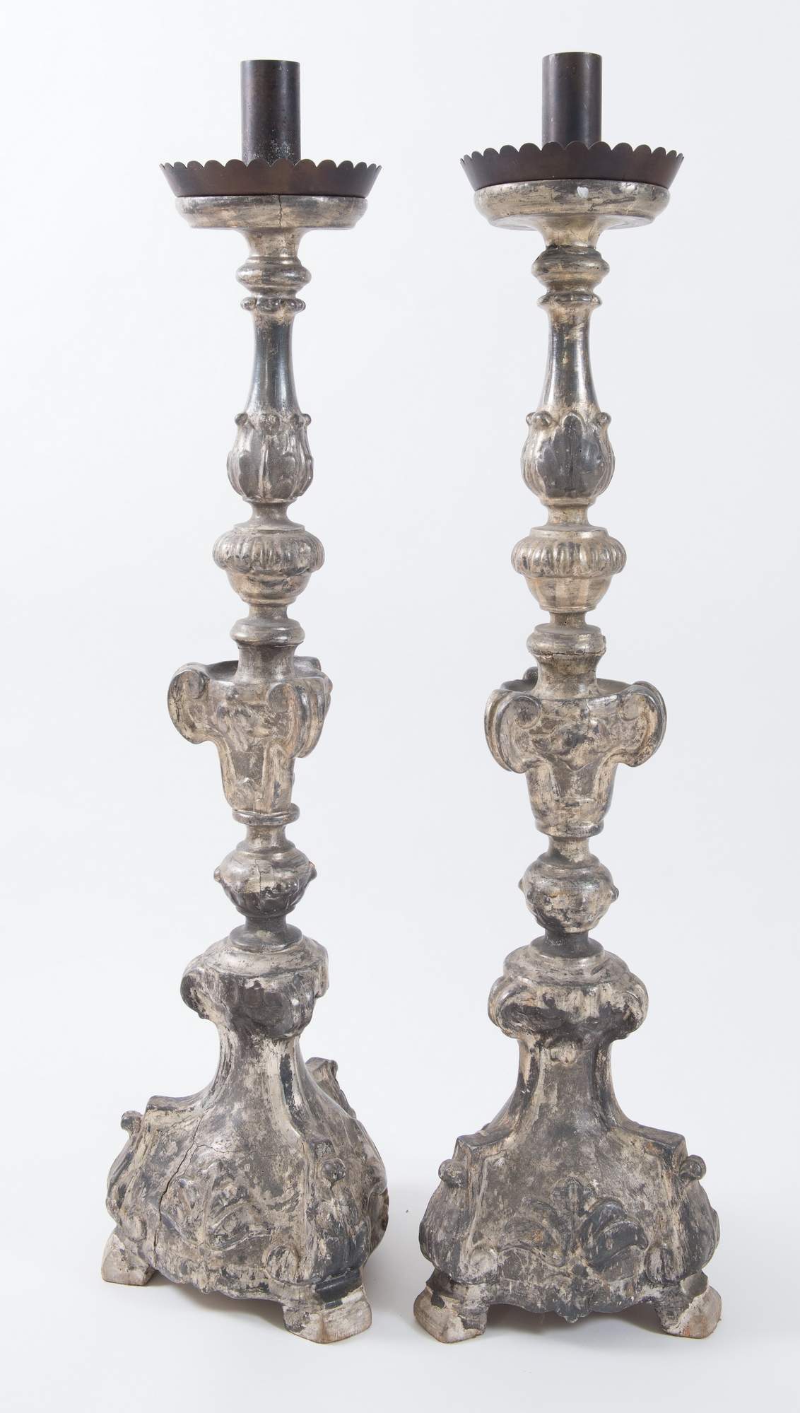 Coppia di candelabri in legno intagliato e argentato. Zona lombardo-emiliana, metà del XVIII. Cm 106x29x30. Cm portacero superiore: 15x20x20. (lievi difetti)