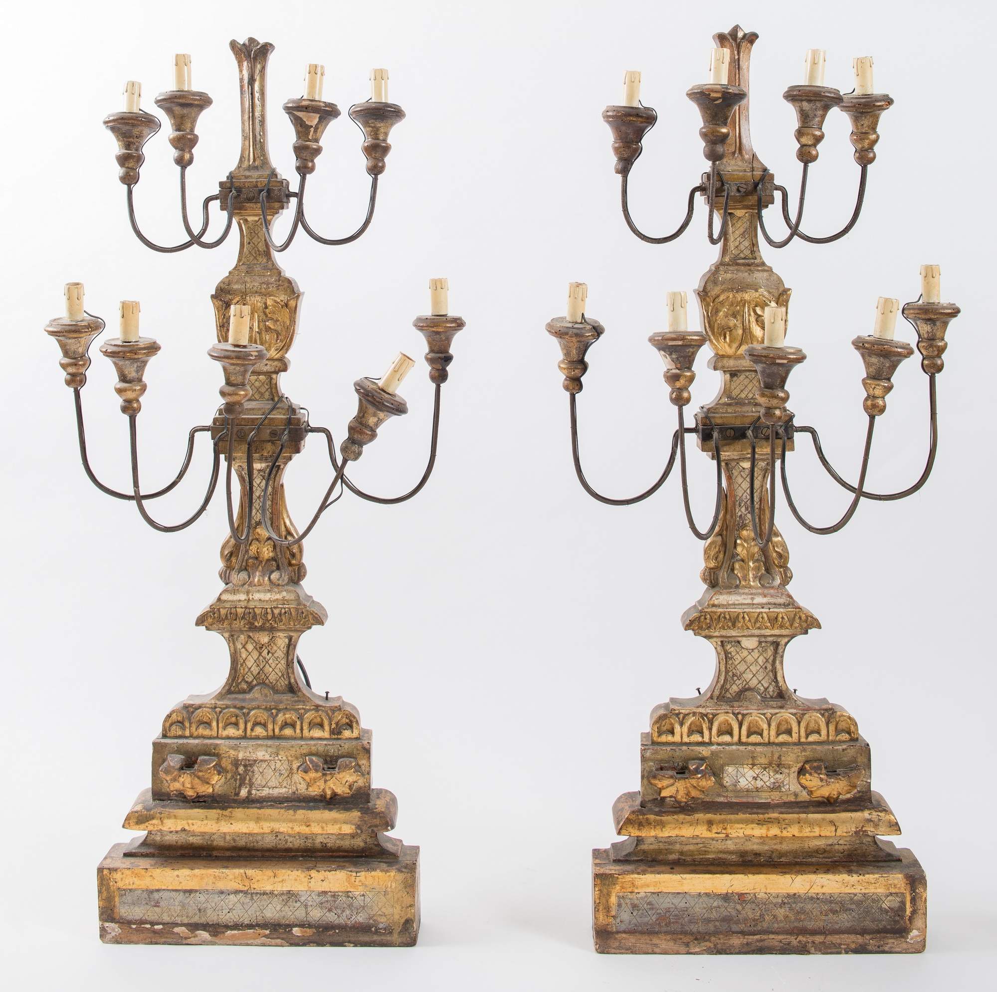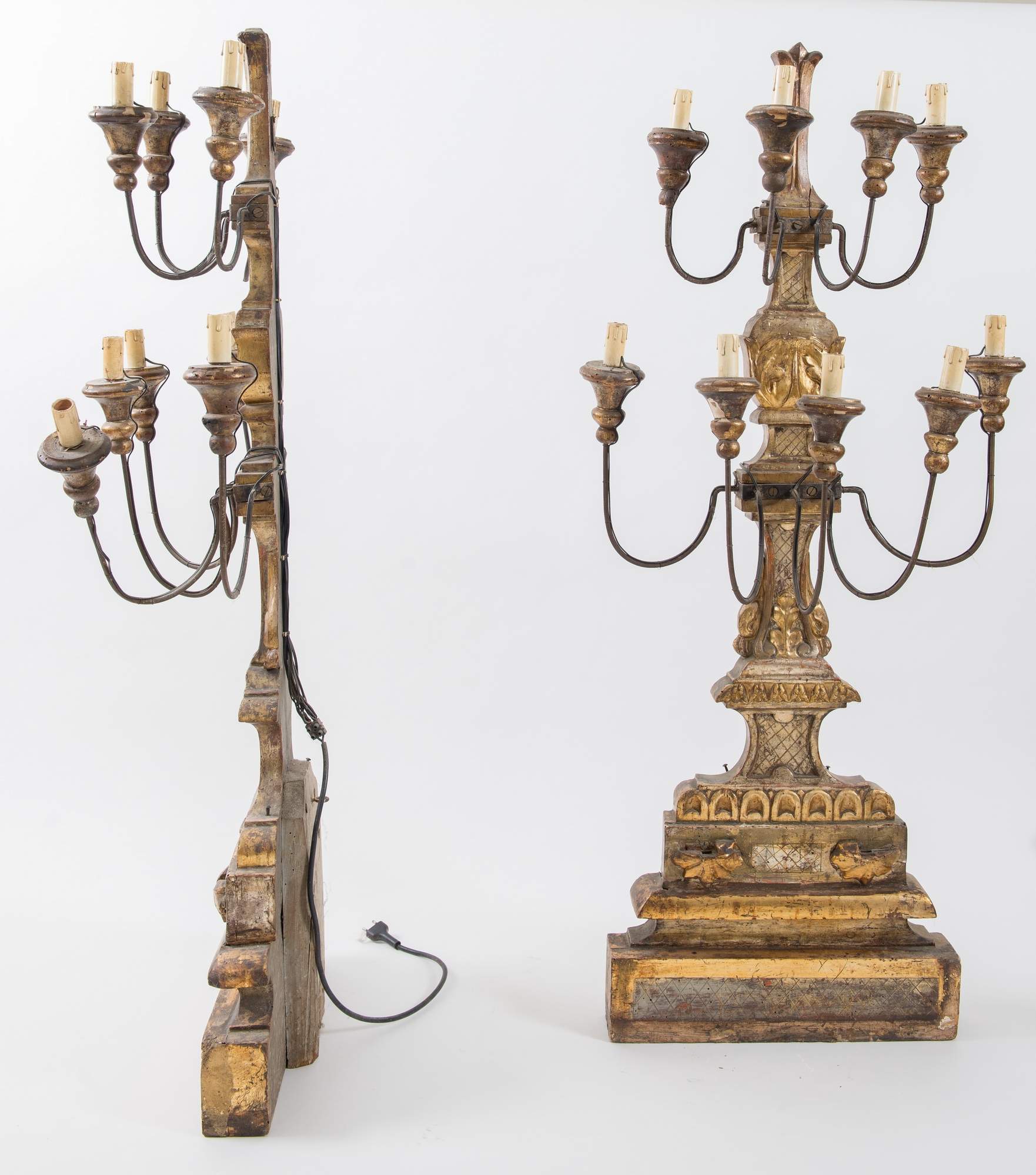 Coppia di grandi candelabri in legno intagliato e dorato. Toscana, ultimo quarto del XVIII secolo. Bracci realizzati in ferro curvo. Cm 127x45x20. (difetti)