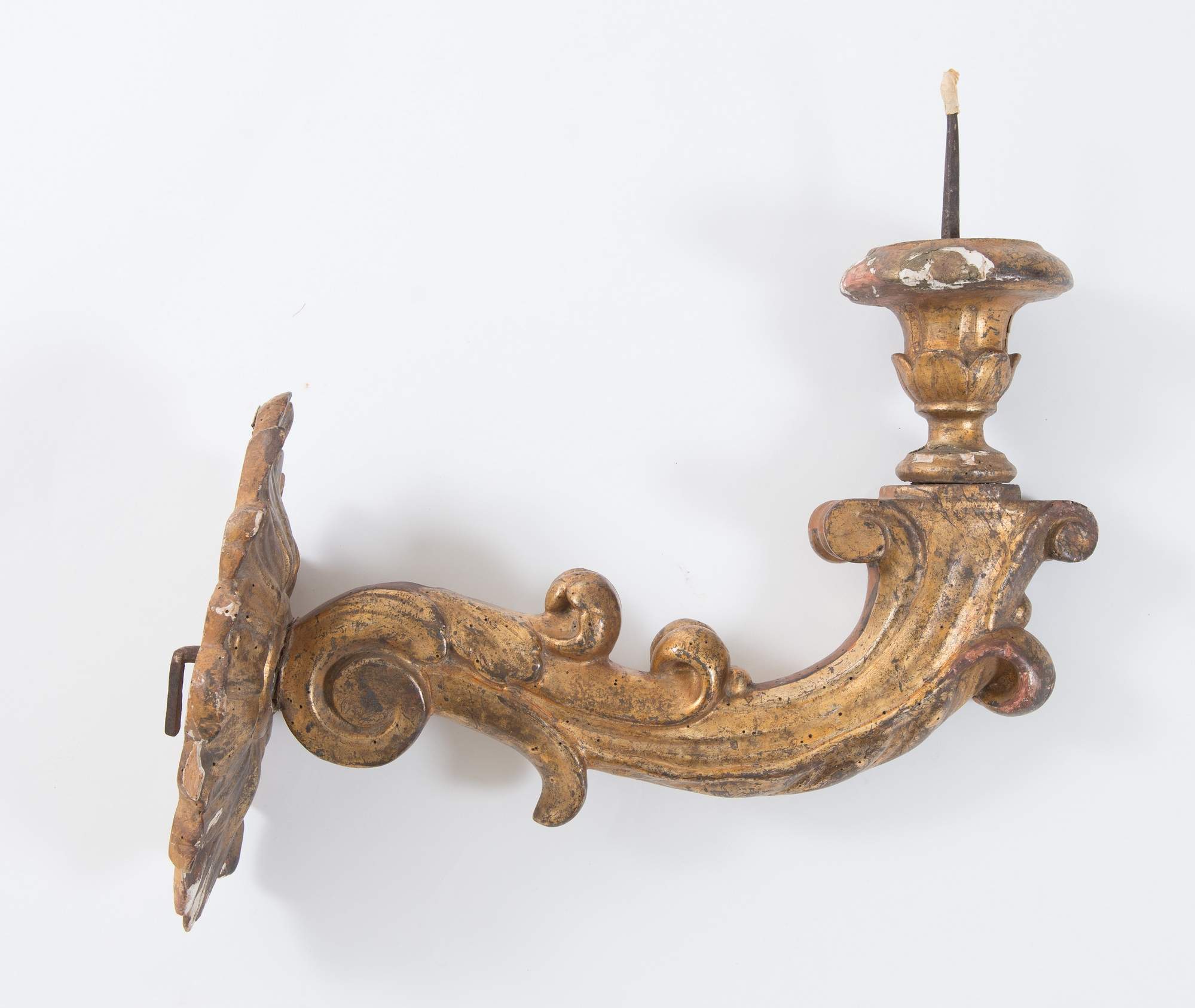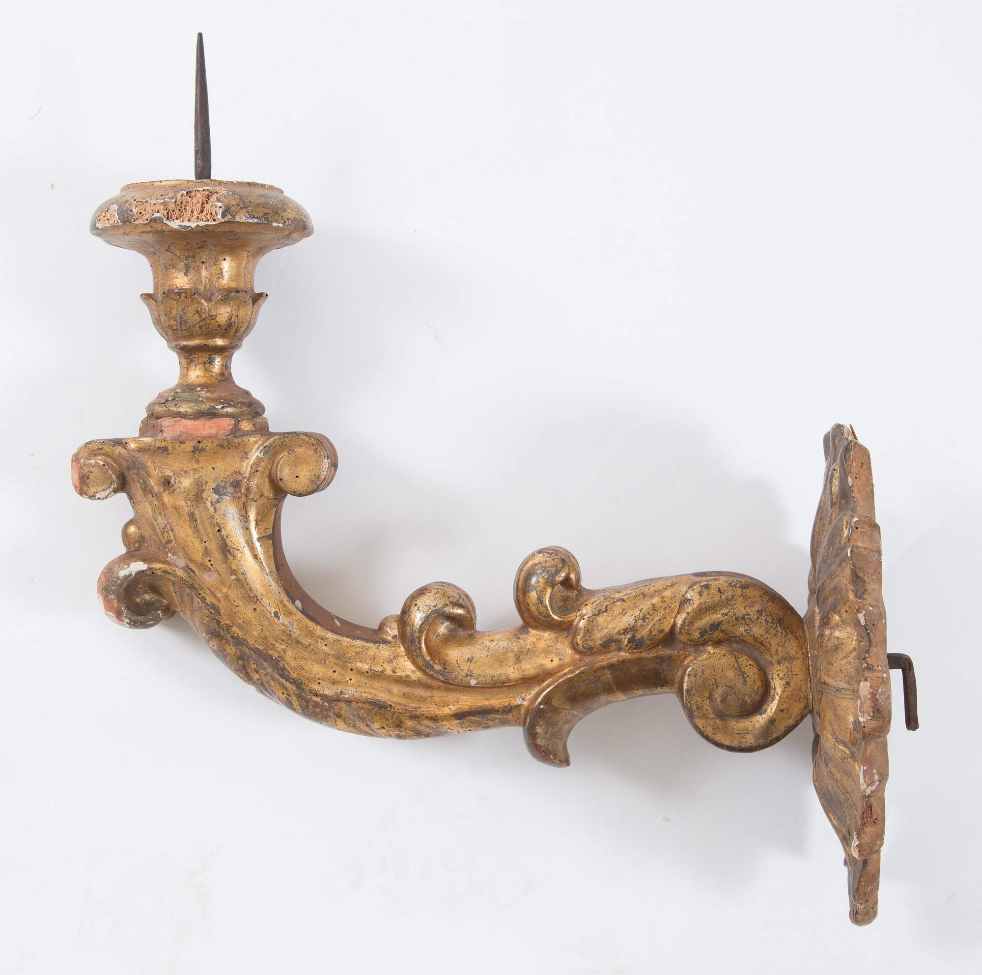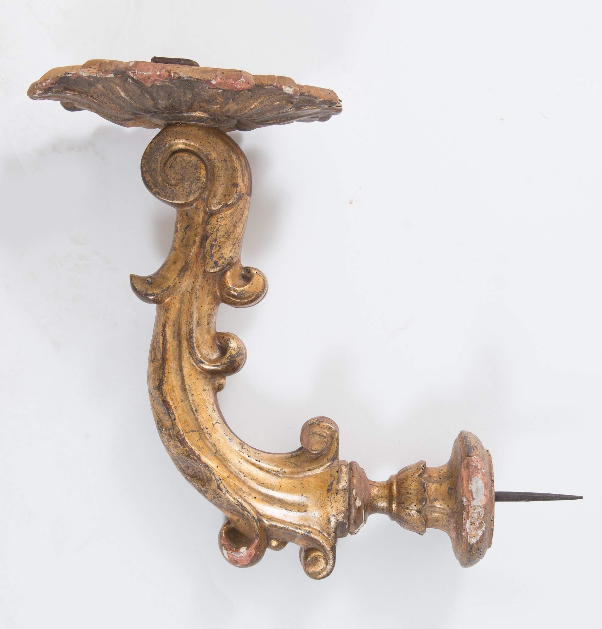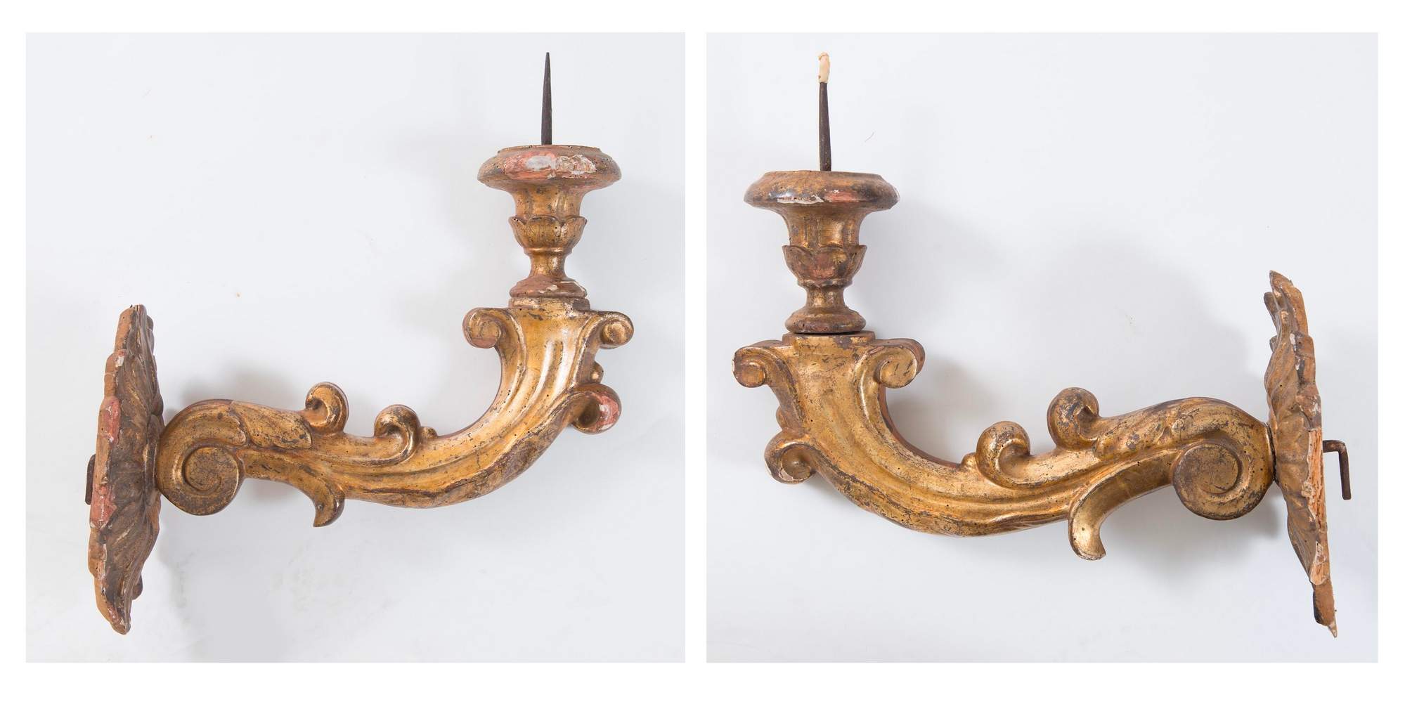 Coppia di bracci portaceri in legno intagliato e dorato a mecca. Italia settentrionale, metà del XVII. Cm 50x48x19. (difetti)