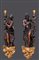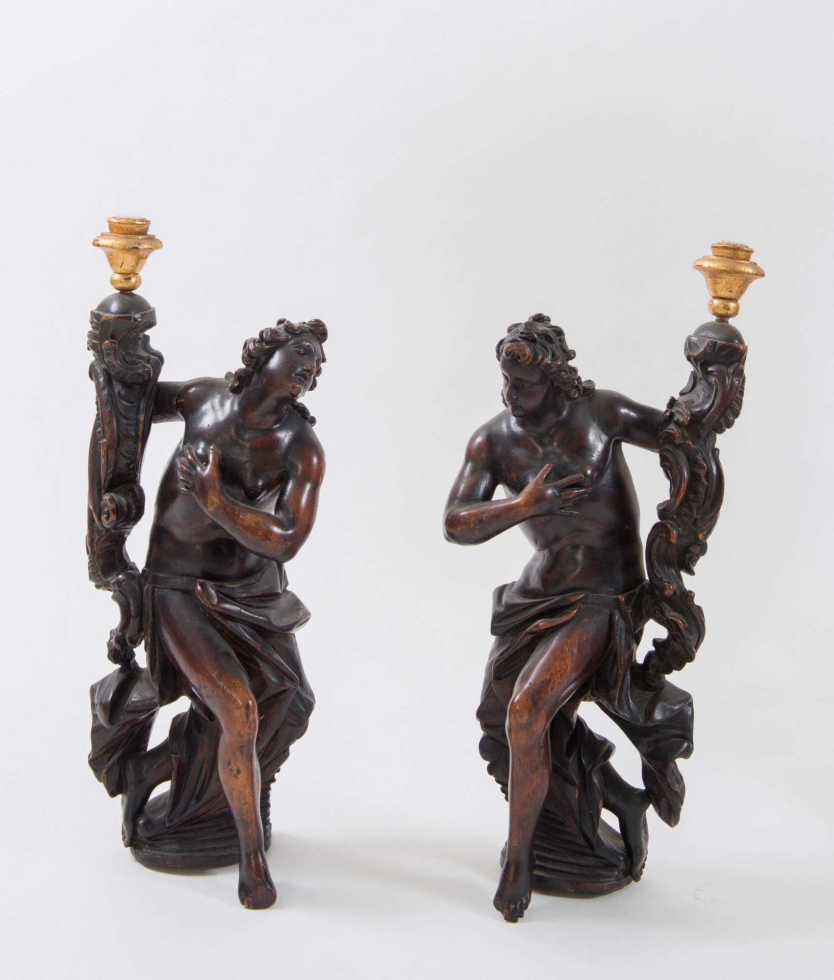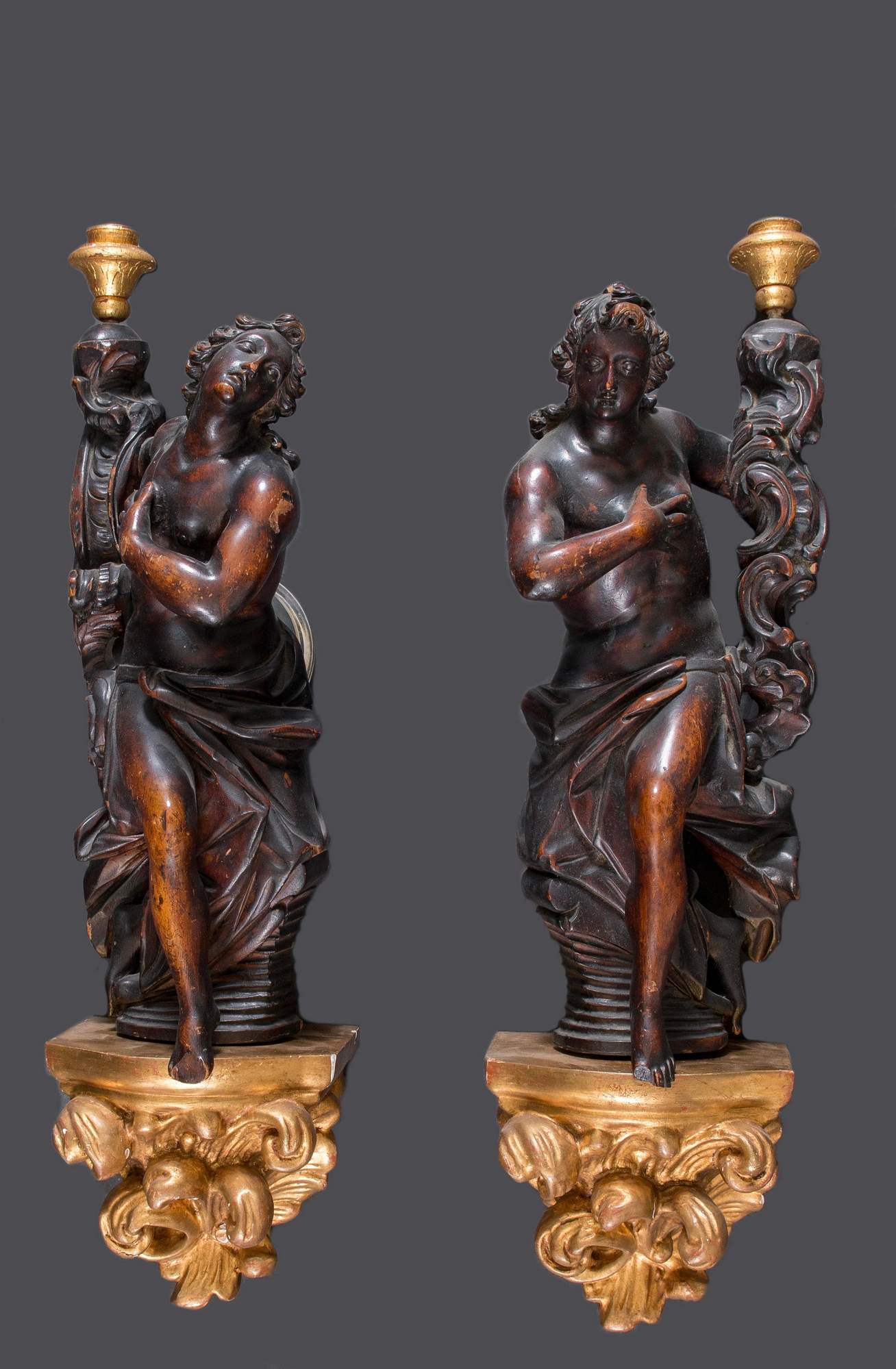 Coppia di statue reggicero, XVIII secolo, realizzate in legno di cirmolo intagliato e patinato. Le statue poggiano su basi, XIX secolo, intagliate e dorate. Cm: 67x23x15. Con base: cm 87x23x16,5. (Difetti)