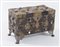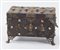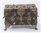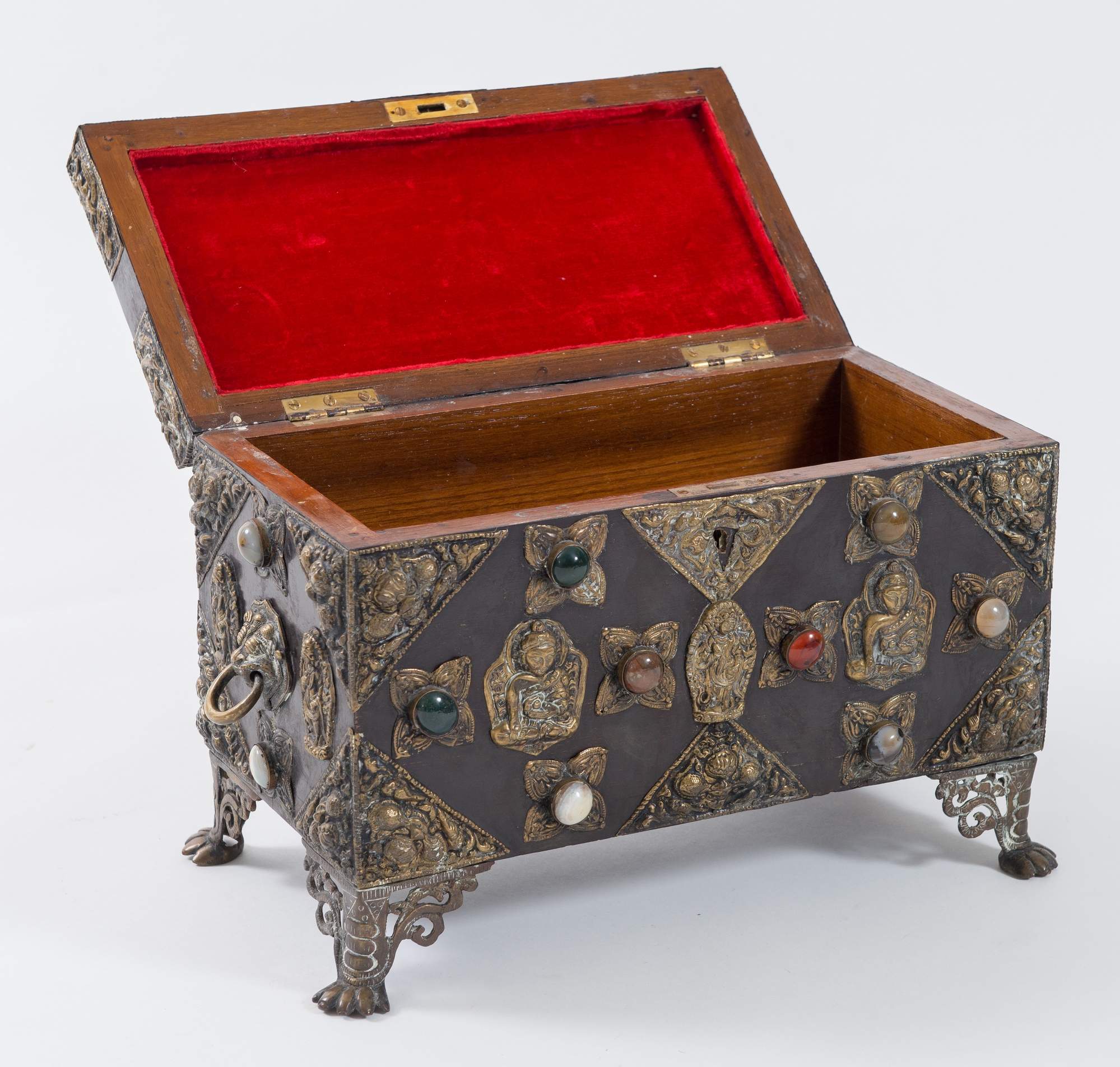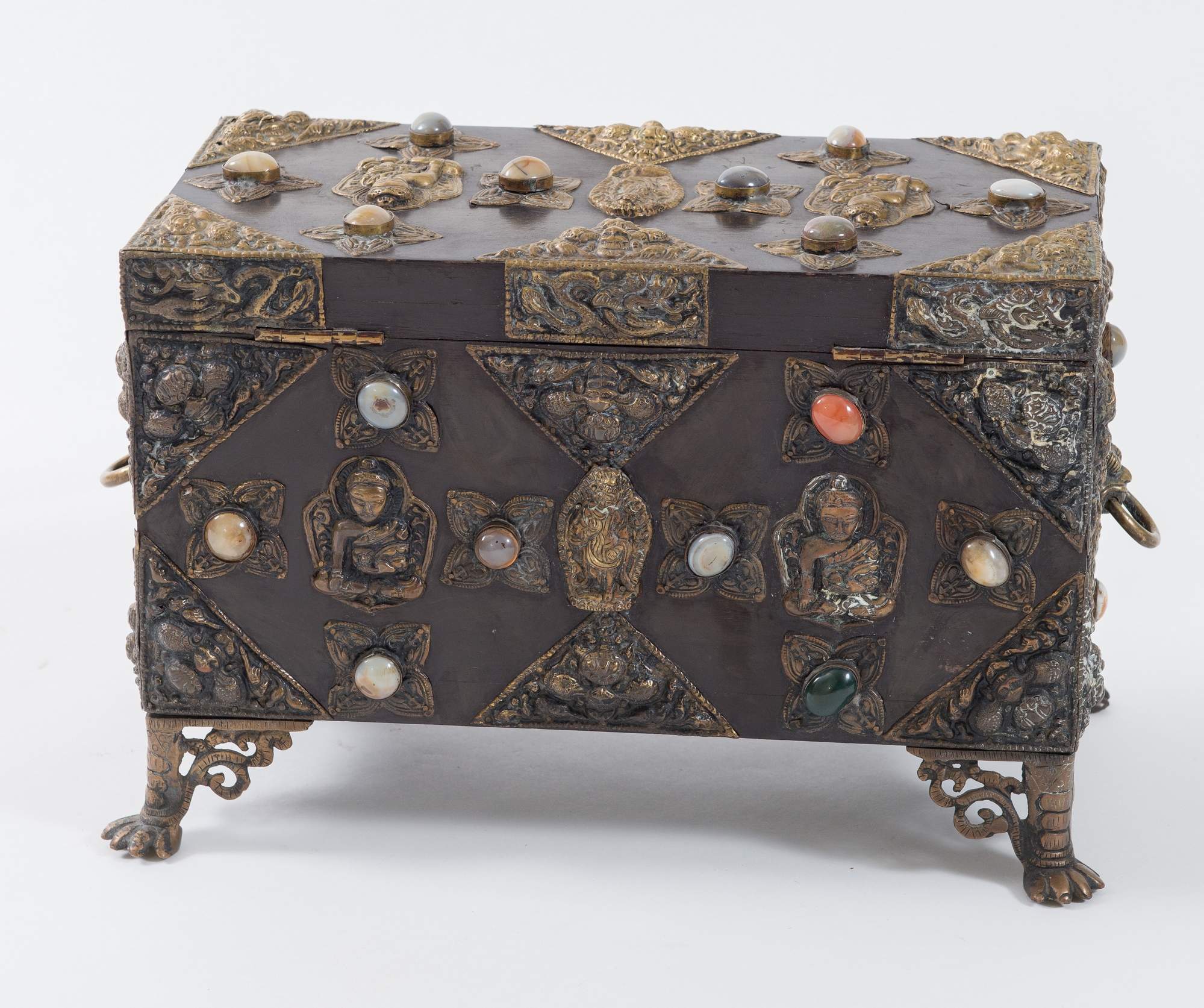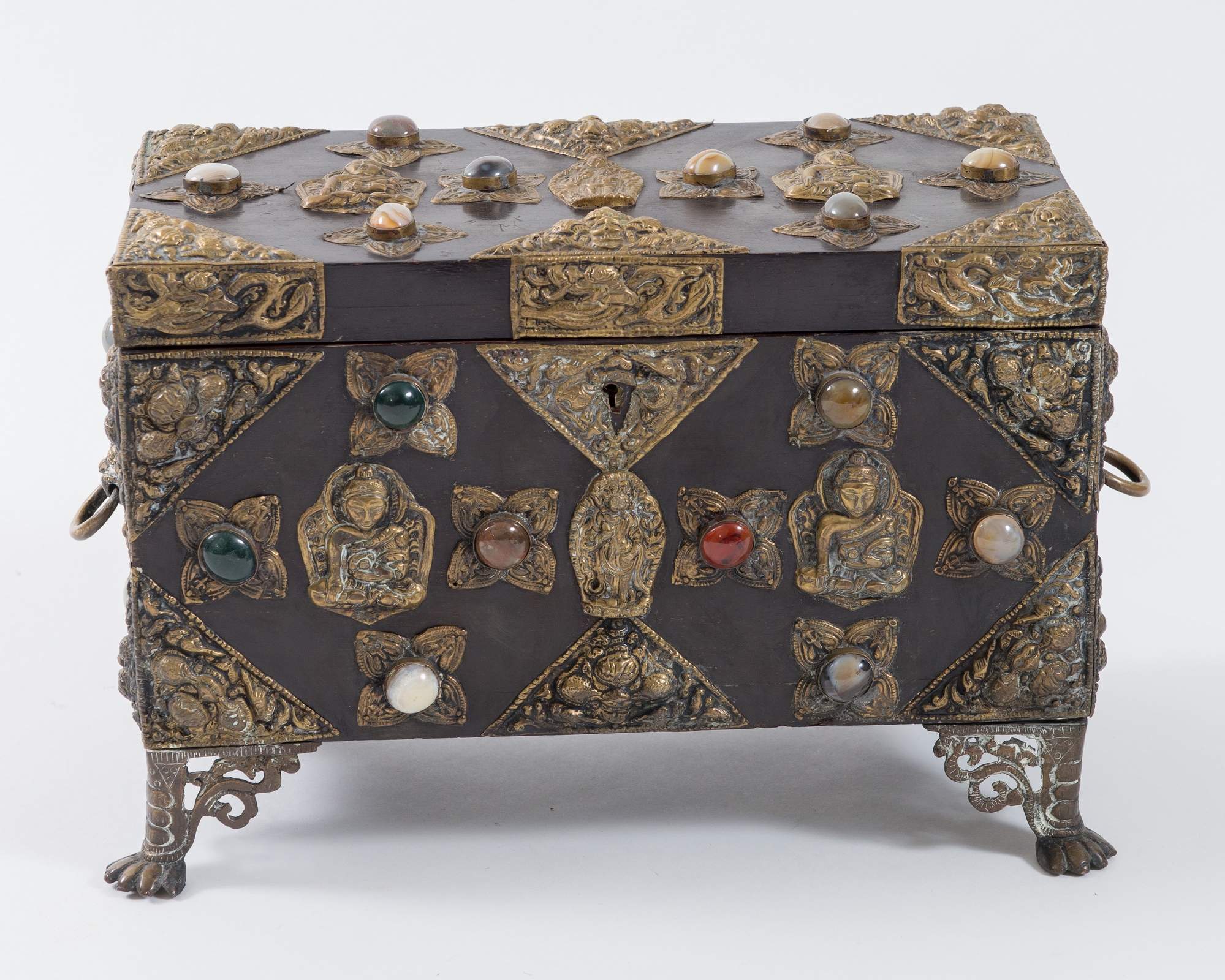 Scatola portagioie. Arte orientale, XX secolo. Realizzata in legno con applicazione in bronzo dorato e pietre dure. Cm 26,4x38,5x20,3.