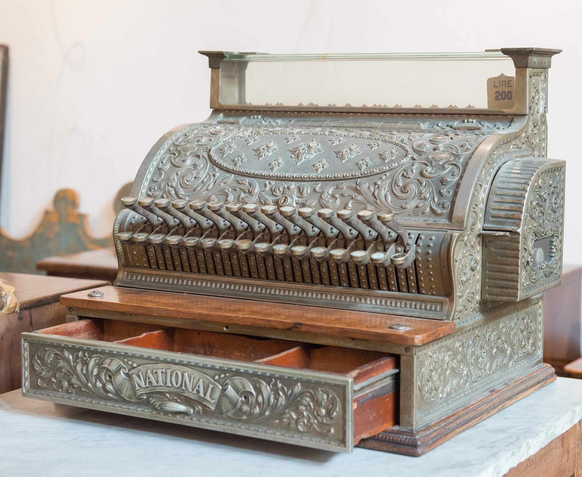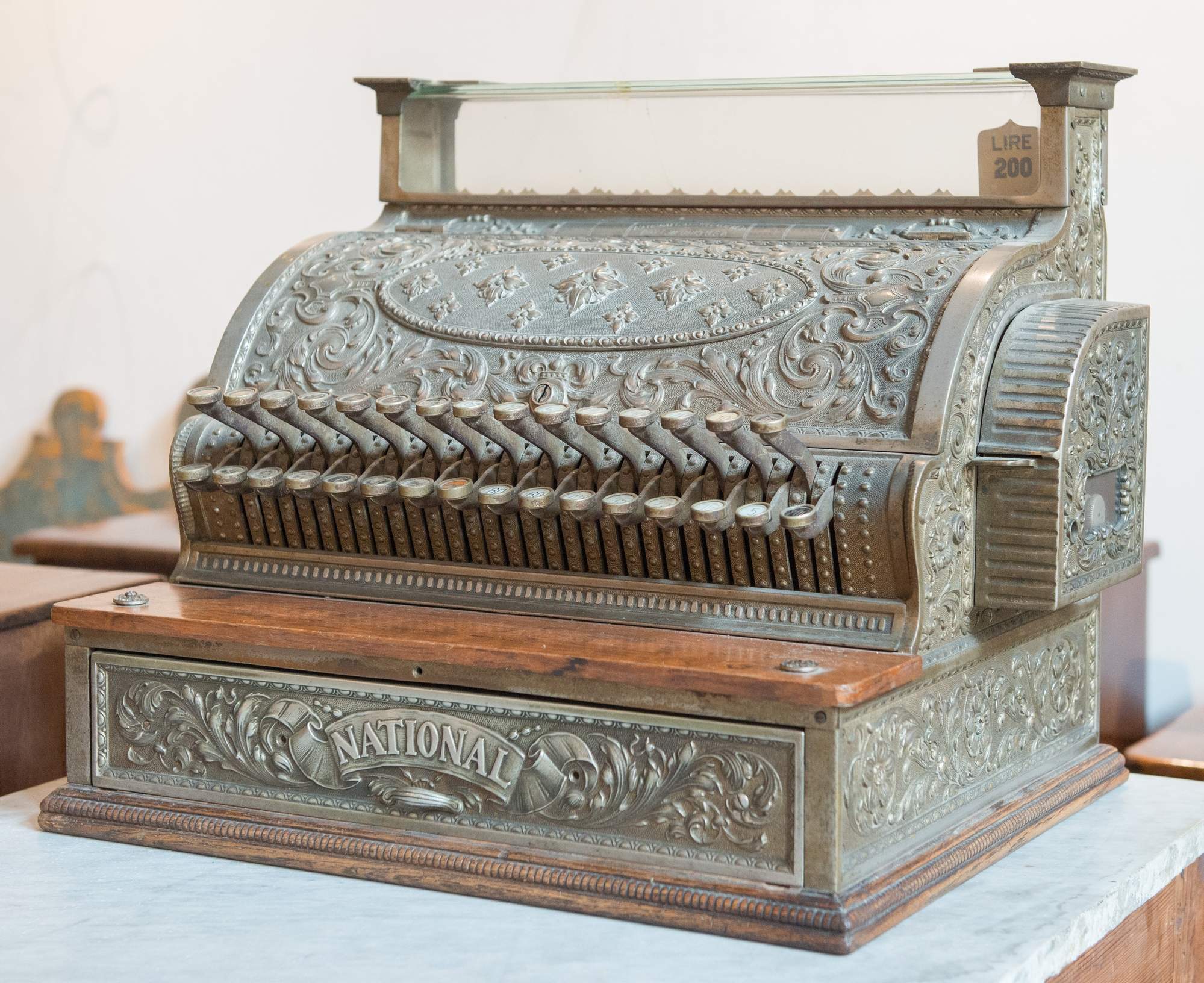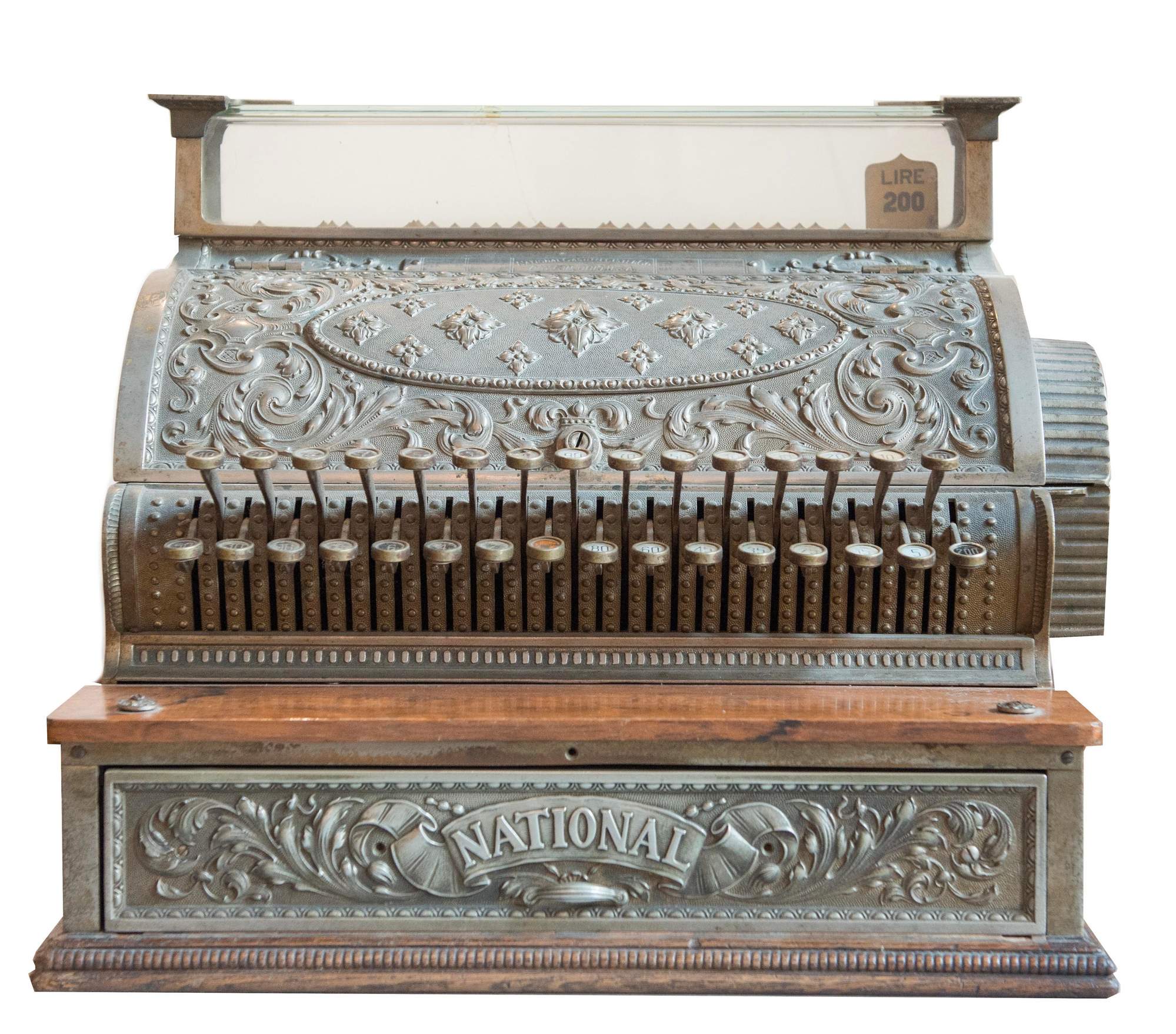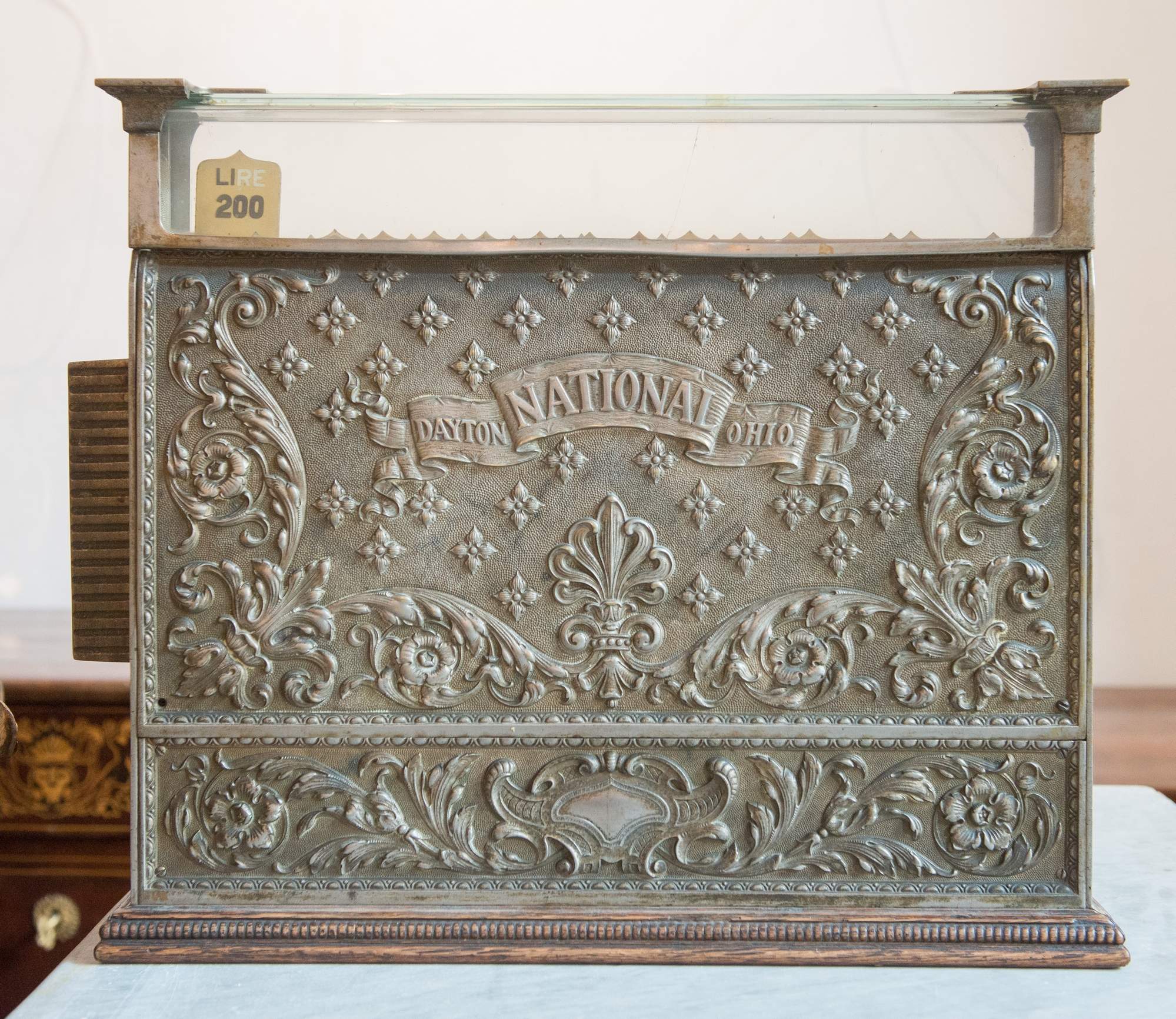 NationalCashRegisterCo. Dayton,Ohio,U.S.A. Registratore di cassa. Fine XIX secolo – inizio XX secolo. Realizzata in ottone nichelato e legno. Funzionante. Cm 43,3x53x41.