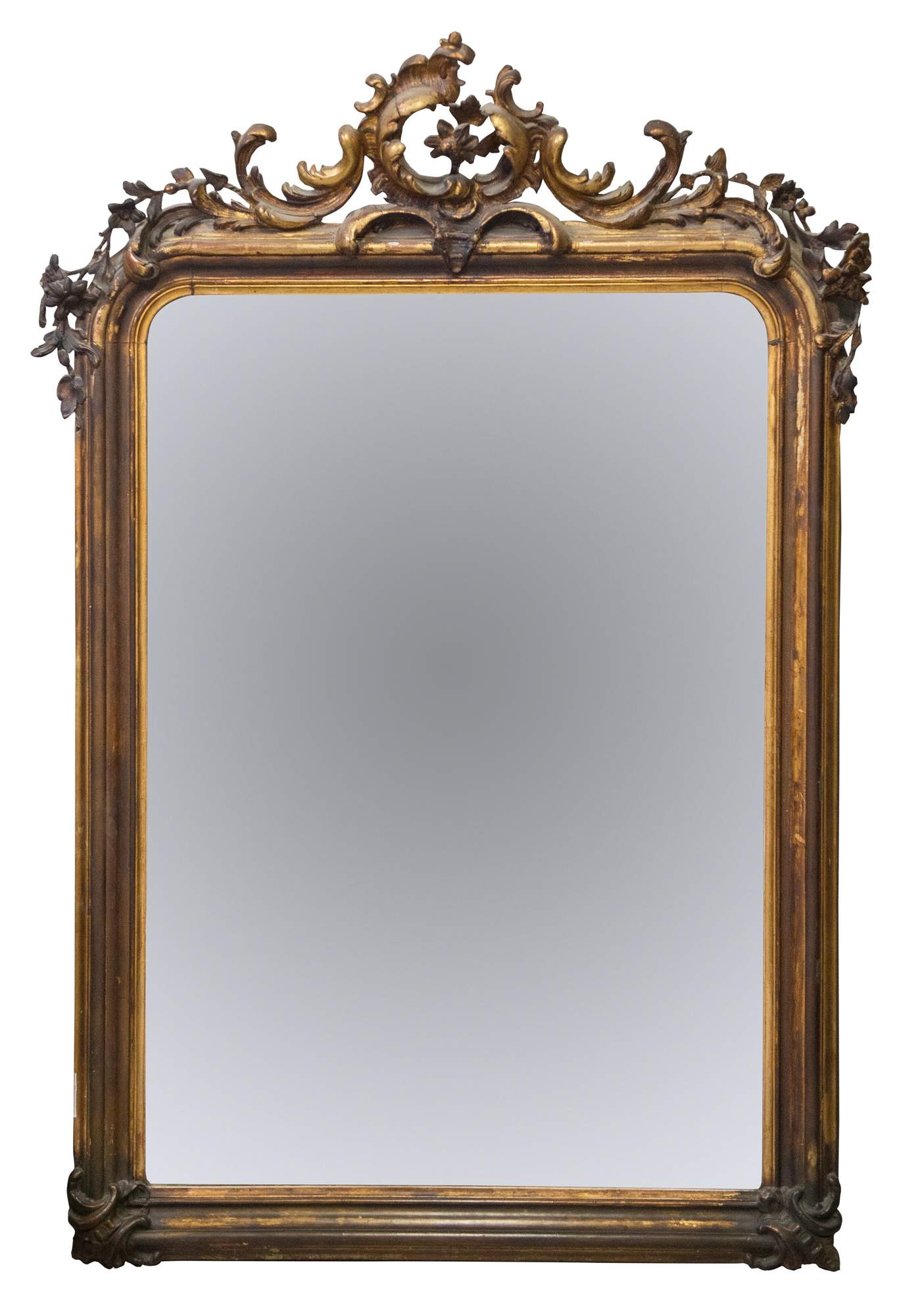 Grande specchiera dorata. Nord Italia, metà del XIX secolo. Cornice moganata a più balze e cimasa a guisa di roccaille e fiori e foglie. Cm 177x118. (lievi difetti)