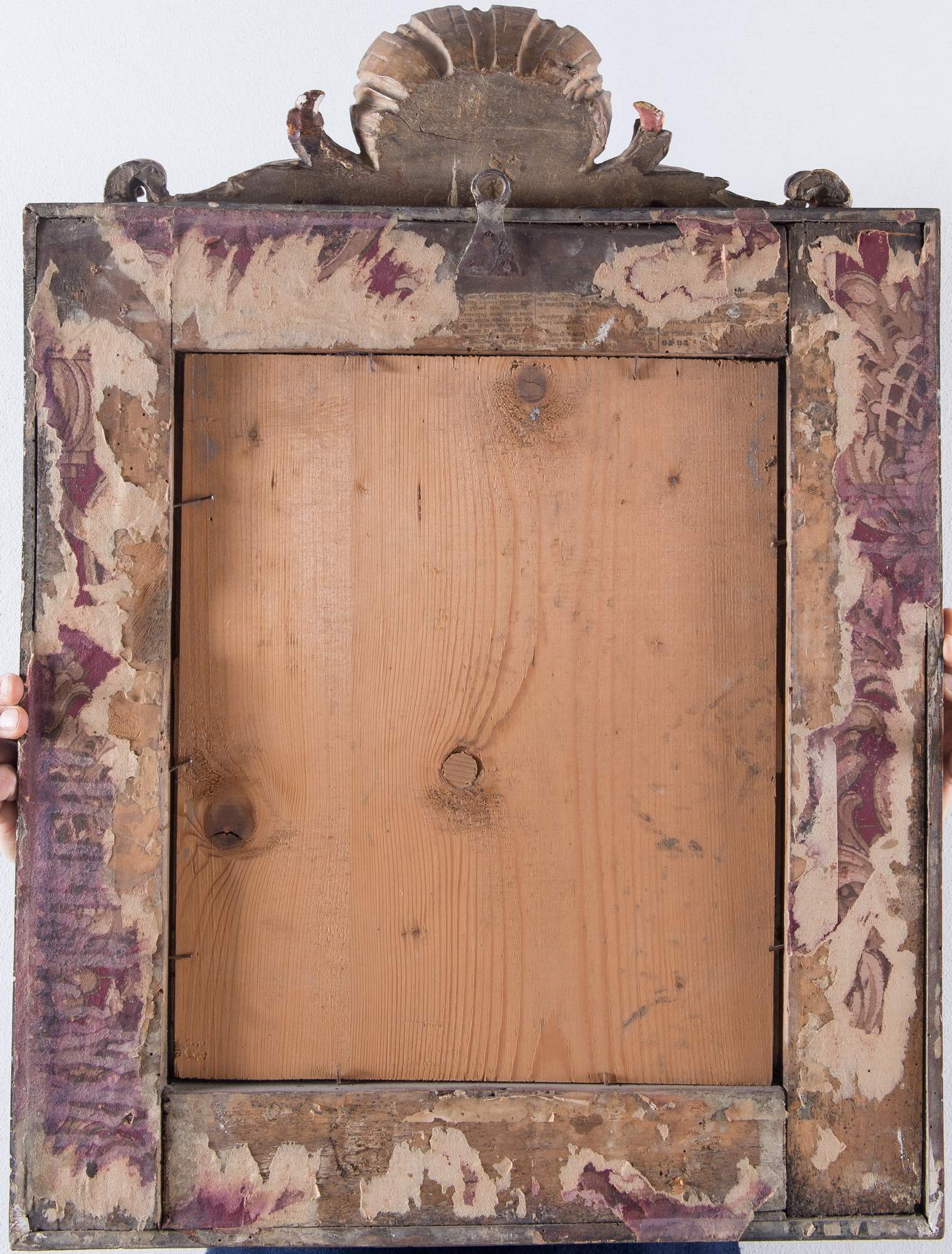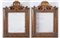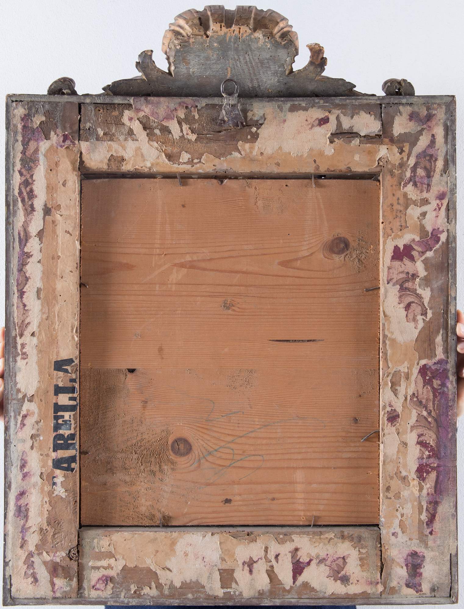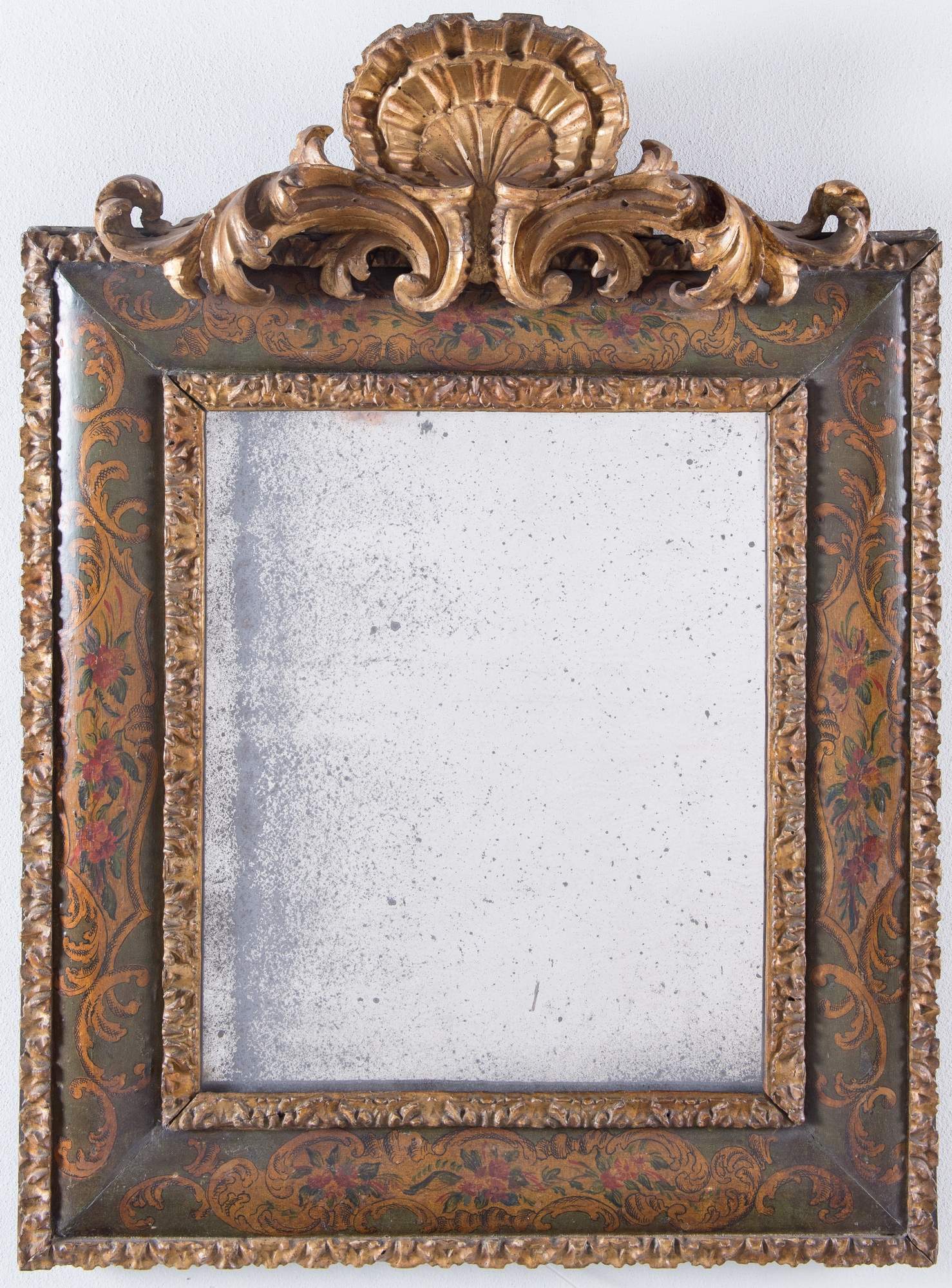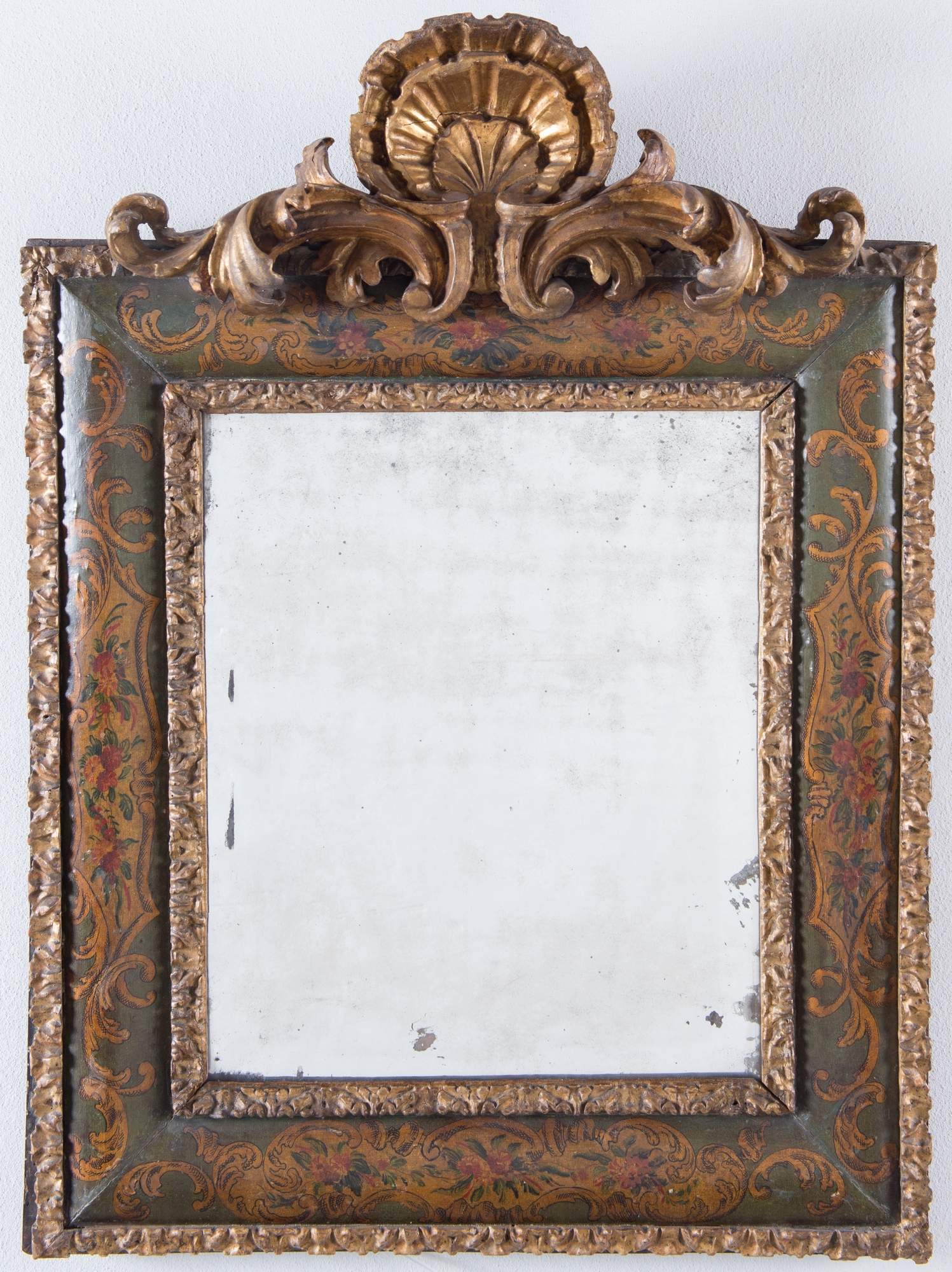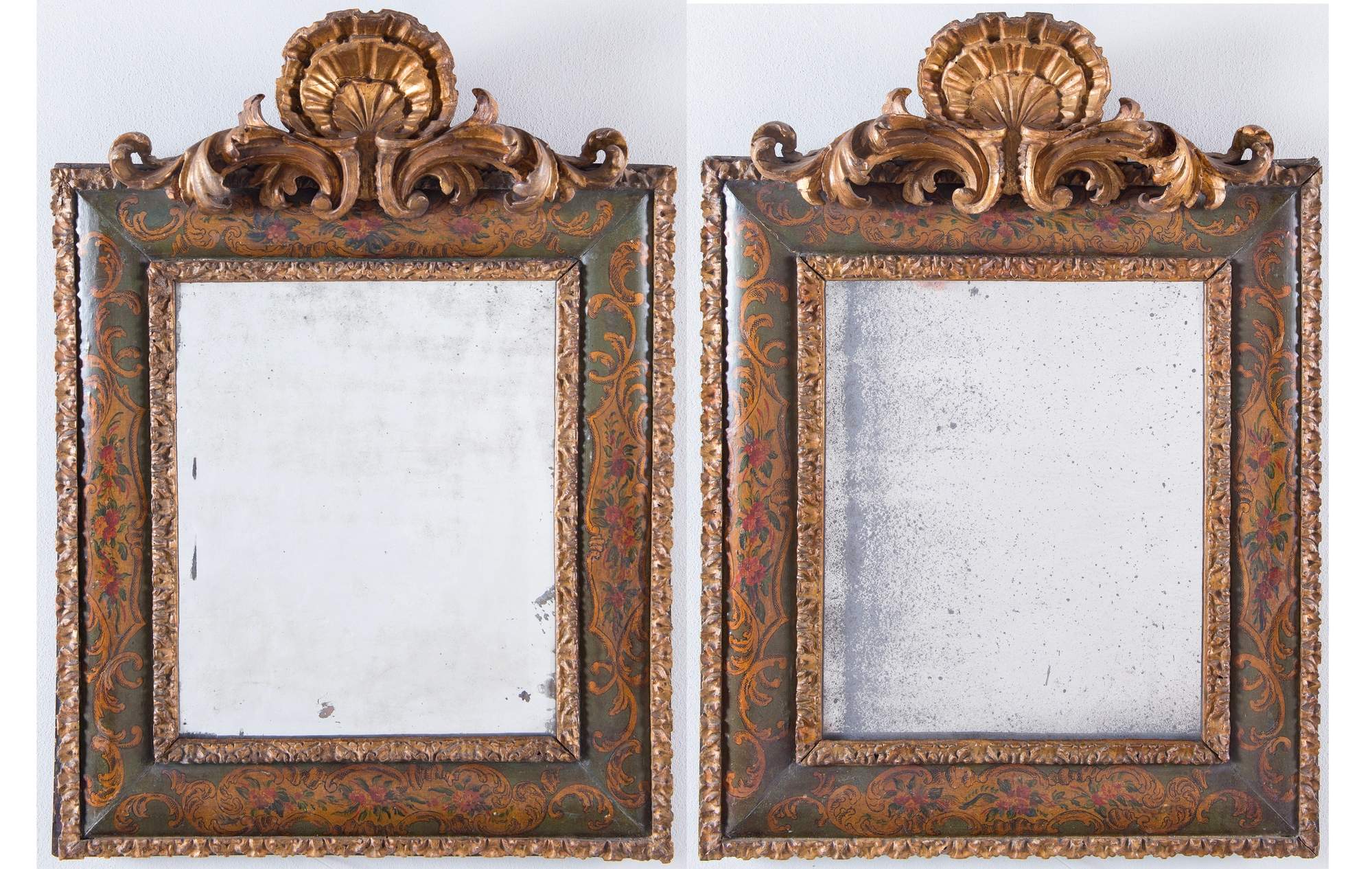 Coppia di specchiere in legno intagliato dorato e laccato. Area veneta/marchigliana, metà del XVIII secolo. Le due specchiere si contraddistinguono per profilature dorate e intagliate a guisa di foglie d’acanto. La parte centrale bombata laccata nei toni del verde e del giallo, con campiture fiorate. Recano una piccola cimasa intagliata con una conchiglia centrale e volute di foglie che degradano lateralmente. Cm 75,5x56x5. (lievi difetti)