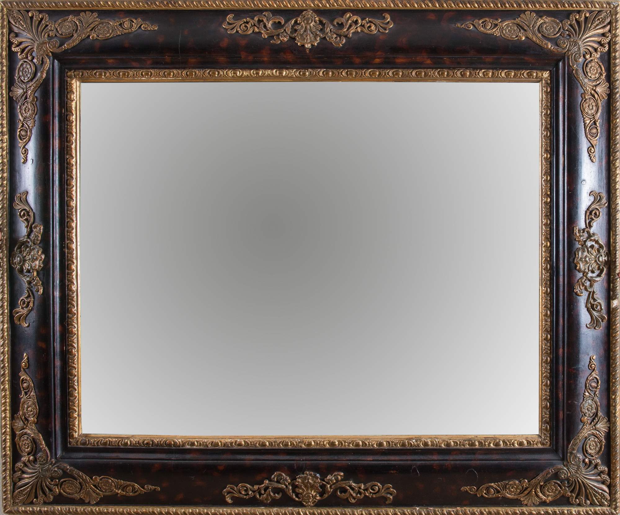 Specchiera dorata e laccata in finta tartaruga. Fine del XIX secolo. Reca eleganti motivi a palmette negli angoli che degradano in rosoni e volute. Cm 93x113. (lievi difetti)