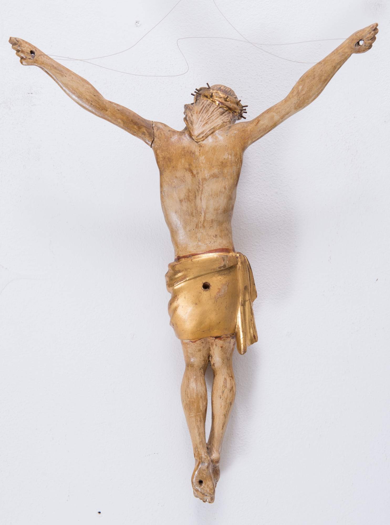 Antico Cristo in legno. Intagliato, dorato e laccato. Cm 44x31.