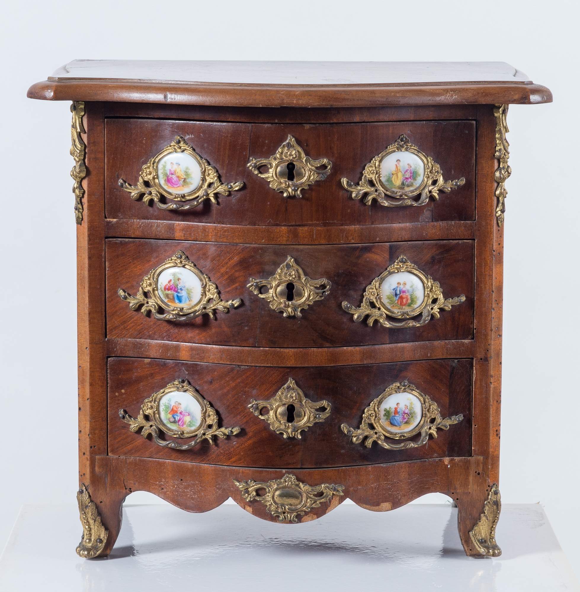Modellino di cassettone in stile Luigi XV. Francia, fine del XIX - inizi del XX secolo. Impiallacciato in mogano con applicazionei in bronzo dorato e lacchette di porcellata inserite nella maniglie con miniature di Sevres. Cm 32,5x35x24,7.