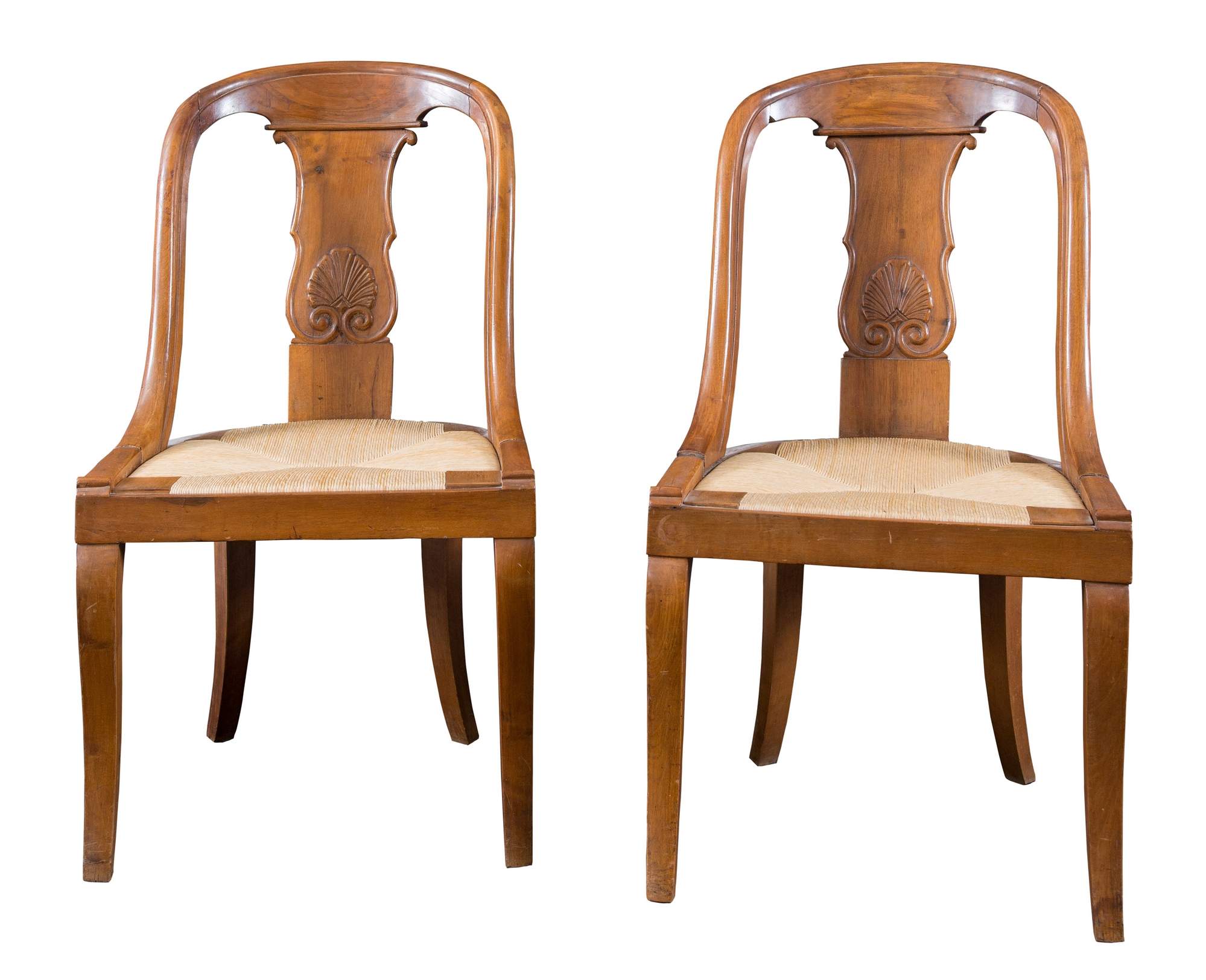 Coppia di SEGGIOLE A GONDOLA. Lombardia, prima metà del XIX secolo. Realizzate in massello di noce. Presentano la seduta in paglia intrecciata. H. cm 87. (difetti)