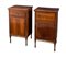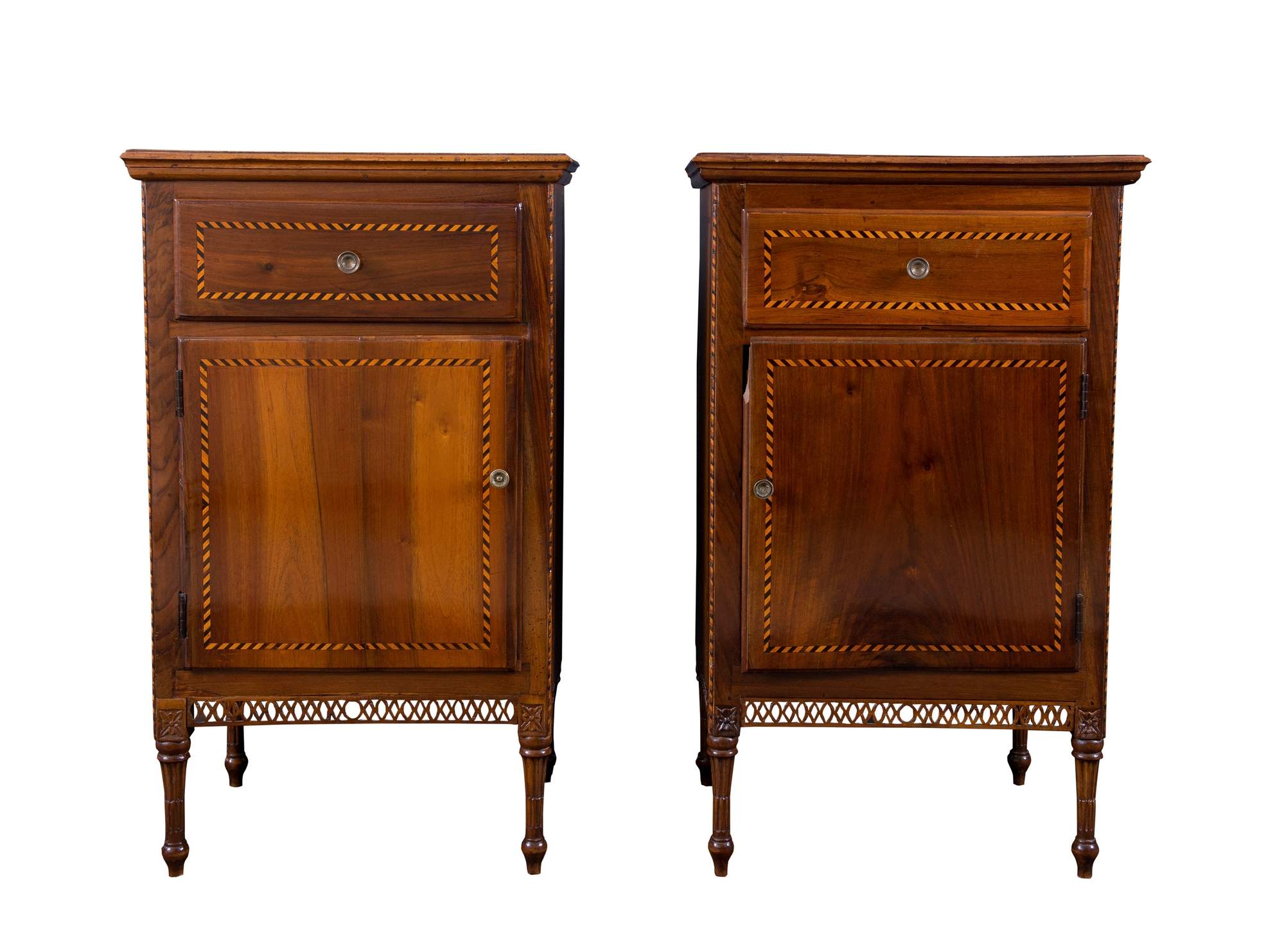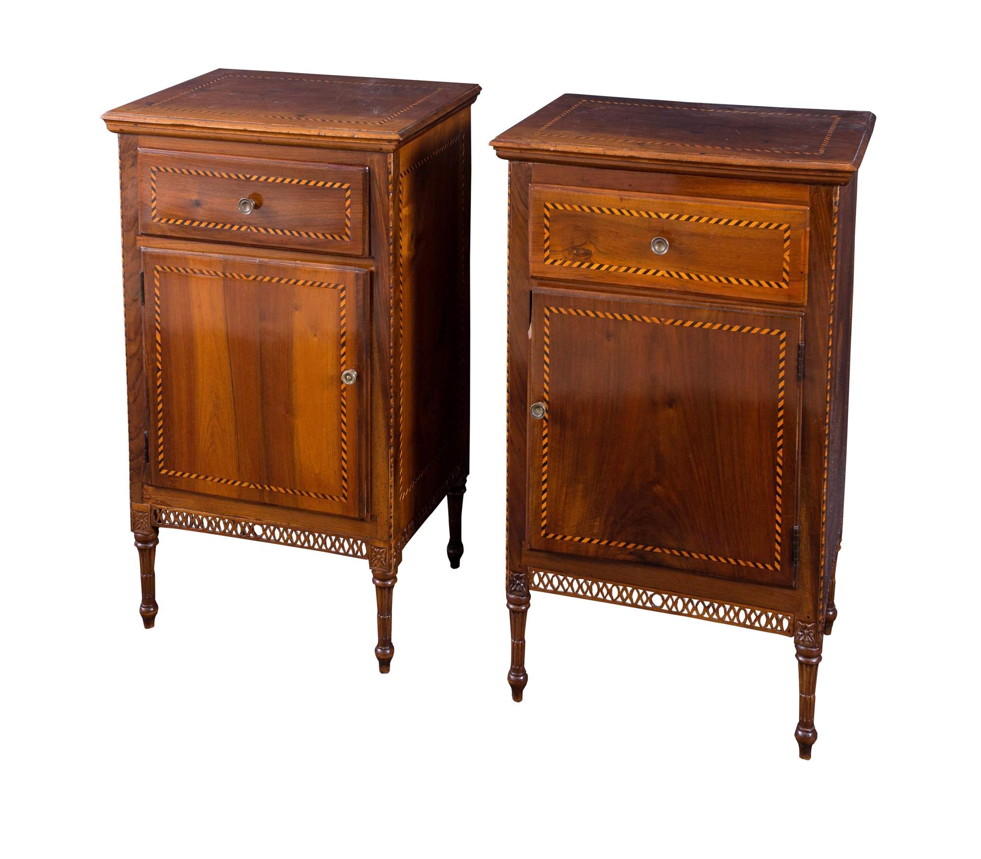 COPPIA DI COMODINI in noce, filettati in ebano e acero. Veneto, fine del XVIII secolo – inizi del XIX secolo. Piedi torniti e rosette alla base e grembiala traforata. Cm 85x52x39,5. (difetti)