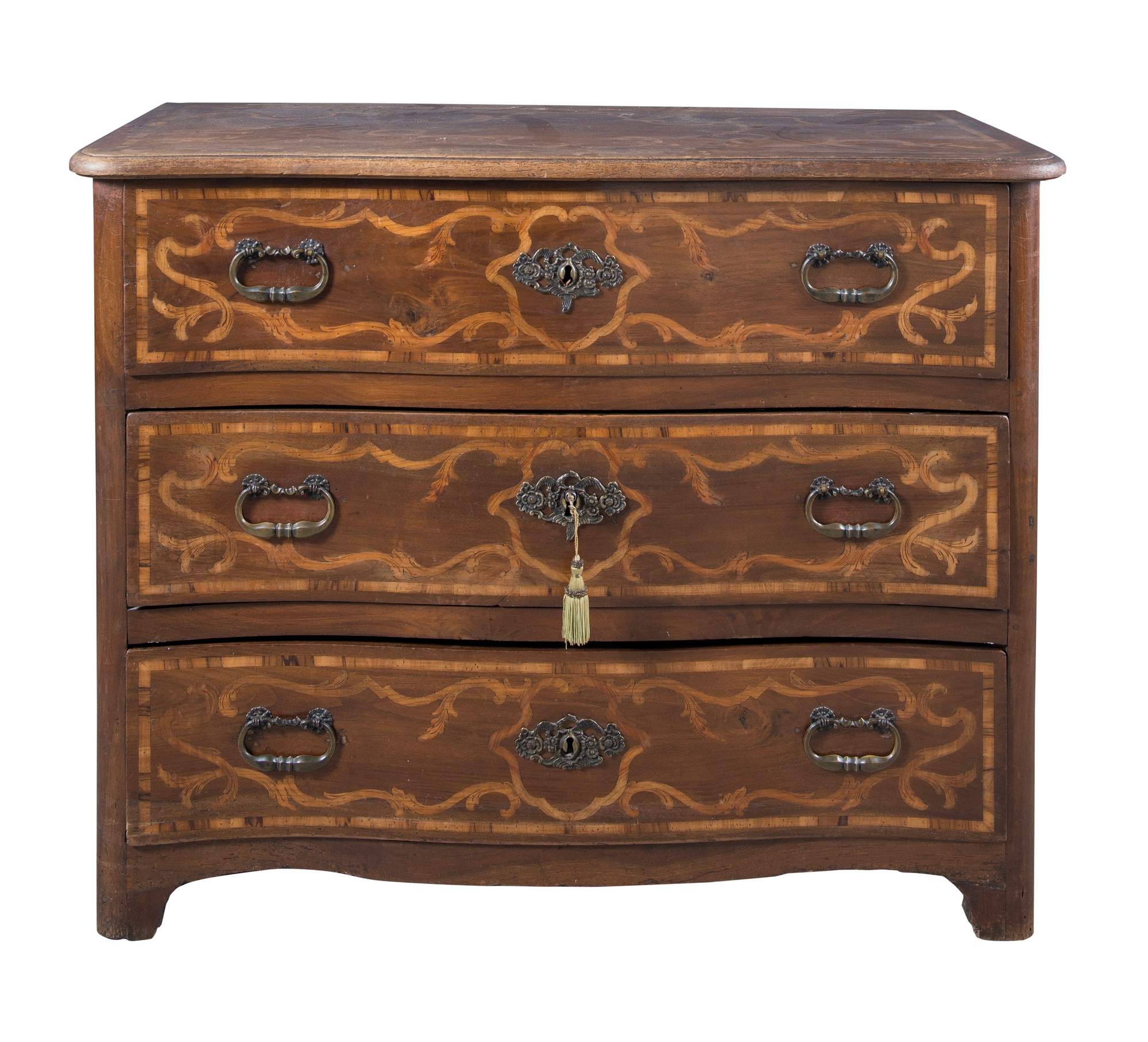 CASSETTONE. Piemonte, metà del XVIII secolo. Realizzato in massello di noce, intarsiato in ulivo e acero. Fronte leggermente mosso con piedi a mensola e piano con becco di civetta. Cm 100x120x56. (leggeri difetti dovuti all’usura e al tempo)