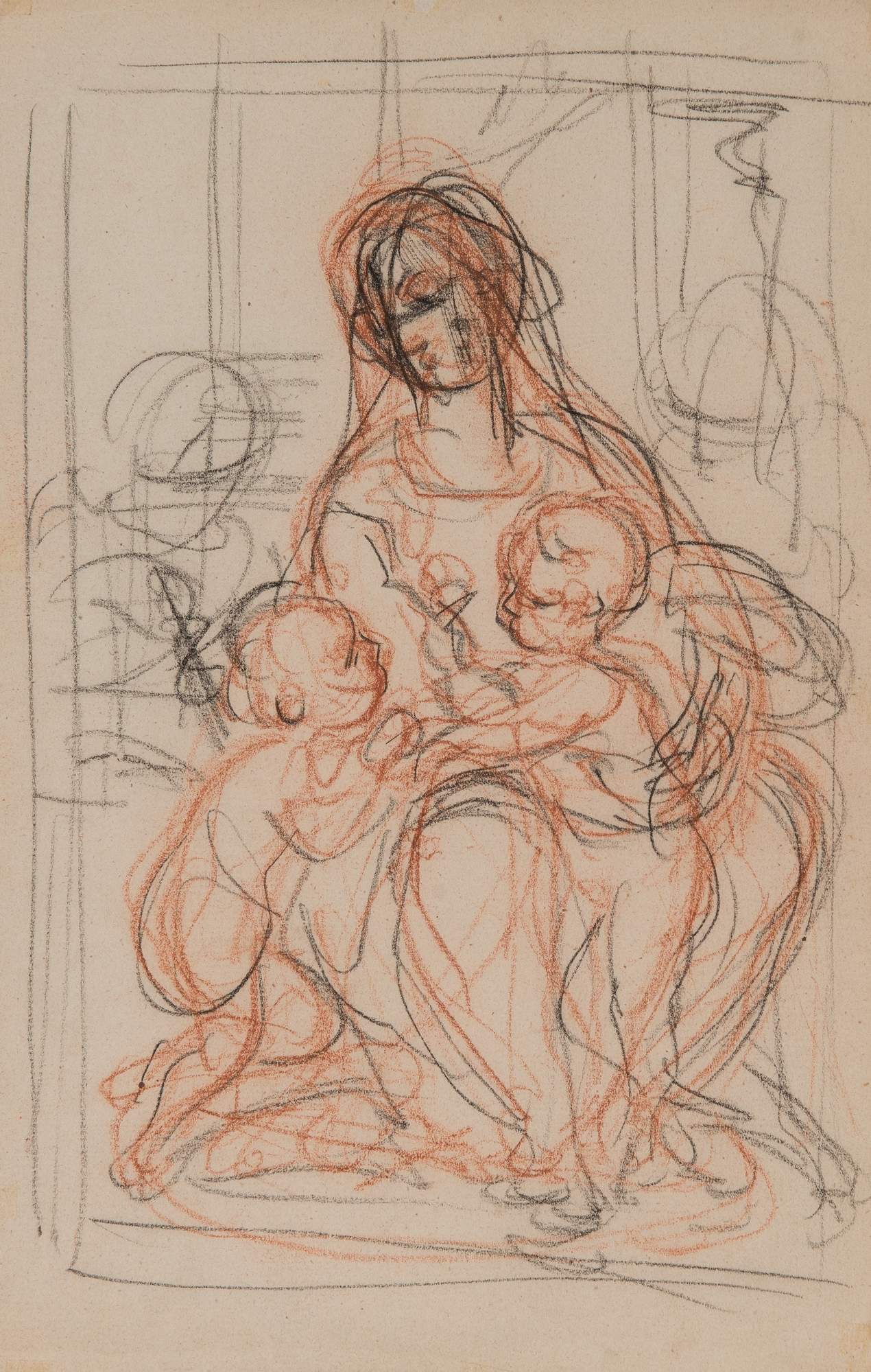 Anonimo bolognese dell’inizio del XVIII secolo. “Madonna col bambino e S. Giovannino”. Sanguigna e carboncino su carta. Cm 34,5x22.