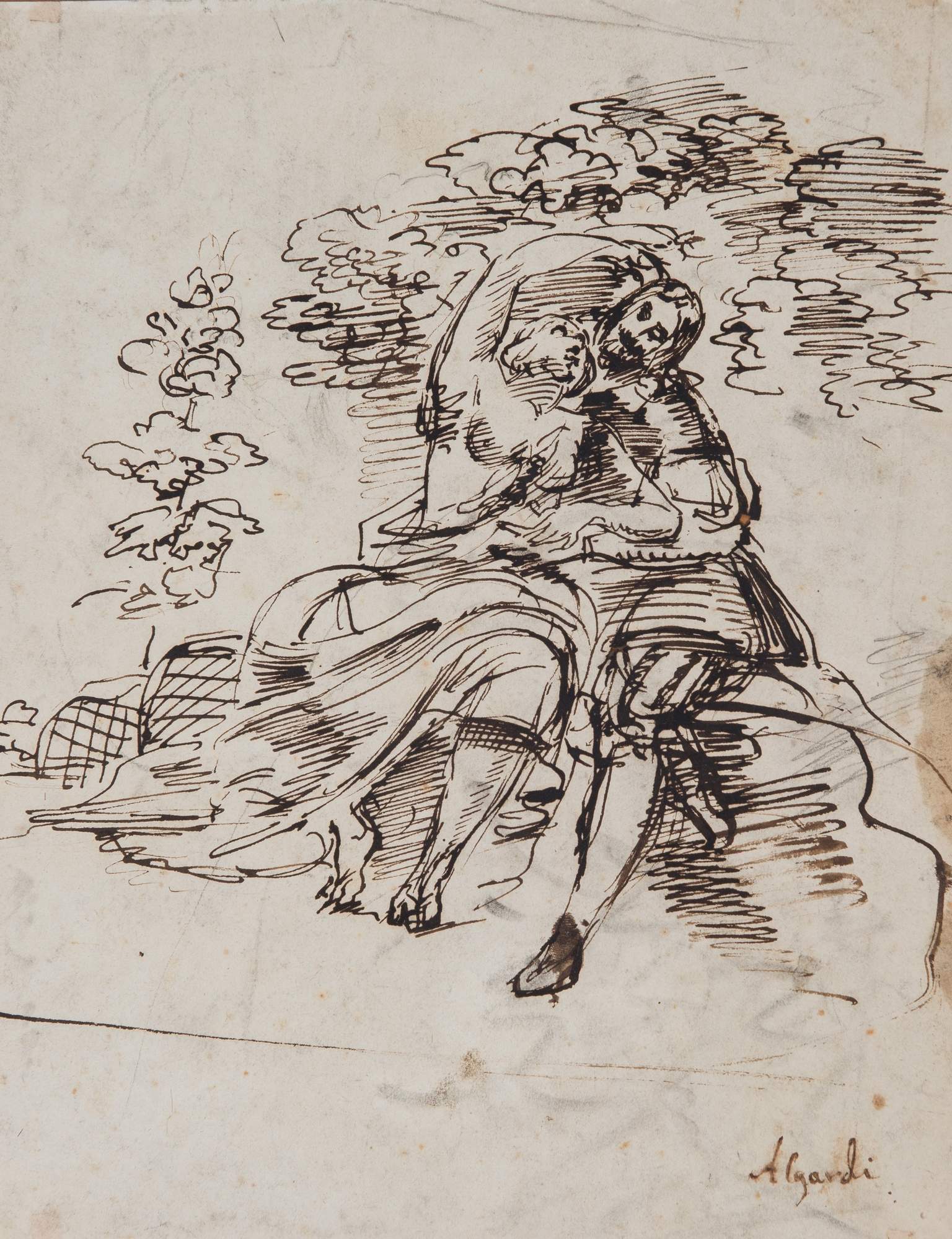 ALESSANDRO ALGARDI (1598 -1654), attr. “Scena galante”. China su carta. Cm 30x23,5. Opera firmata in basso a destra Algardi. Opera pubblicata sul catalogo della mostra "Disegni bolognesi dal XVI al XVIII secolo", Firenze, 1973, tav. 60, pag. 83.